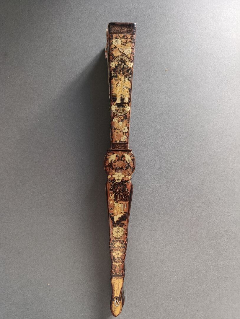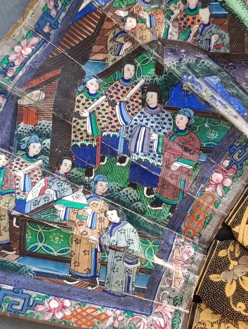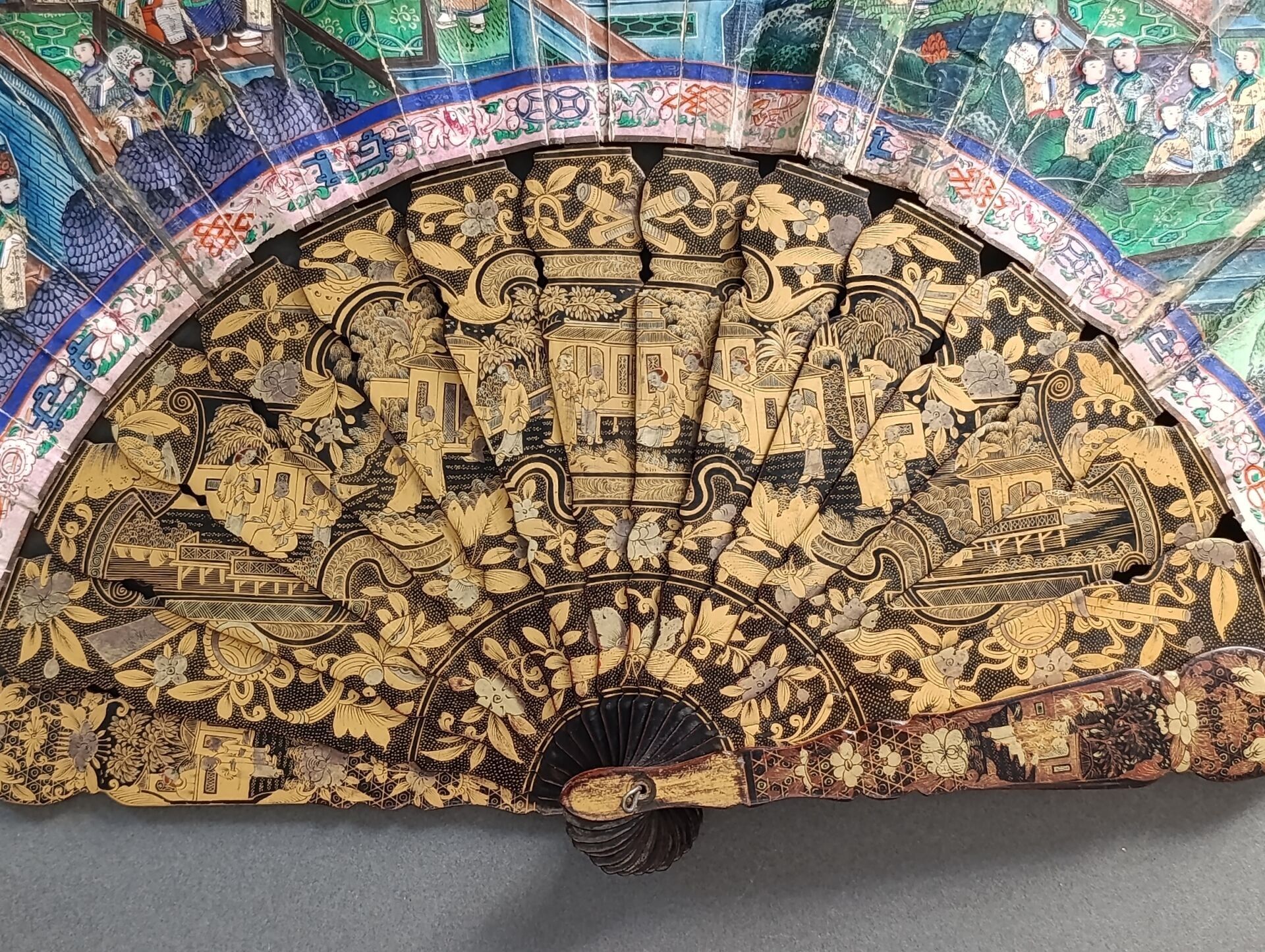 Folded fan, the double sheet of paper painted on both sides with 50 figures whose heads and silk garments are in relief.