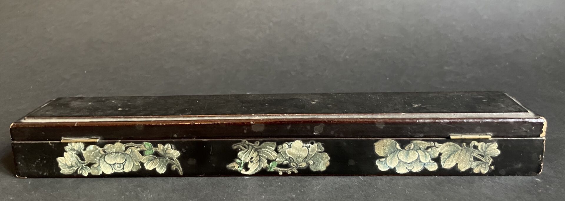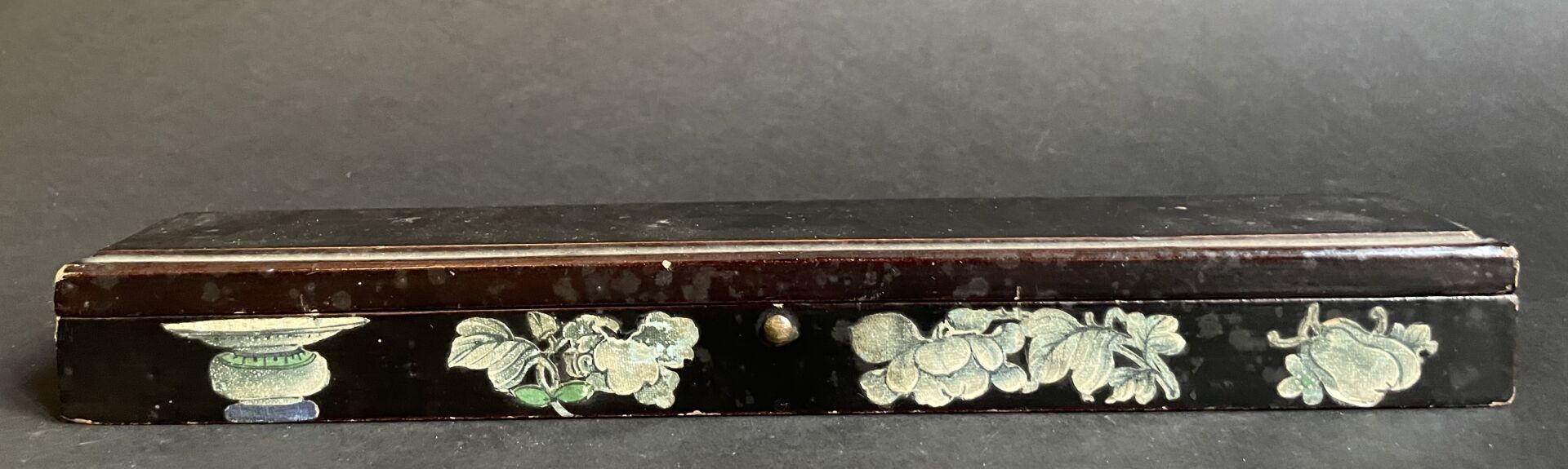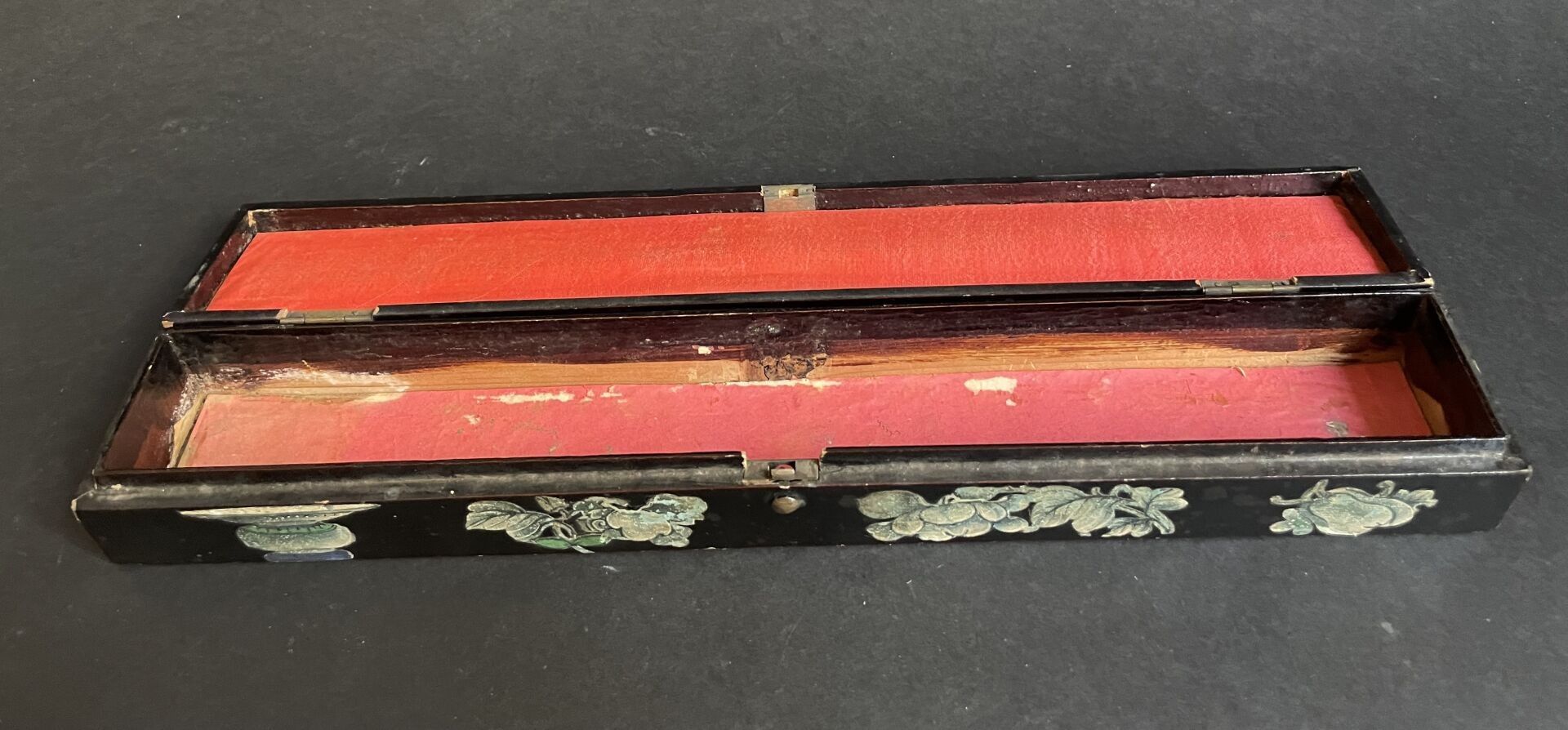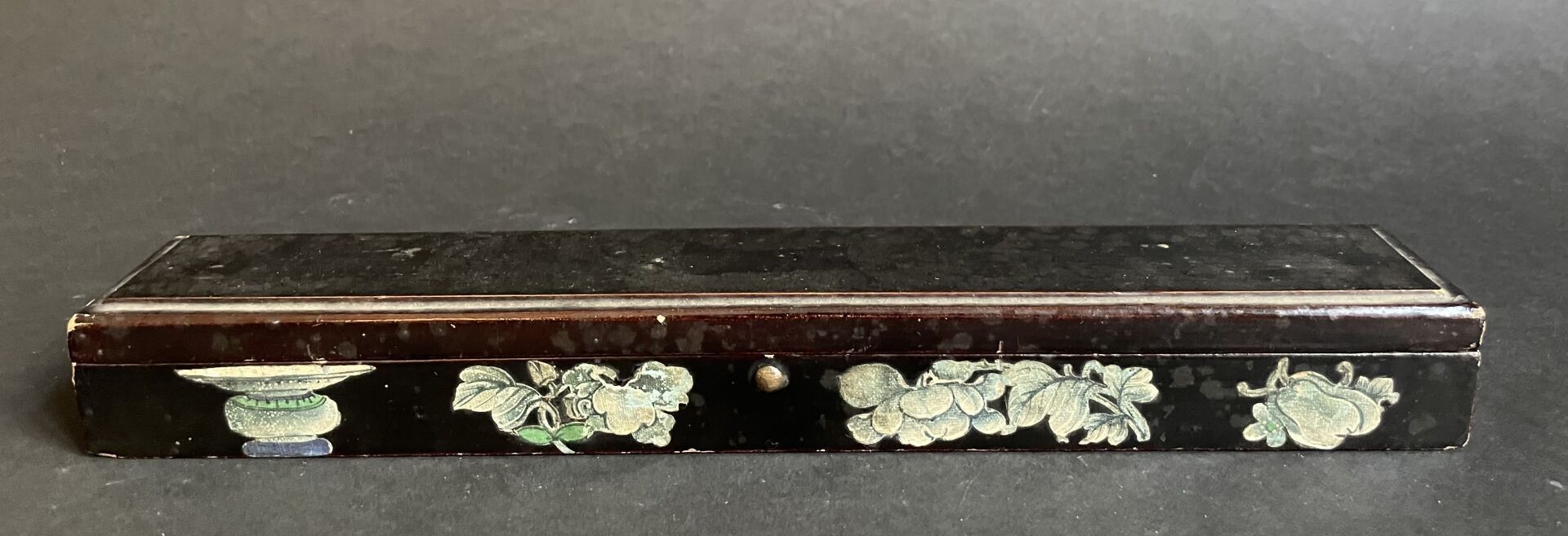 A black lacquered bamboo fan box decorated with applied silk flowers.
