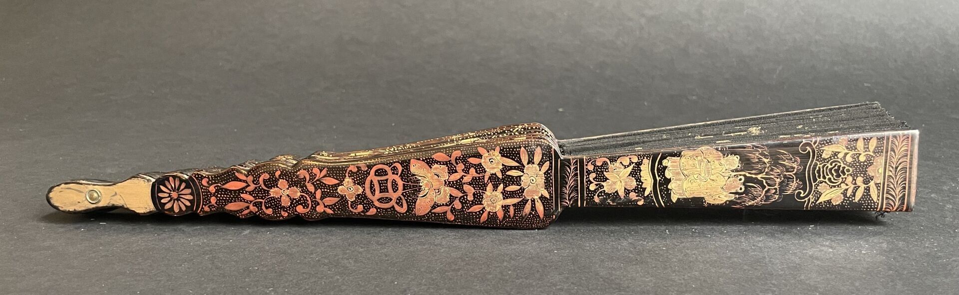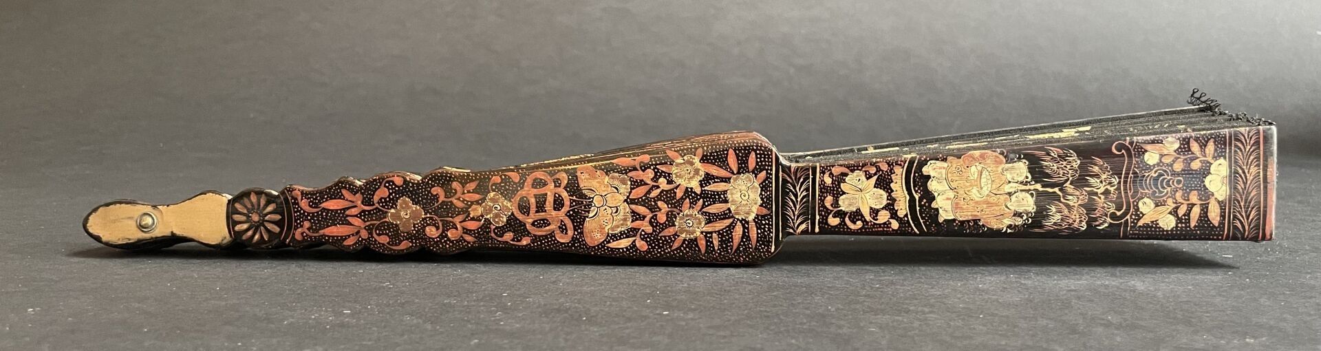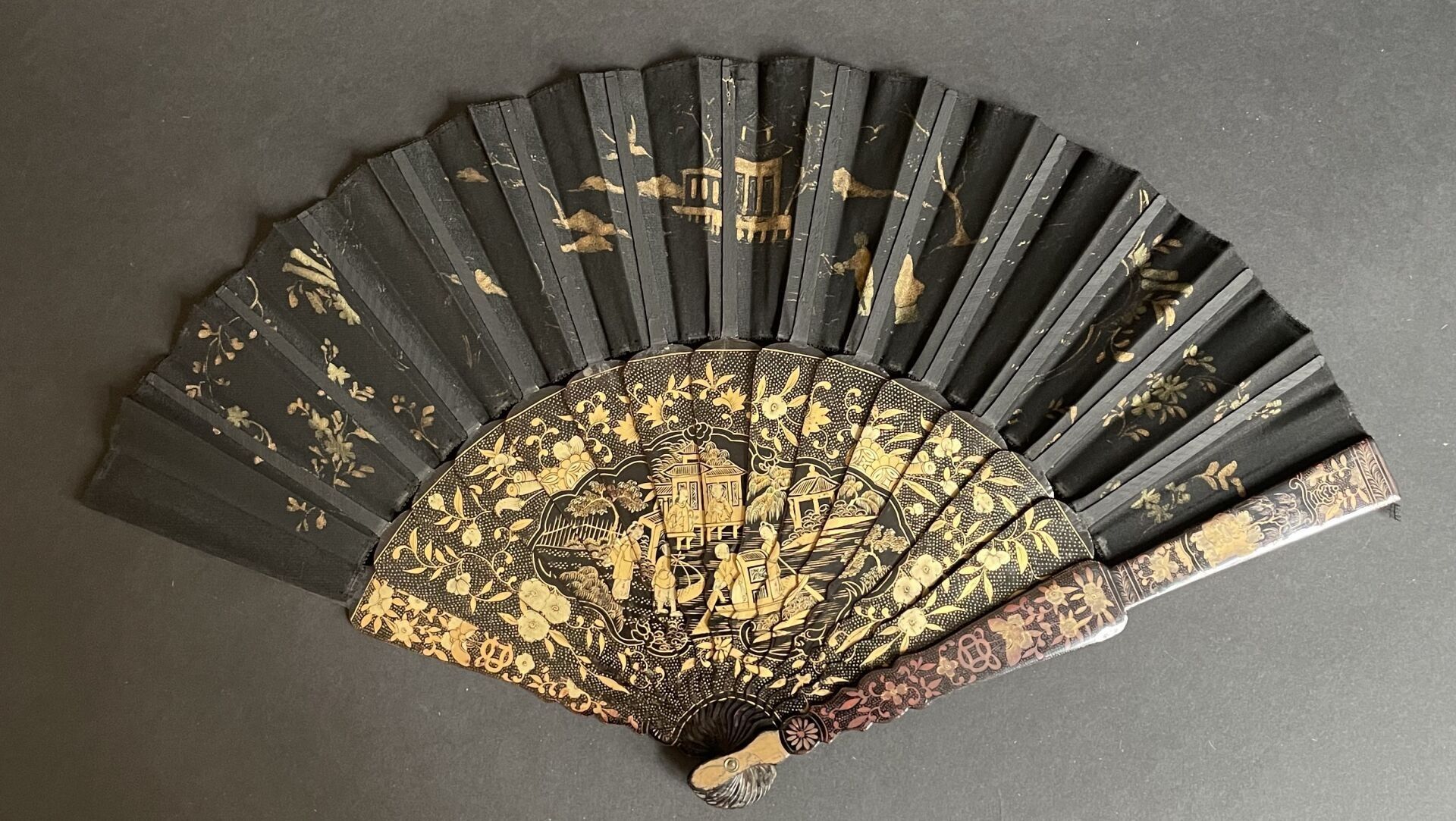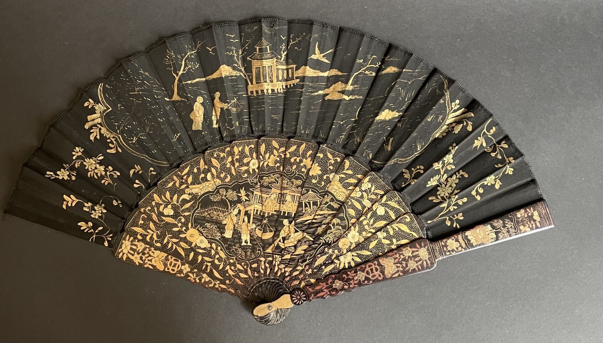 Folded fan, the black silk leaf painted in gilt with a scene in the Chinese style.