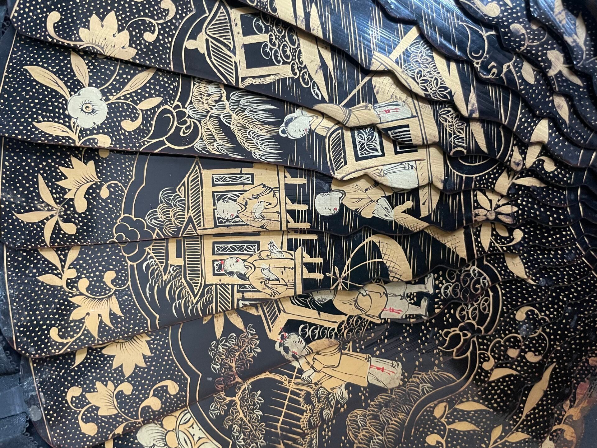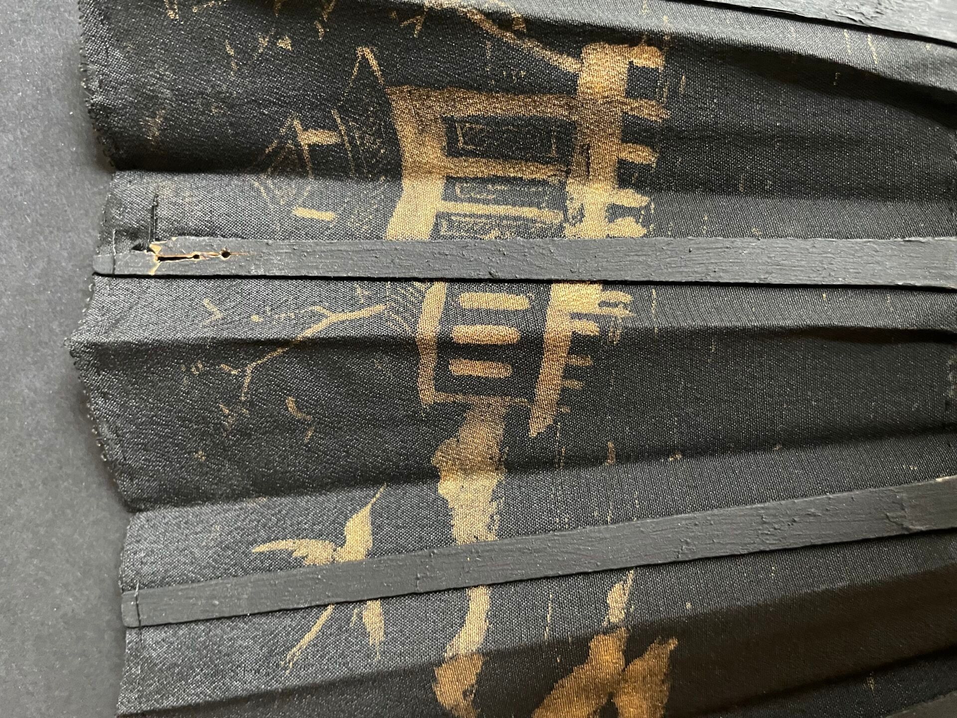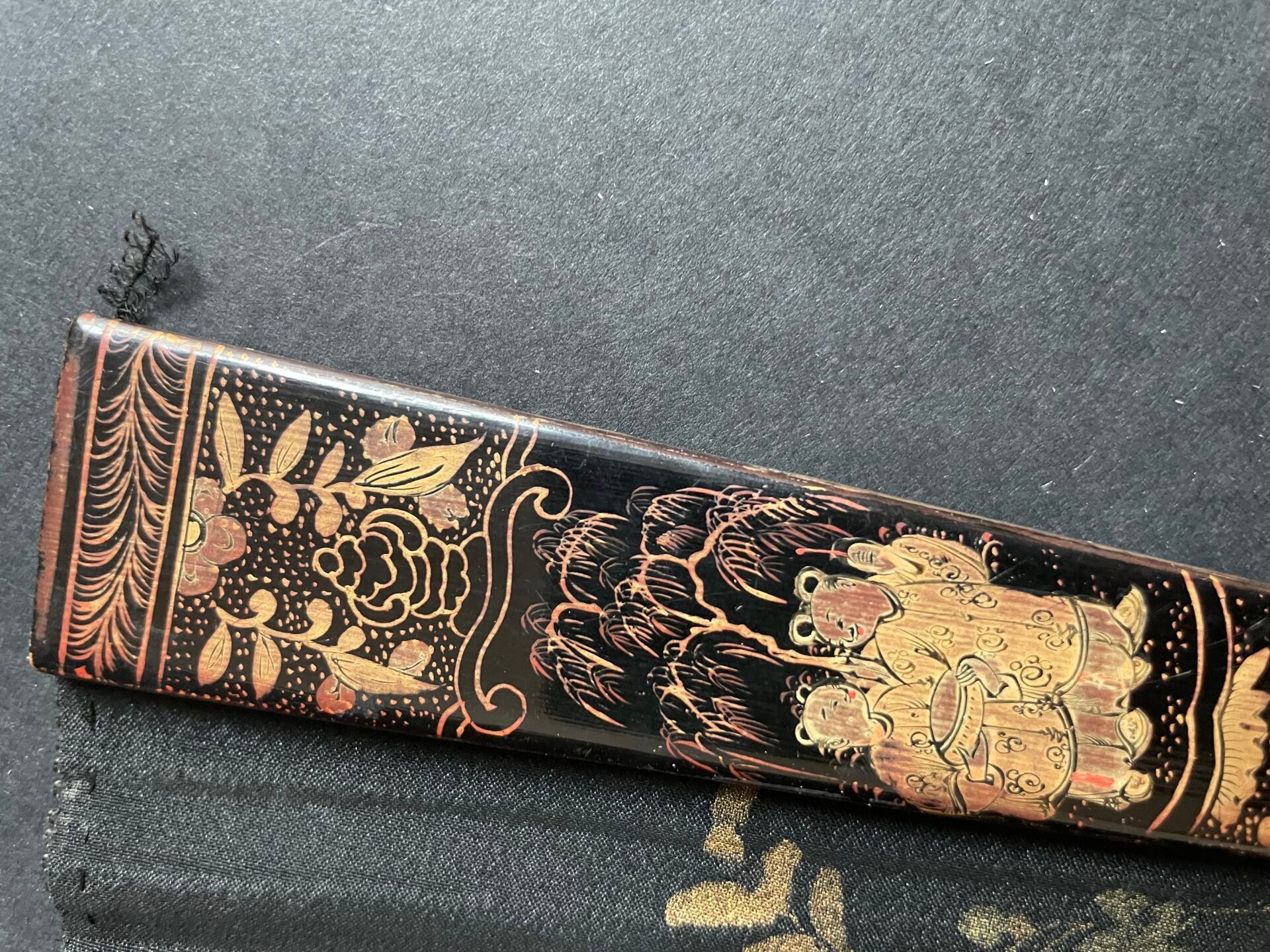Folded fan, the black silk leaf painted in gilt with a scene in the Chinese style.