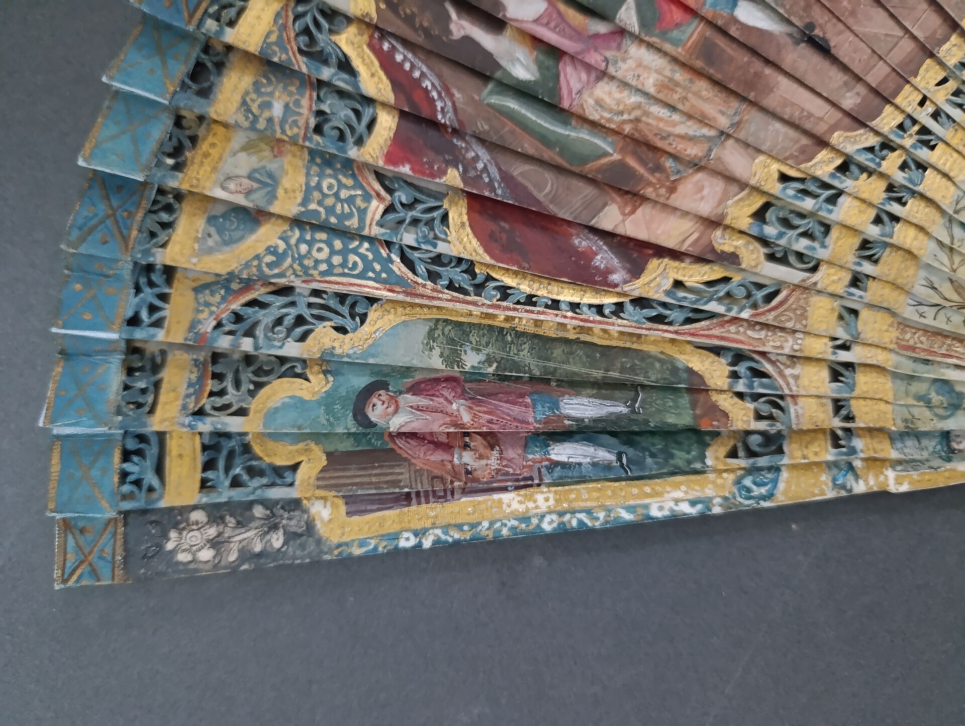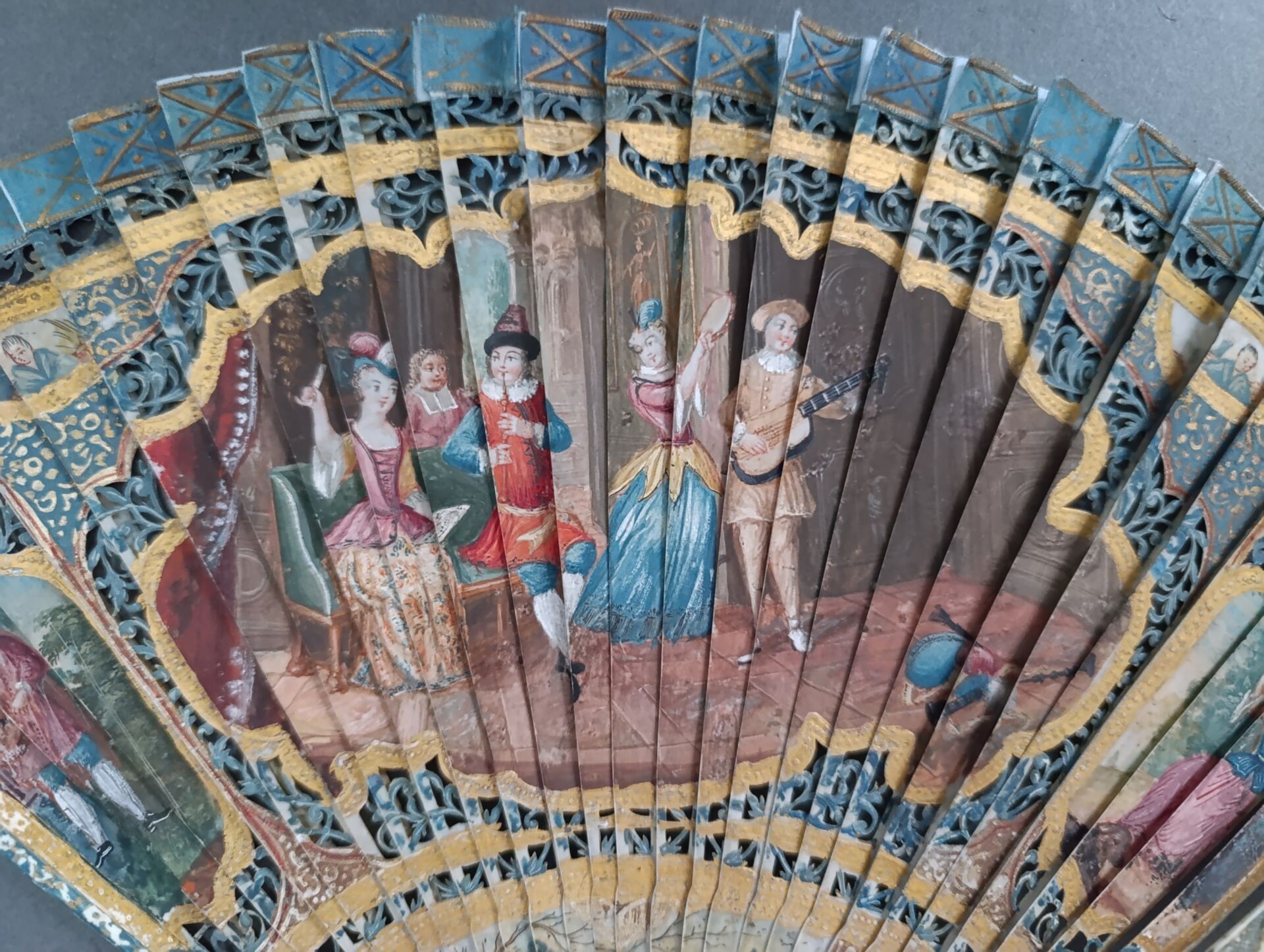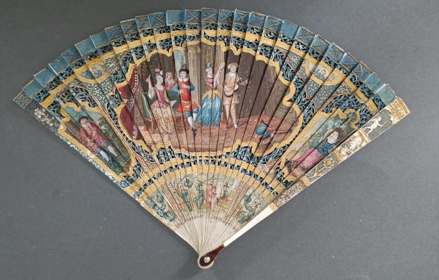 A broken-type fan in pierced, carved, engraved and painted ivory decorated with actors performing on a theatre stage. The simulated throat is decorated with characters in the Chinese style. Pierrot on the left plays the guitar. The sculpted plumes of a lover holding a flying heart with a ribbon. The head is adorned with a fine tortoise shell plate.