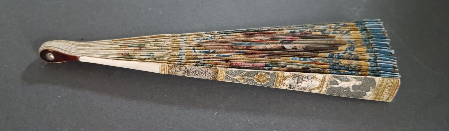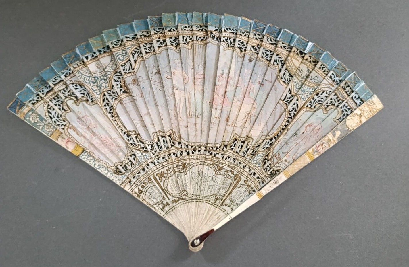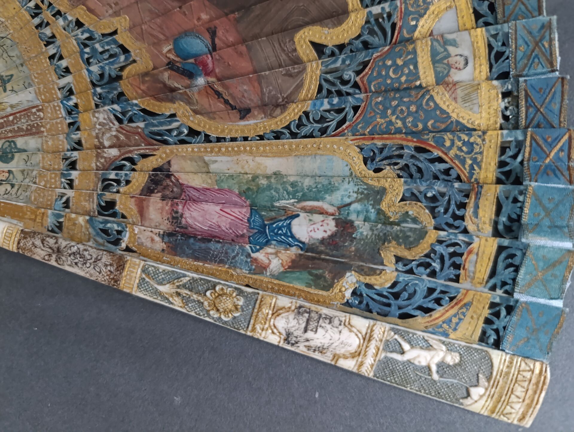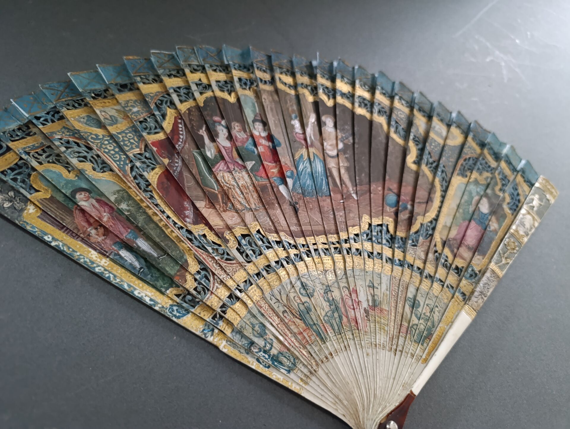 A broken-type fan in pierced, carved, engraved and painted ivory decorated with actors performing on a theatre stage. The simulated throat is decorated with characters in the Chinese style. Pierrot on the left plays the guitar. The sculpted plumes of a lover holding a flying heart with a ribbon. The head is adorned with a fine tortoise shell plate.