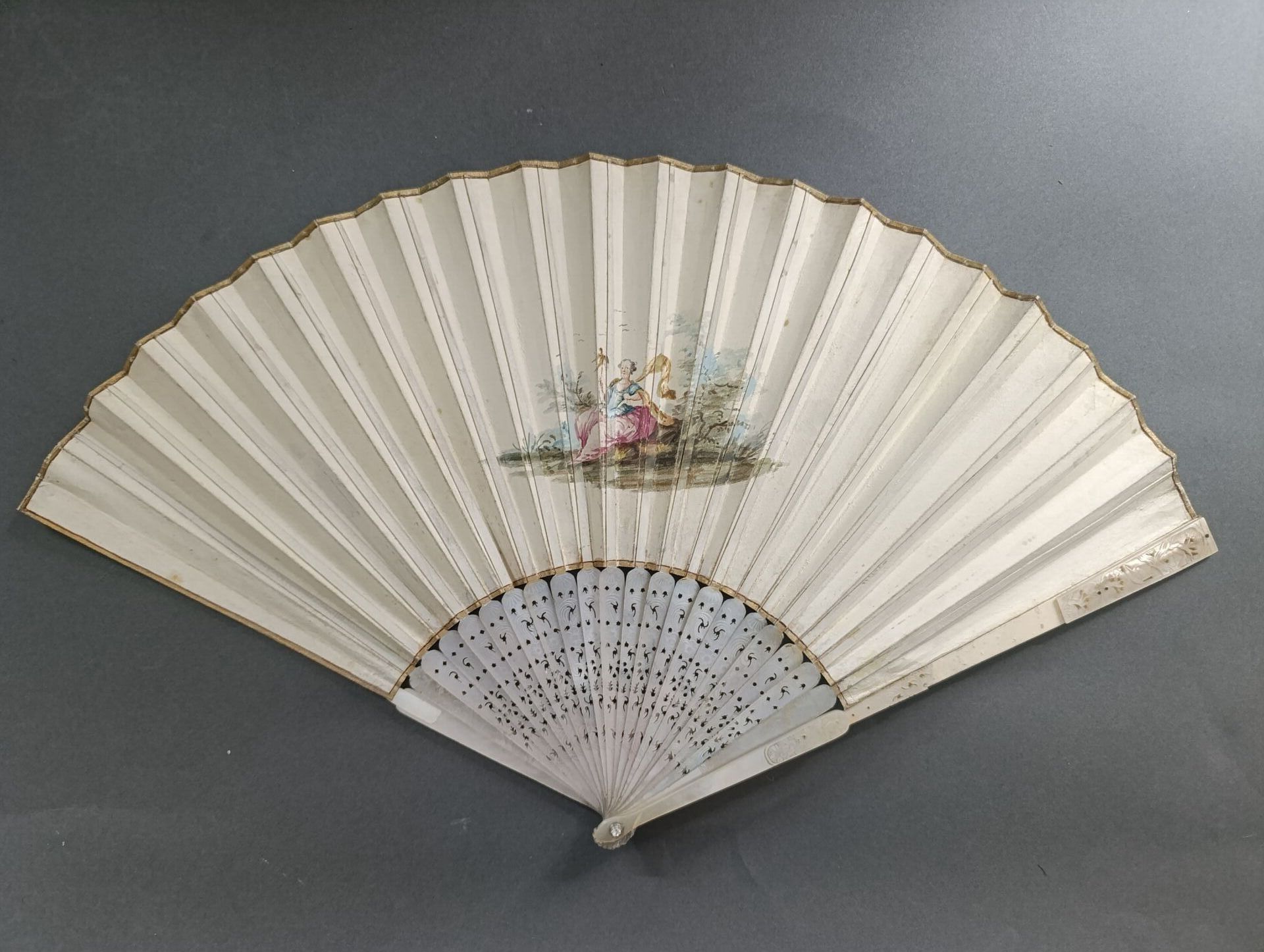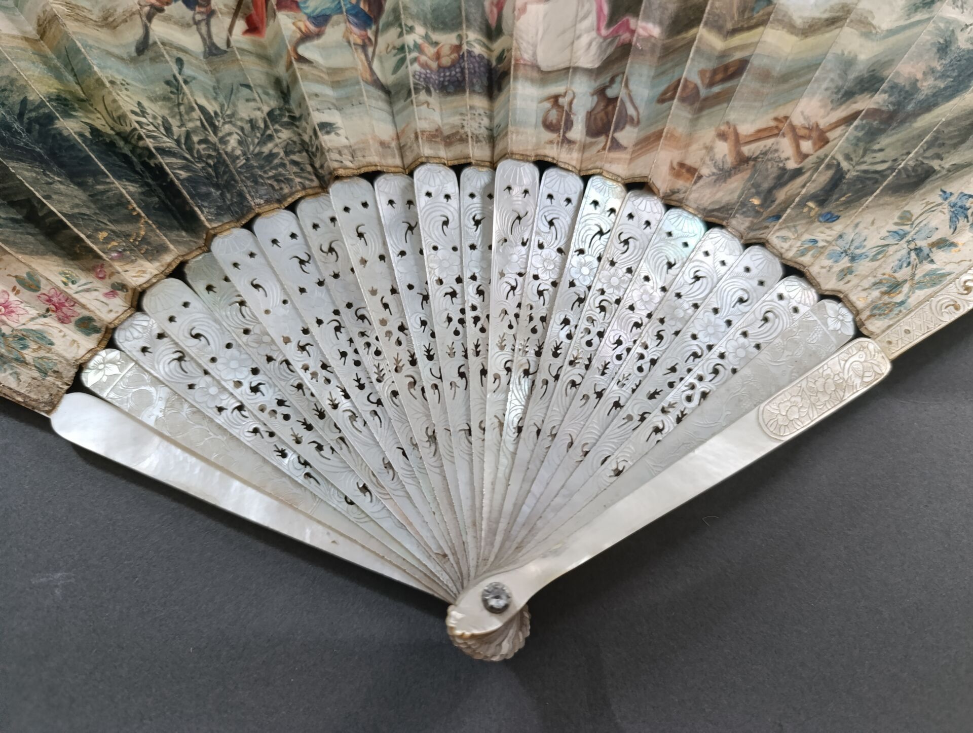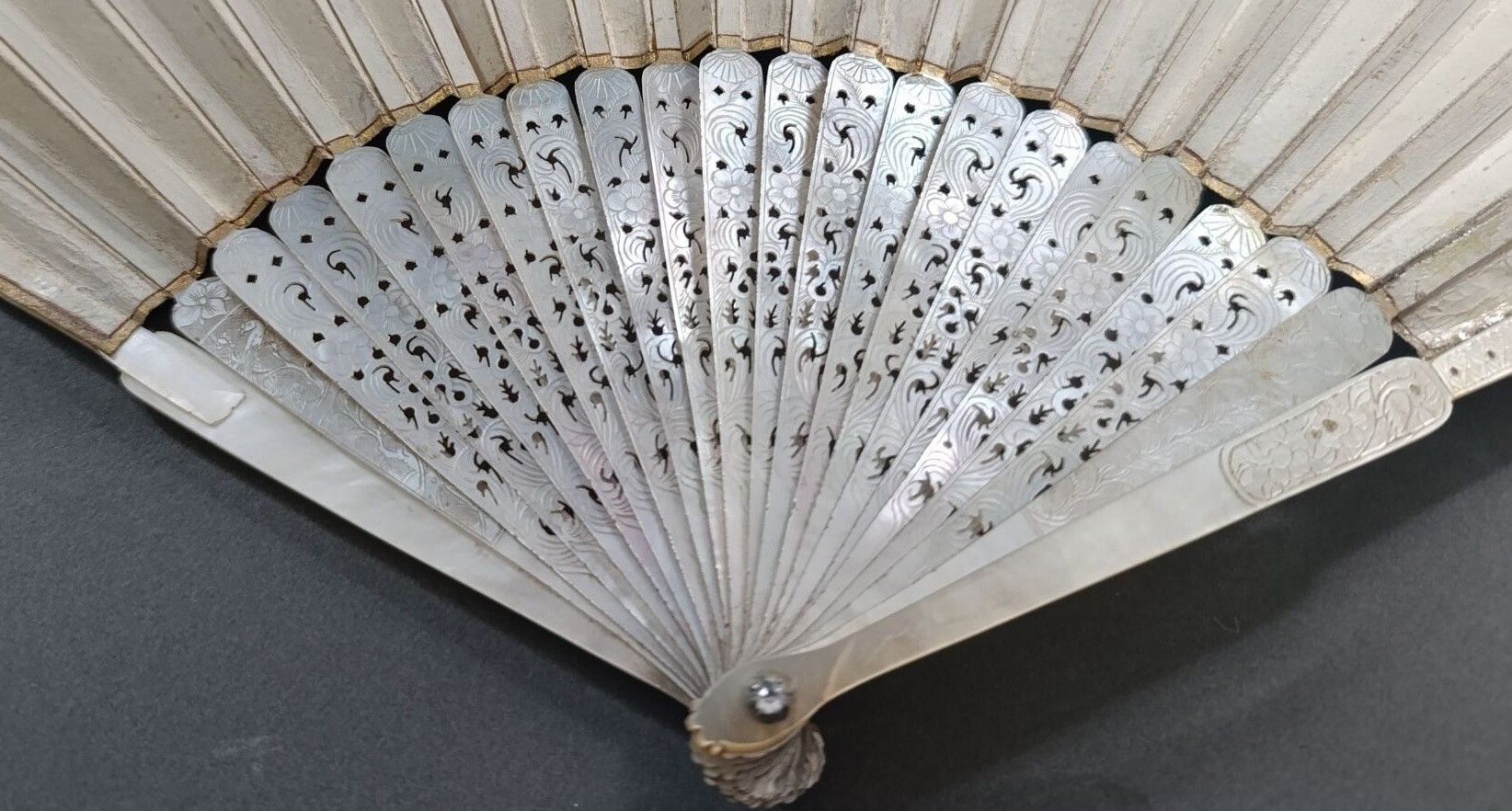 Mother-of-pearl mounting finely pierced and engraved with flowers.