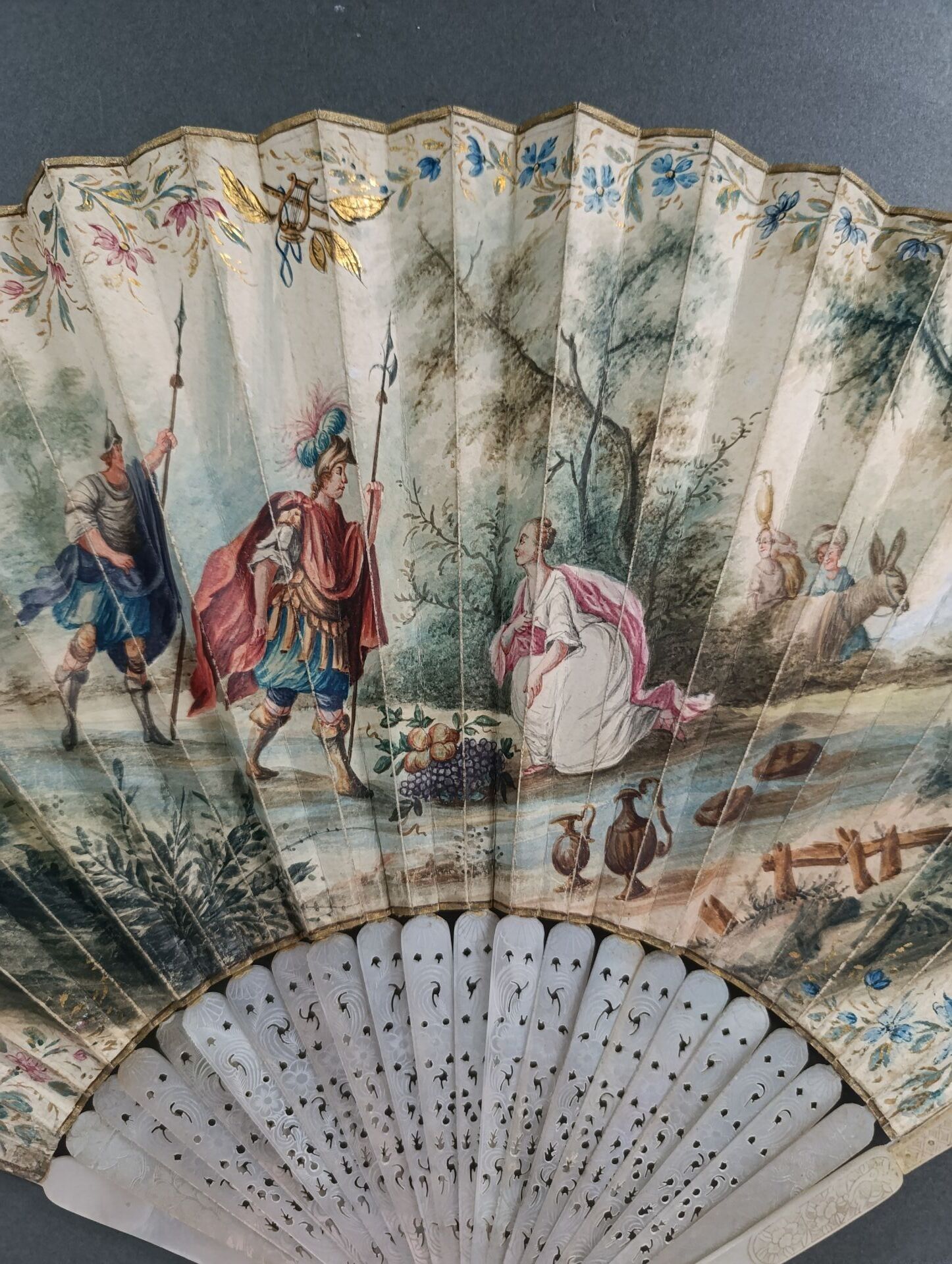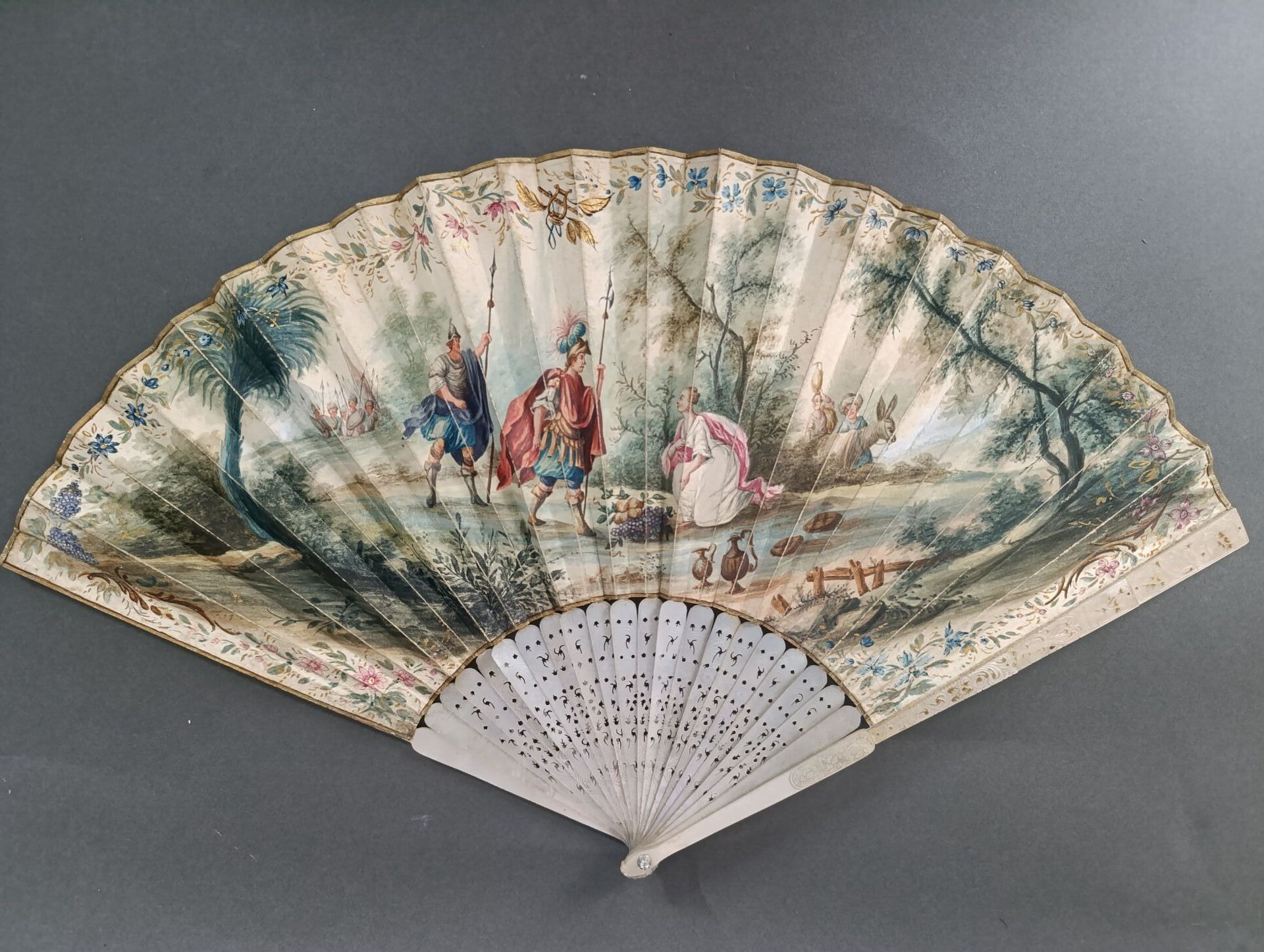 Folded fan, the leaf in skin, mounted in the English style, and painted with the meeting of David and Abigail who lays food at his feet.