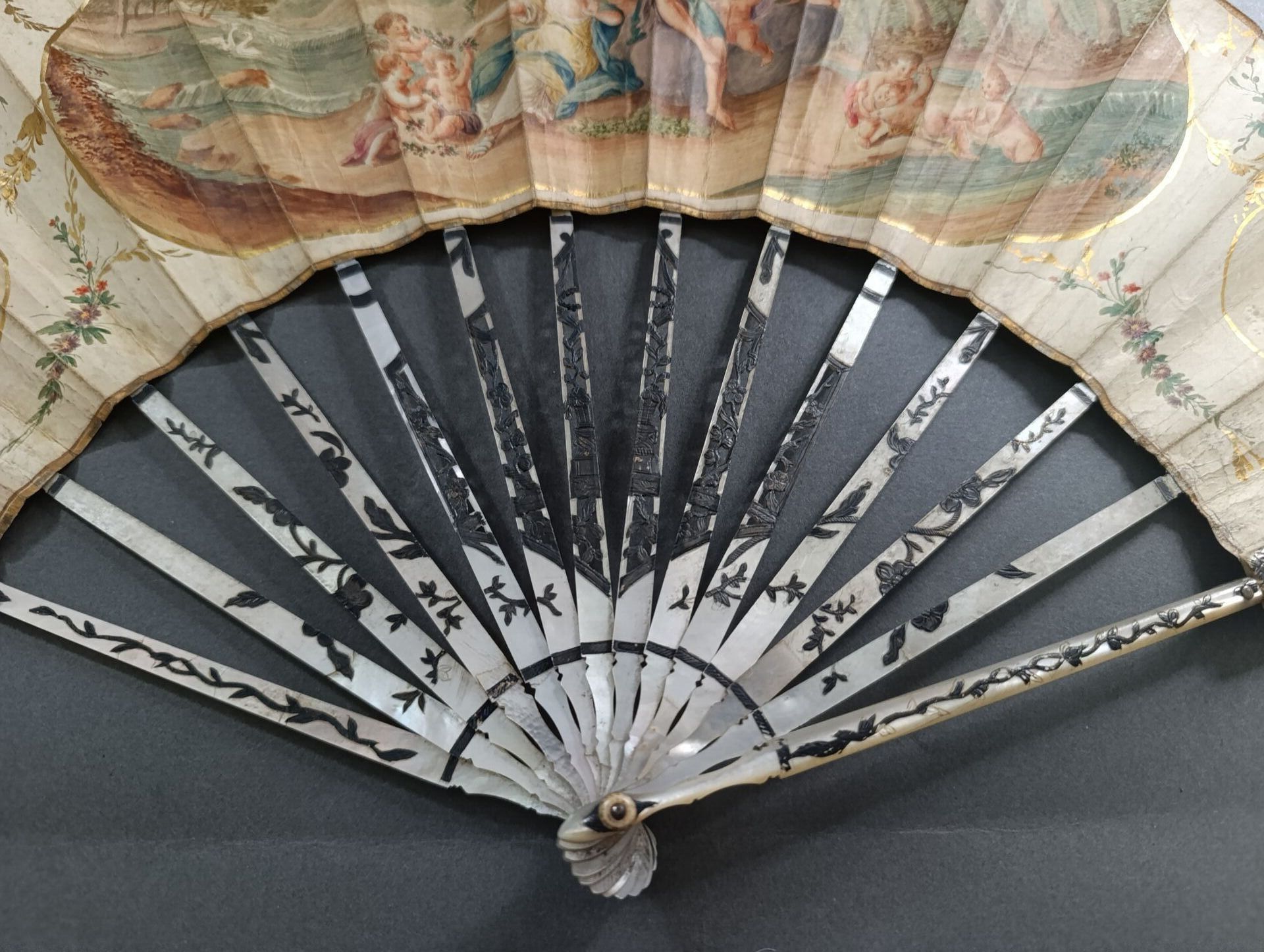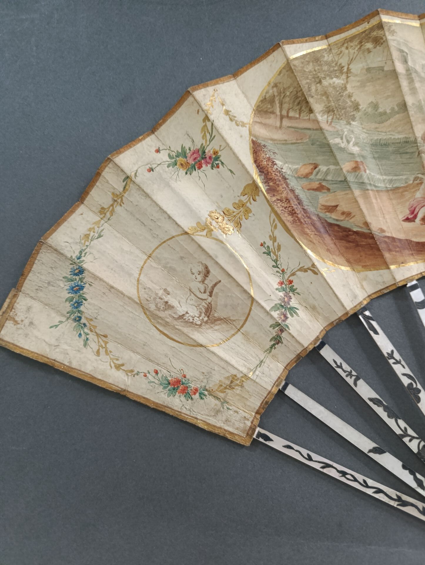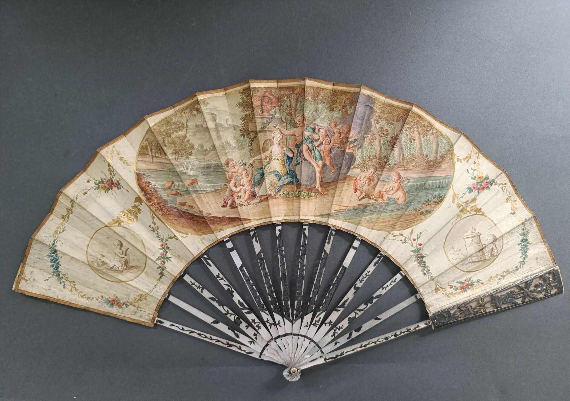 A folded fan, the leaf in skin, mounted in the English style, and painted with Zephyr with butterfly wings crowning the goddess Flora with flowers, surrounded by lovers, sealing their union. Lovers painted in sepia colour adorn the side medallions.