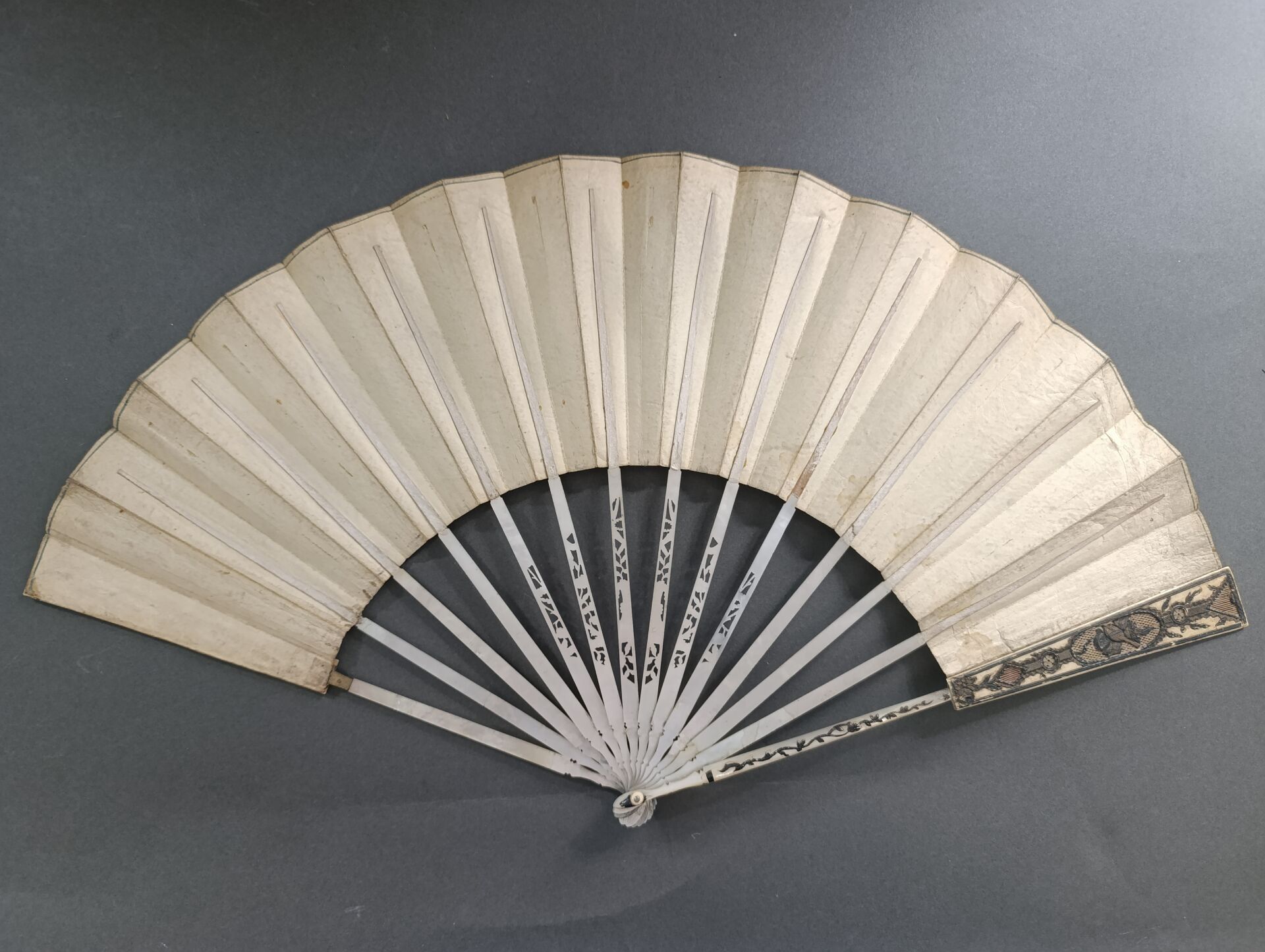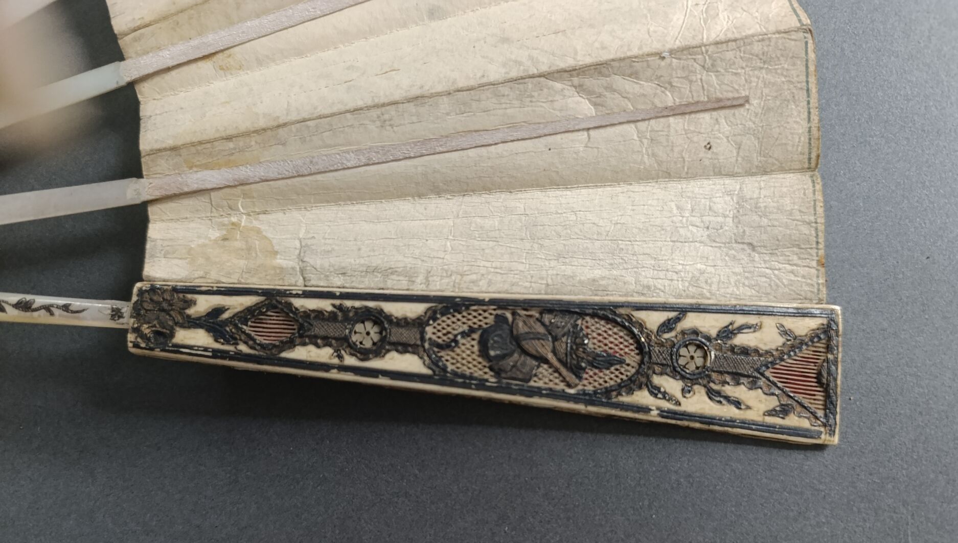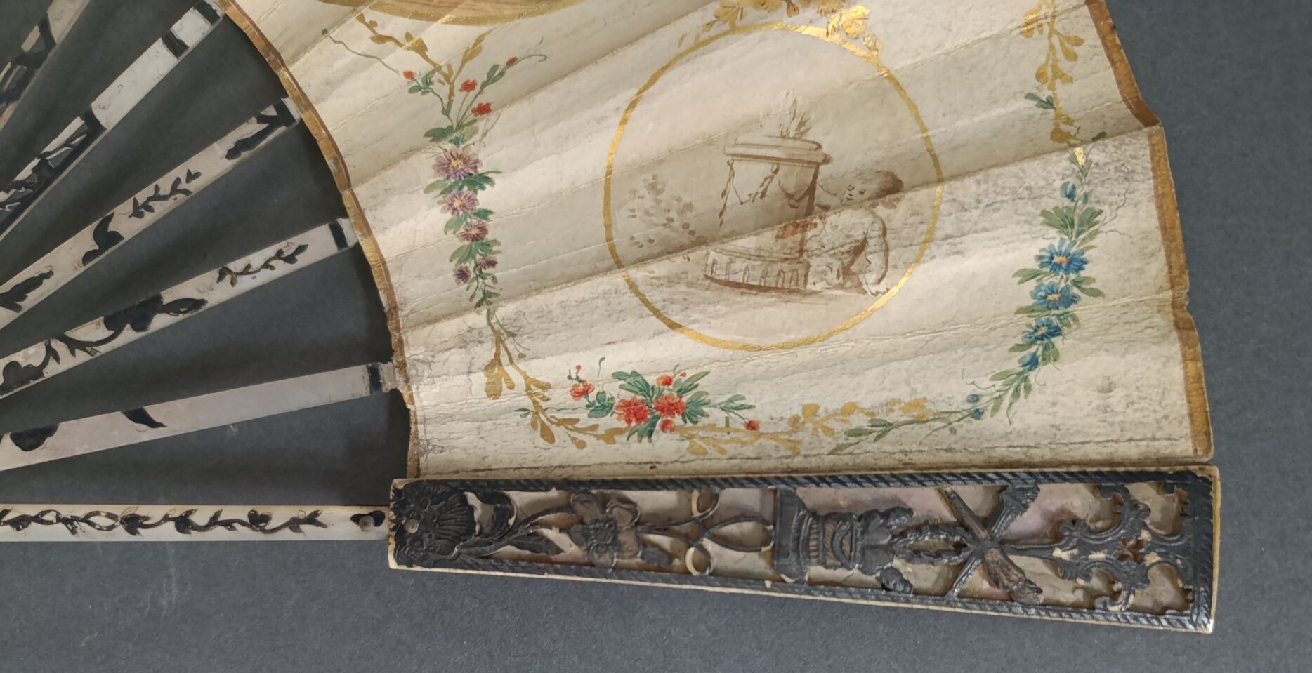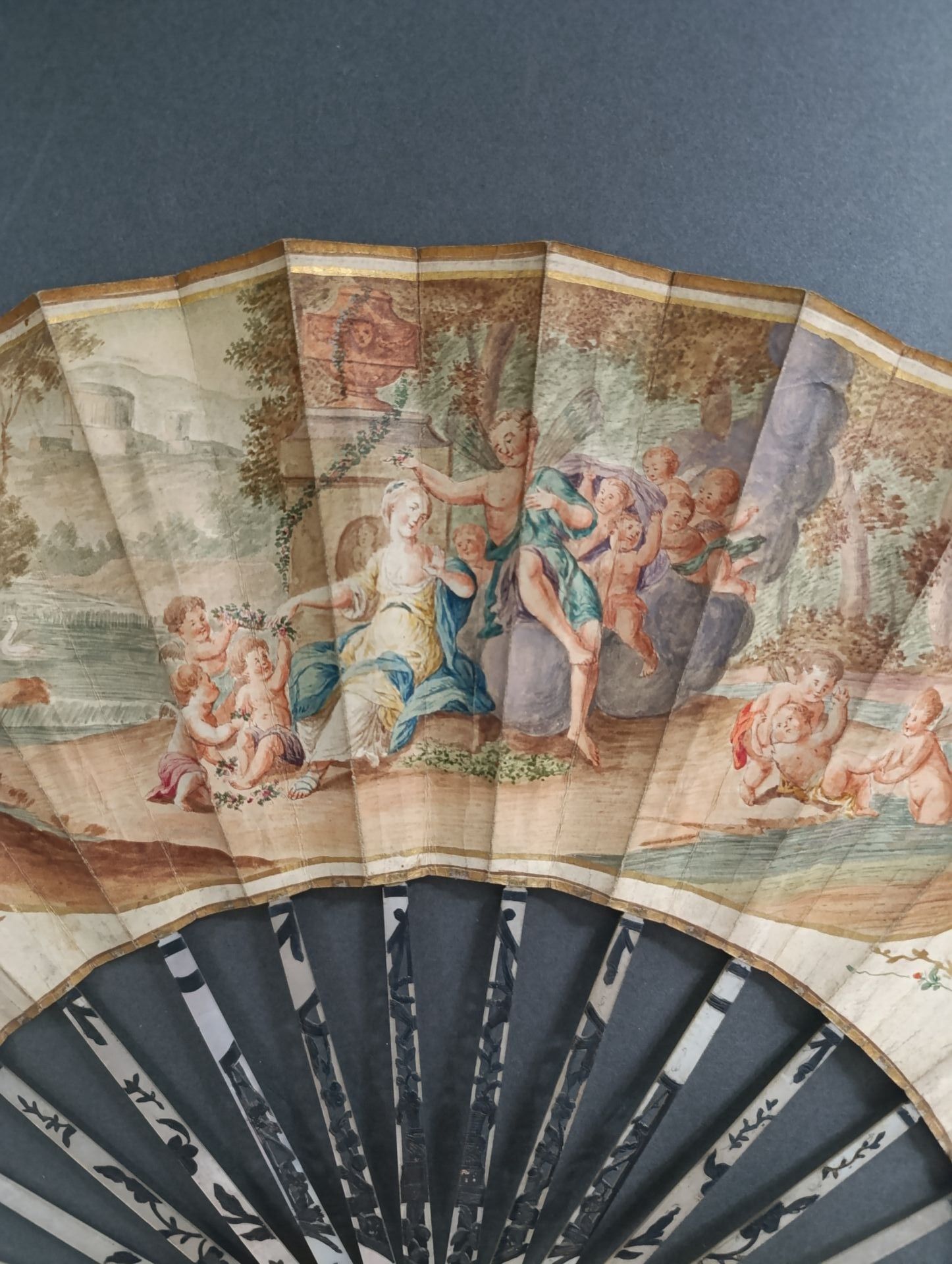 A folded fan, the leaf in skin, mounted in the English style, and painted with Zephyr with butterfly wings crowning the goddess Flora with flowers, surrounded by lovers, sealing their union. Lovers painted in sepia colour adorn the side medallions.