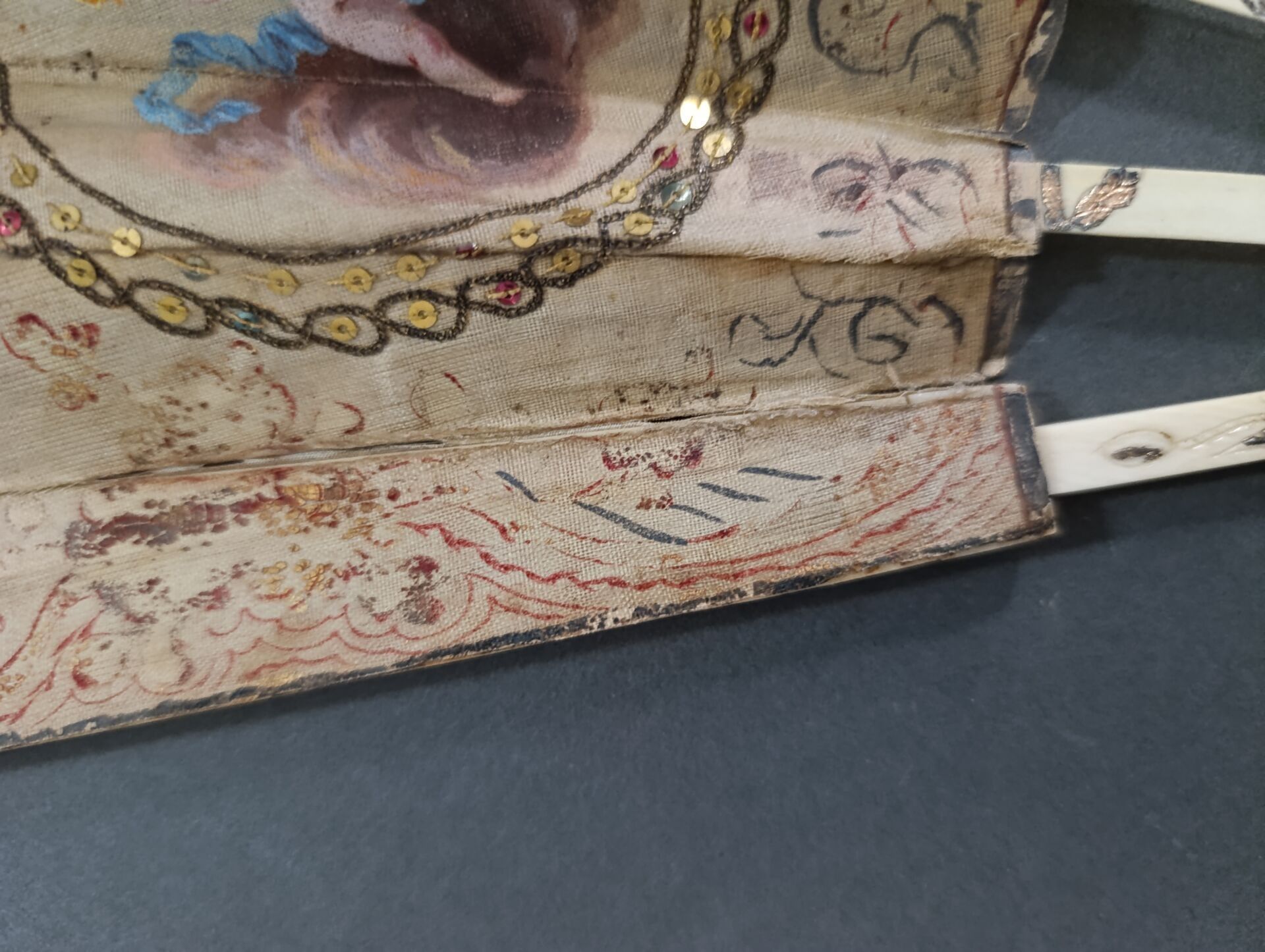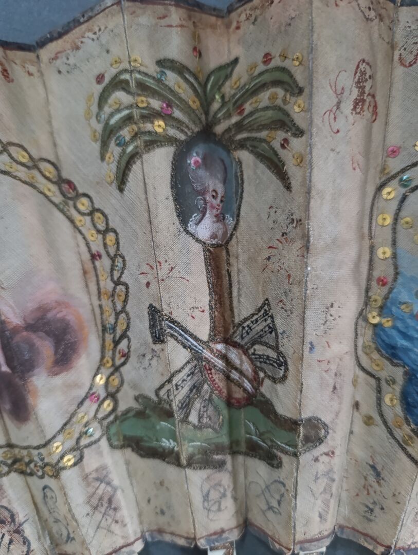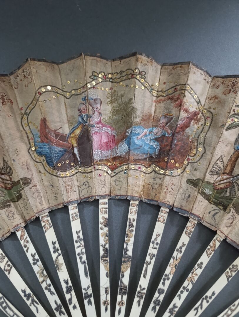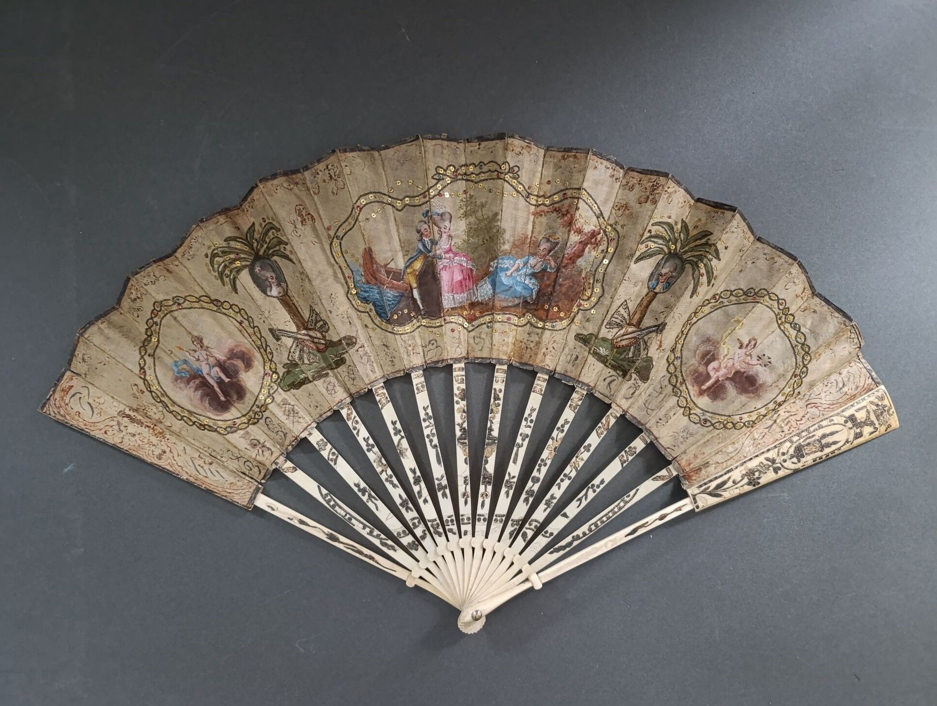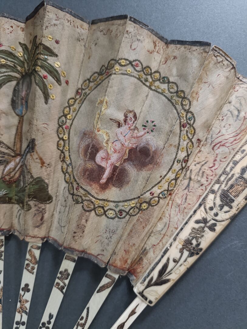 Folded fan, with a so-called pocket or telescopic system, the double sheet of silk painted with loves in side cartels, and portraits, of a young man and a young woman, hanging from a palm tree. In the centre, a gallant scene by the water.