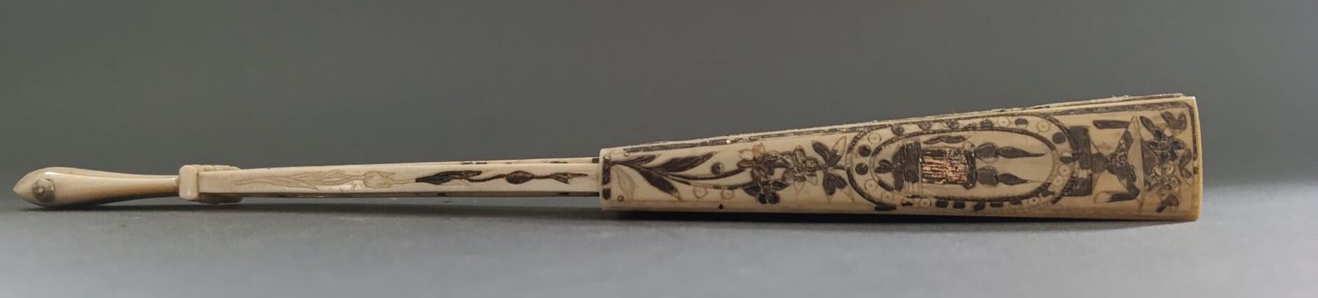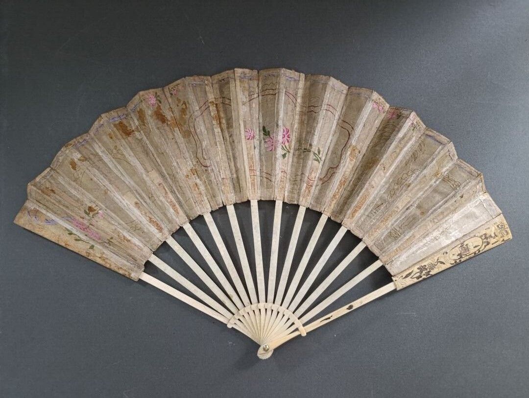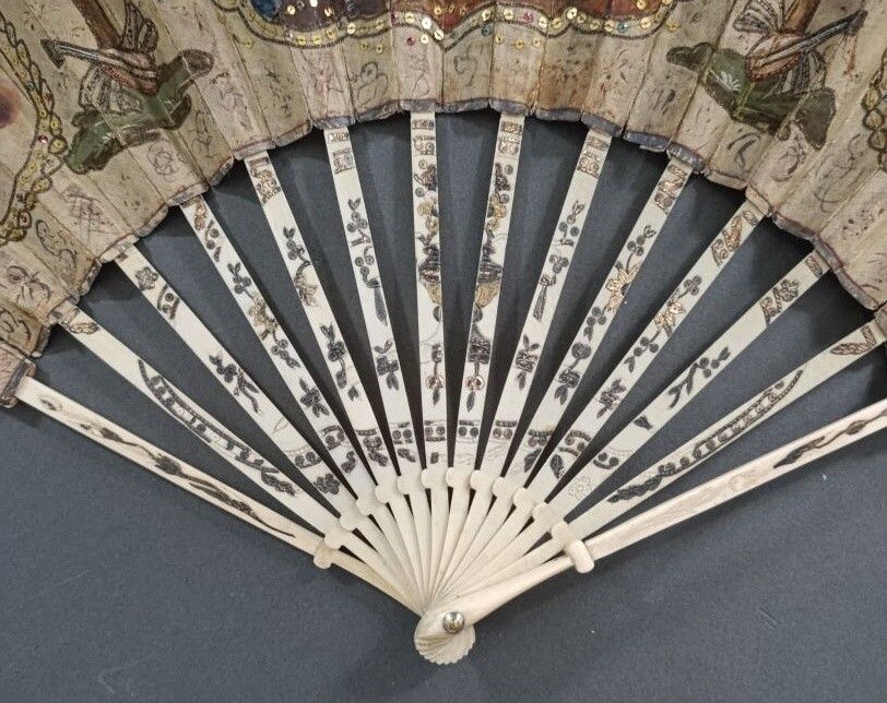 The ivory frame has a pocket or telescopic system. When the fan is closed, the blades slide inside the leaf to reduce the size of the fan and make it easier to carry. The throat is decorated with a vase and flowers, engraved and gilded.