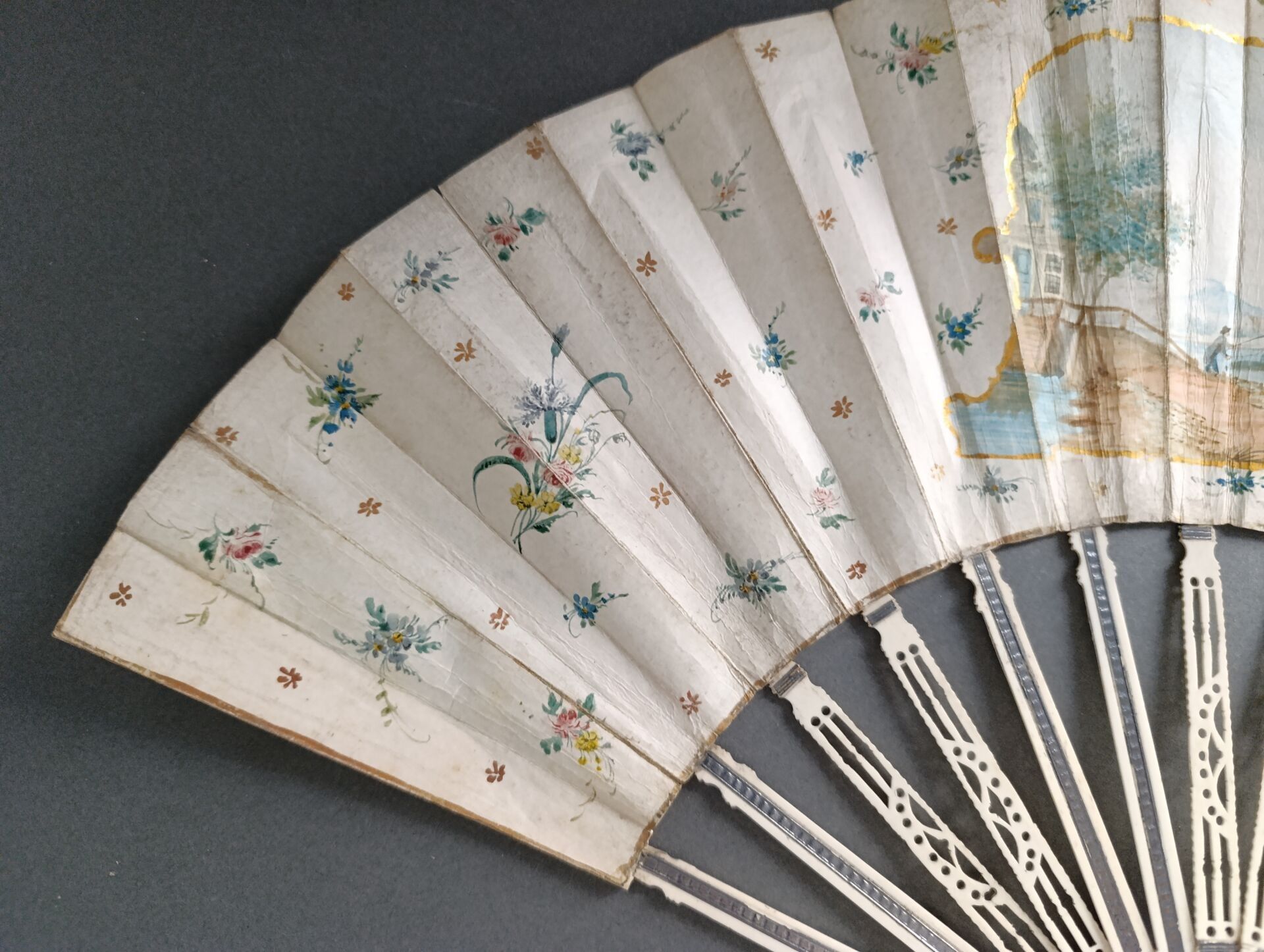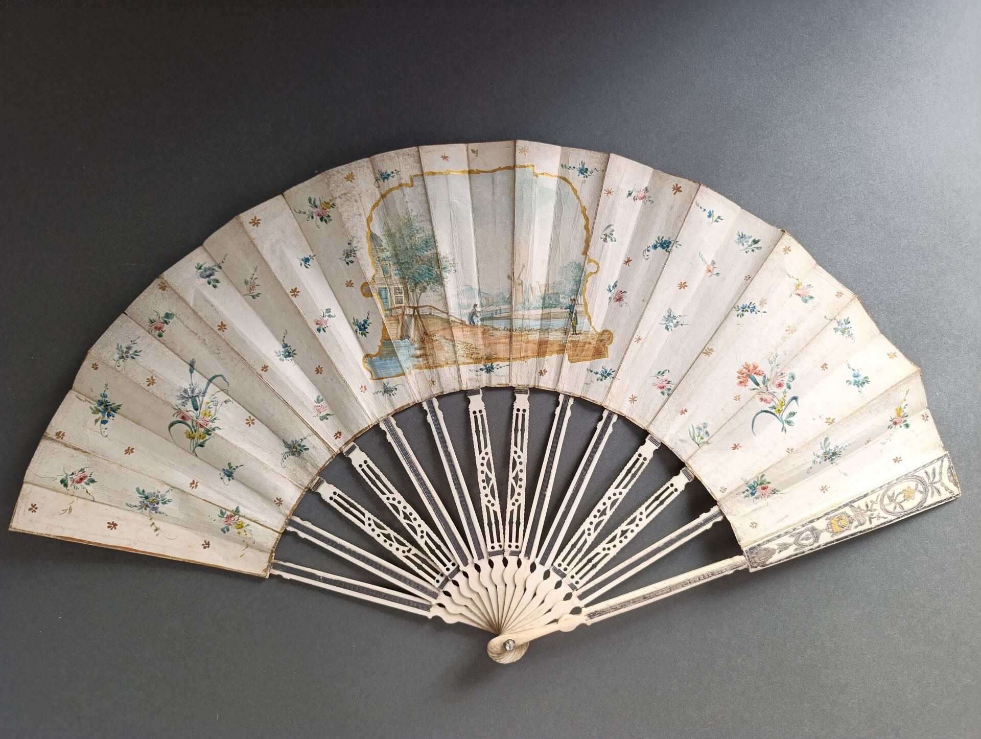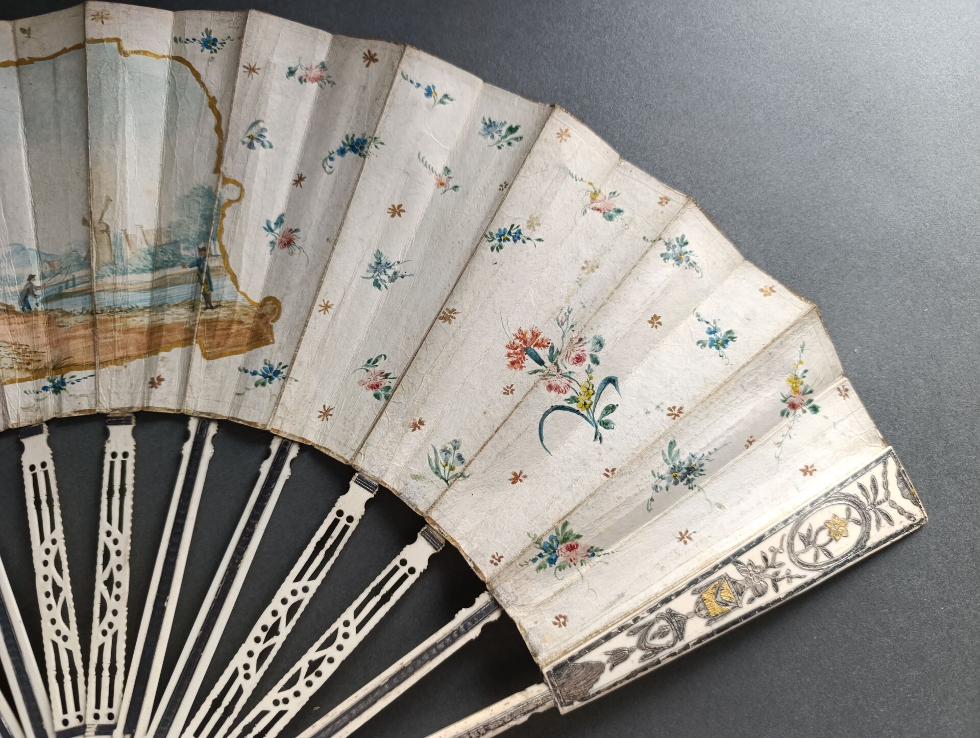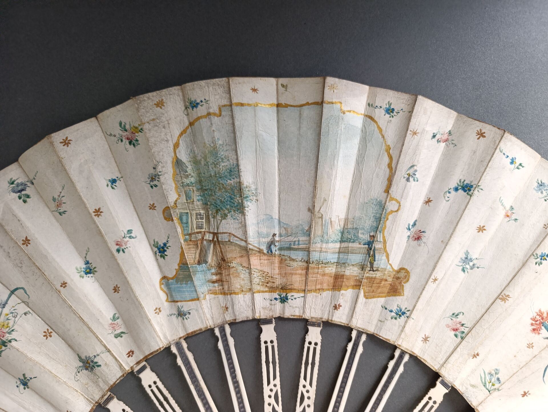 Folded fan, the skin sheet, mounted in the English style, painted with a polder landscape animated with figures and a windmill, on a background of flowers.