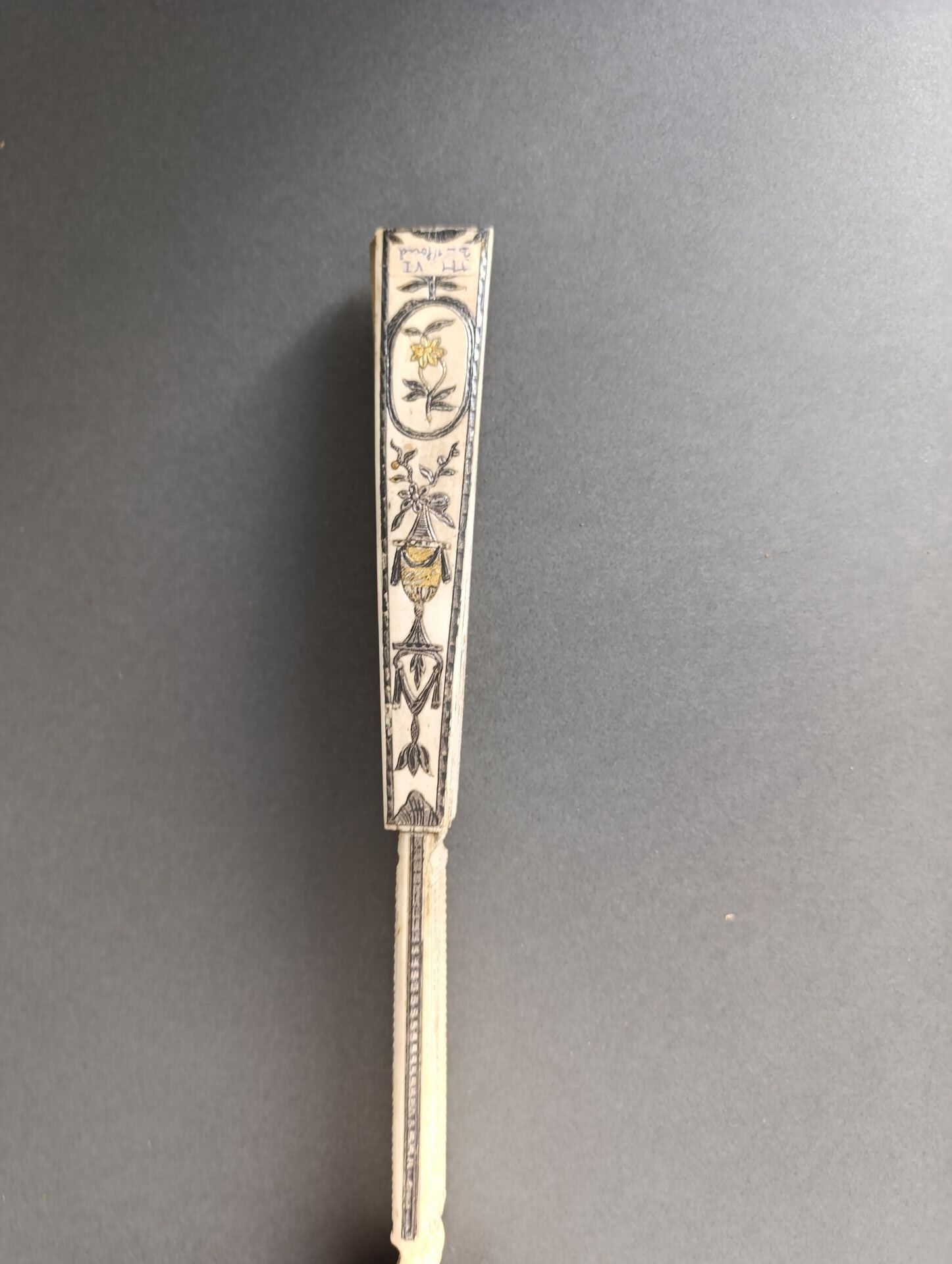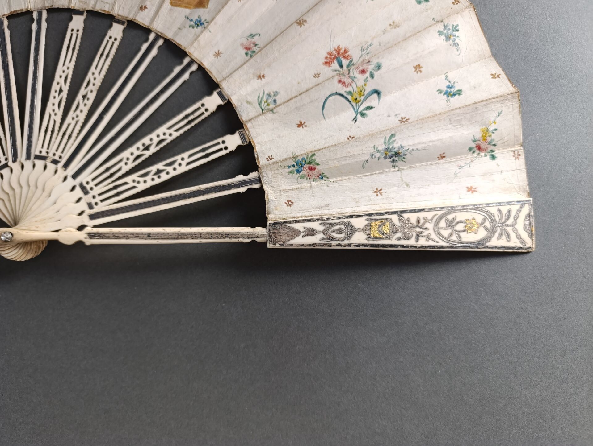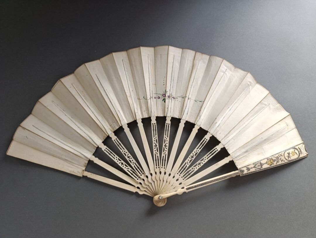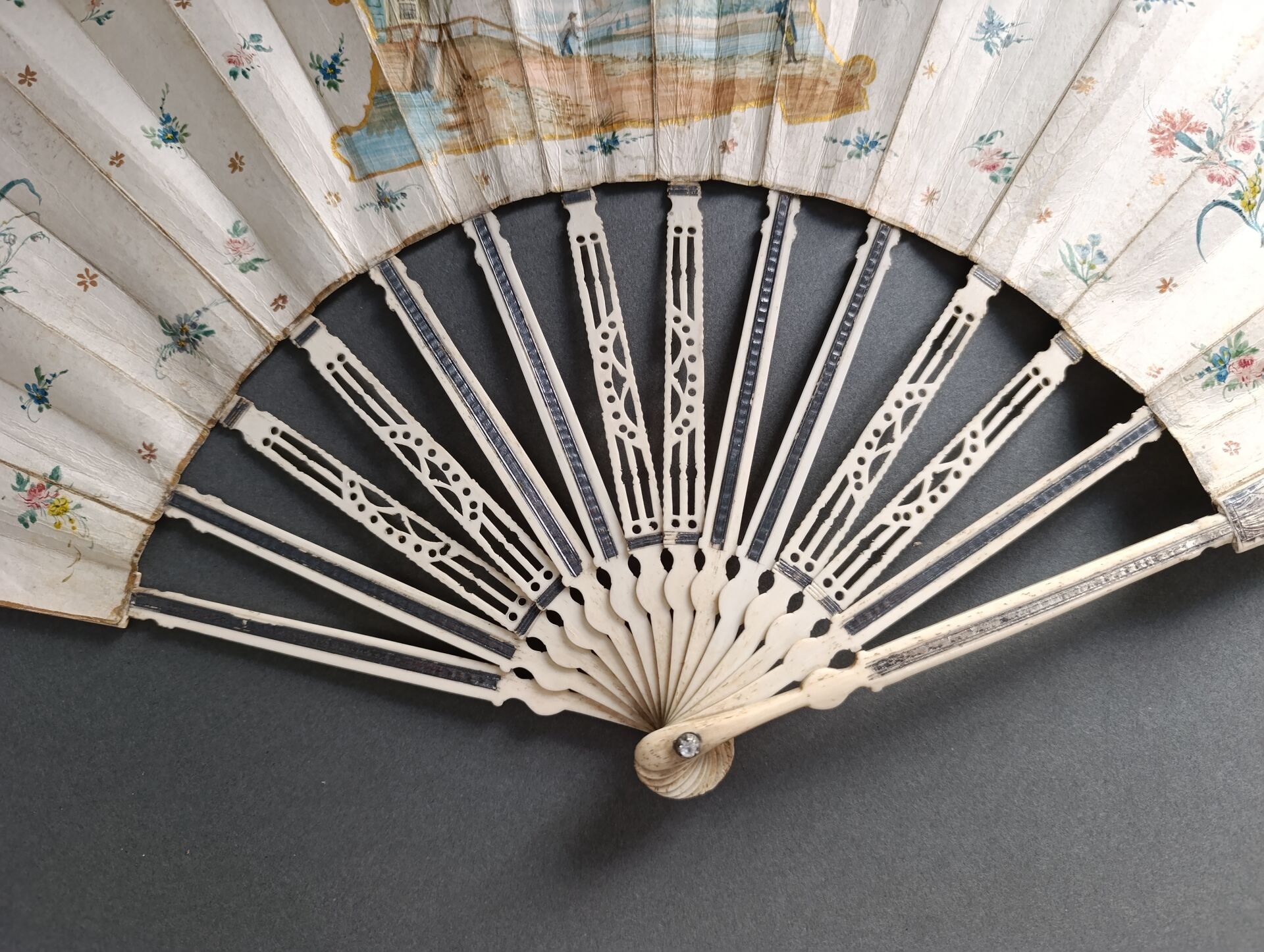 Folded fan, the skin sheet, mounted in the English style, painted with a polder landscape animated with figures and a windmill, on a background of flowers.
