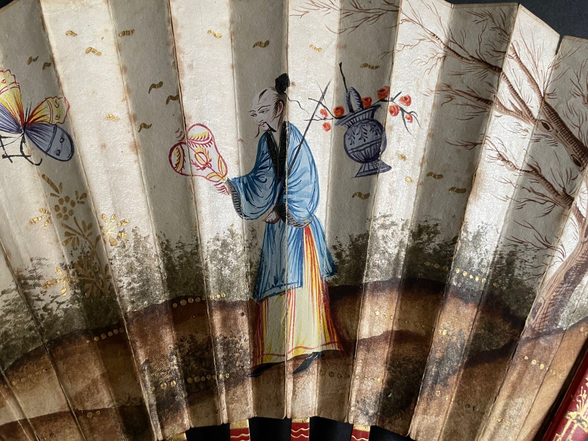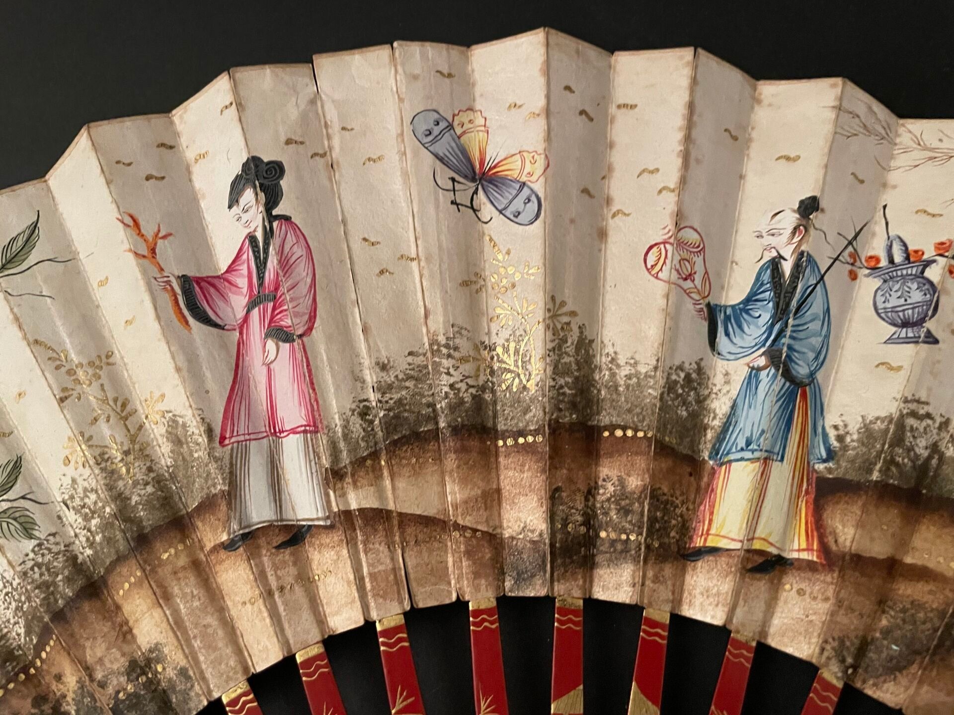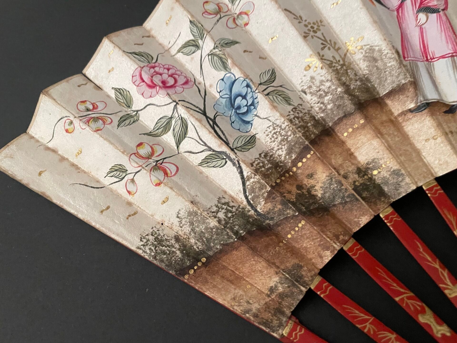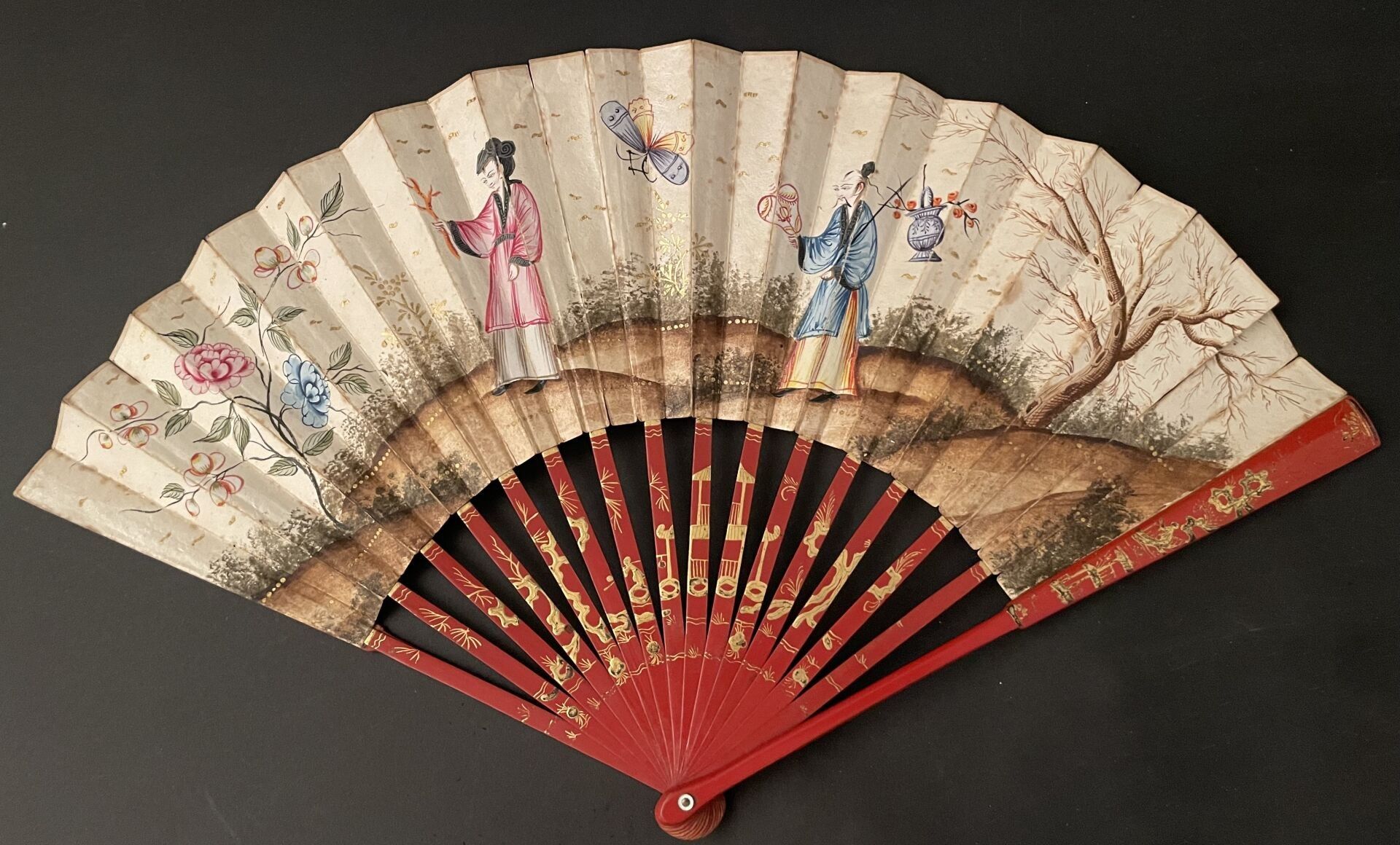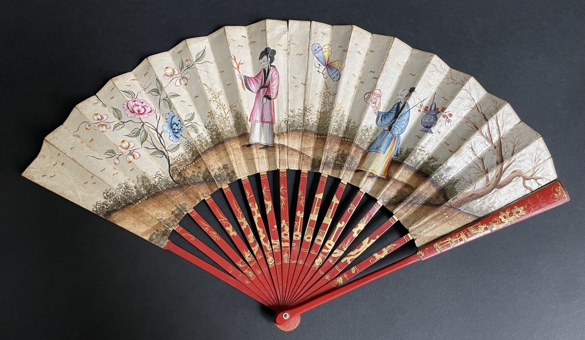 Folded fan, the double sheet of paper painted in the Chinese style with two figures in a garden.