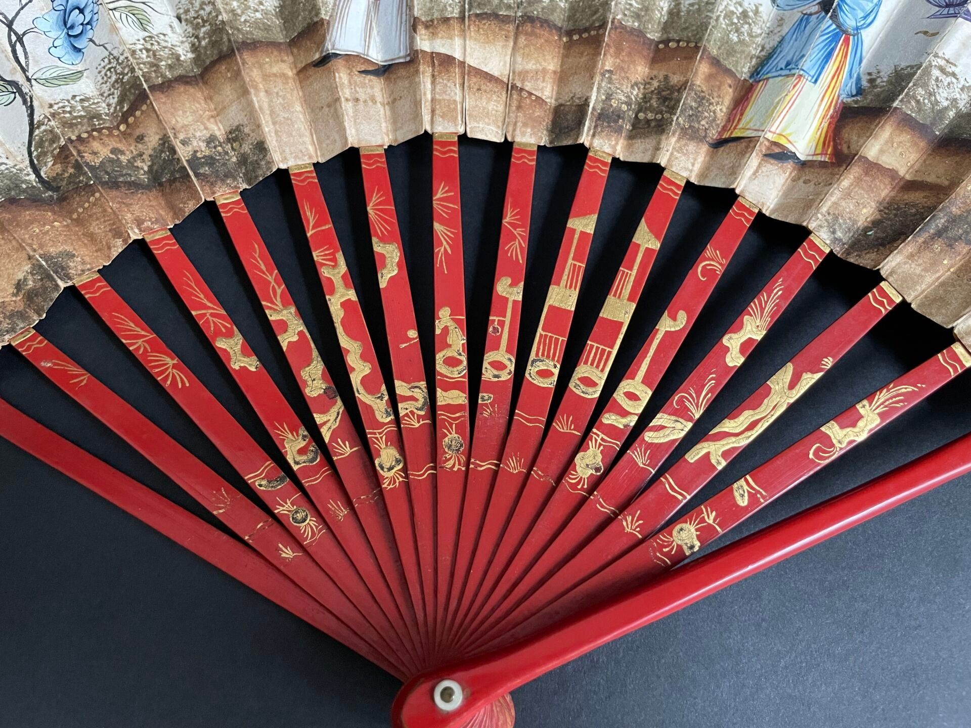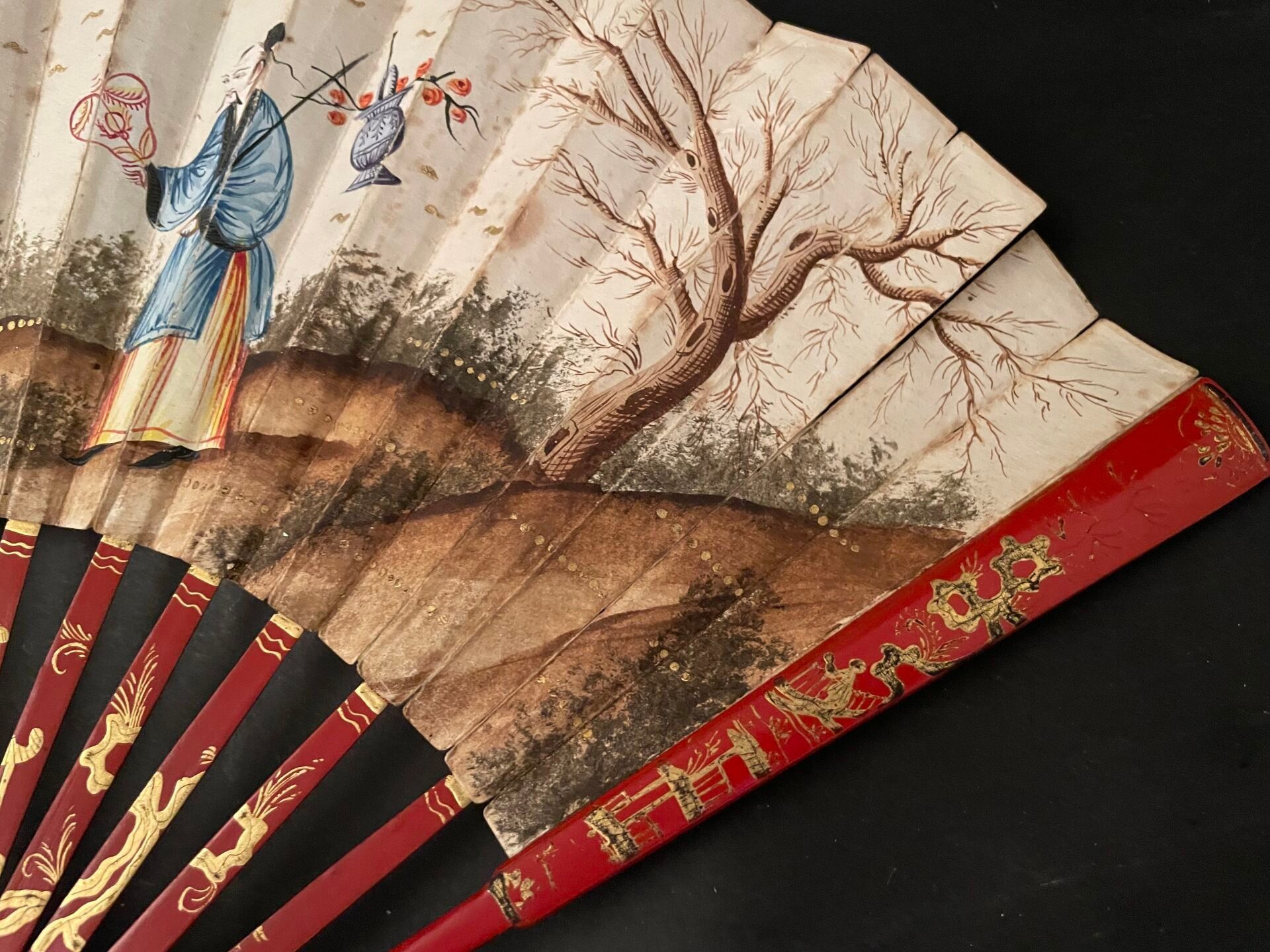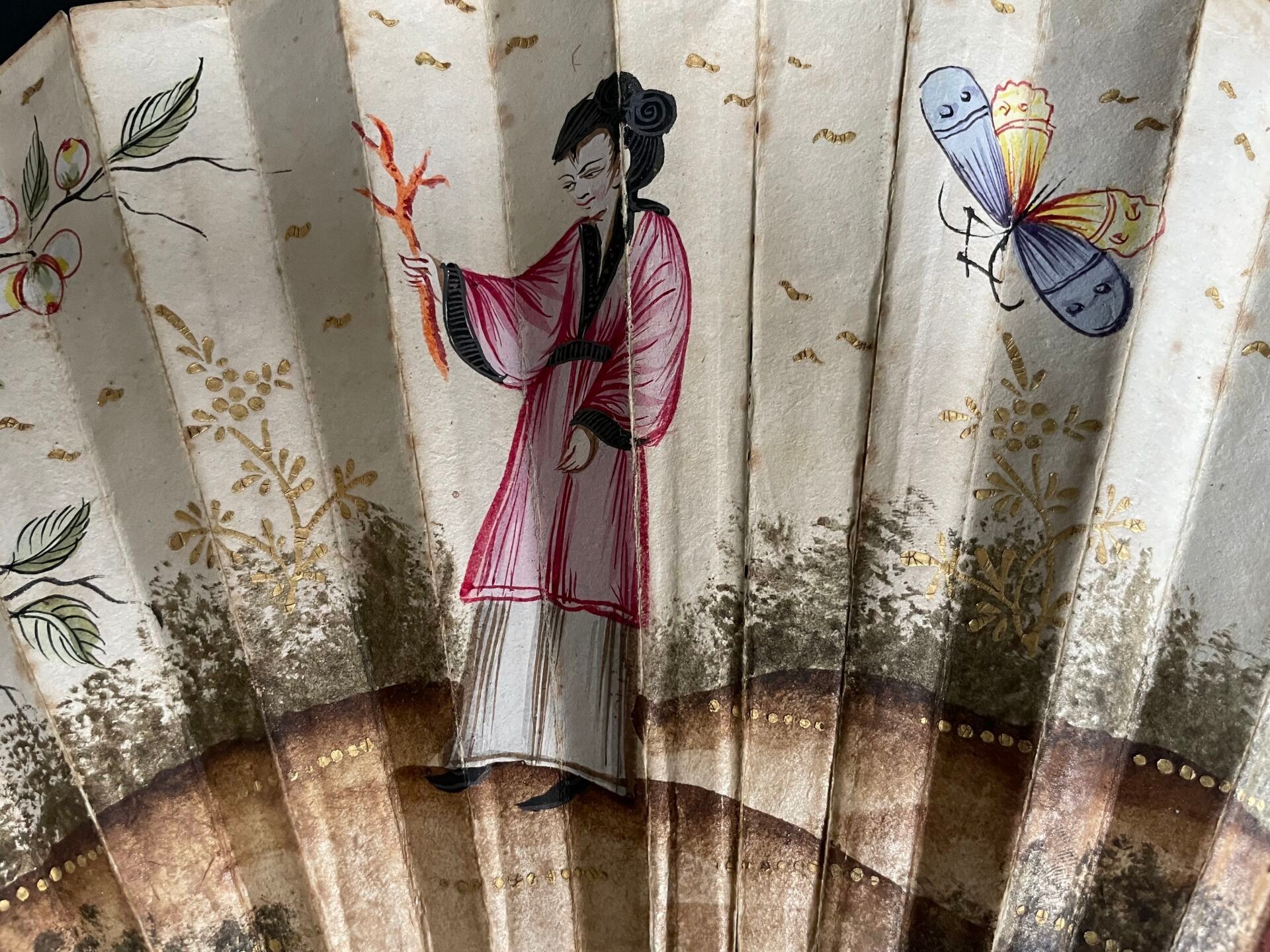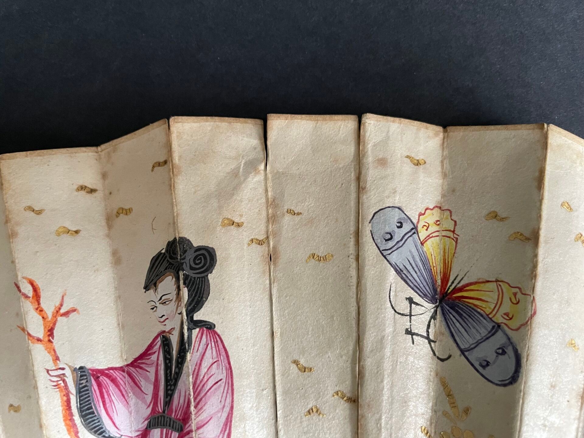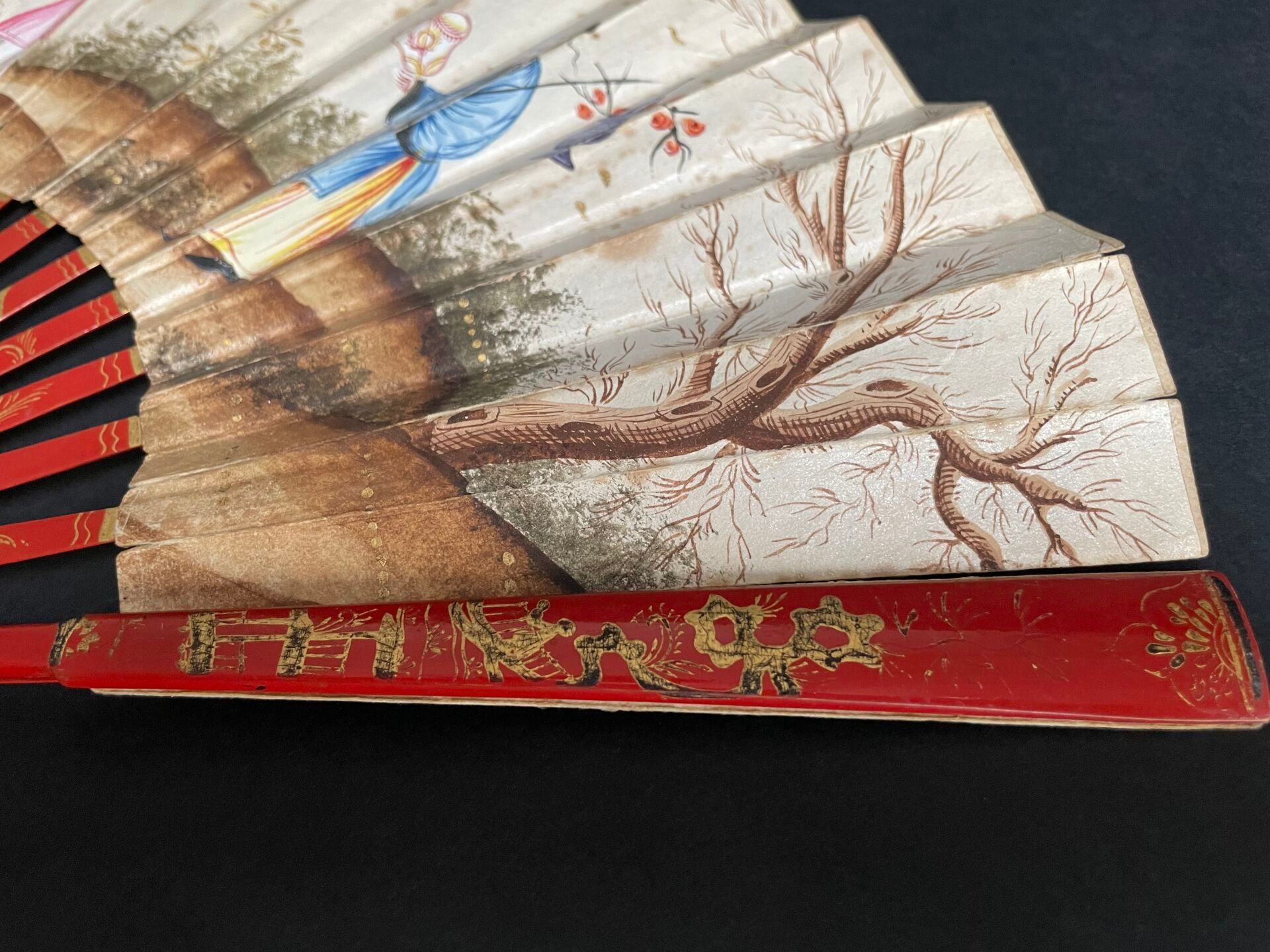 Folded fan, the double sheet of paper painted in the Chinese style with two figures in a garden.