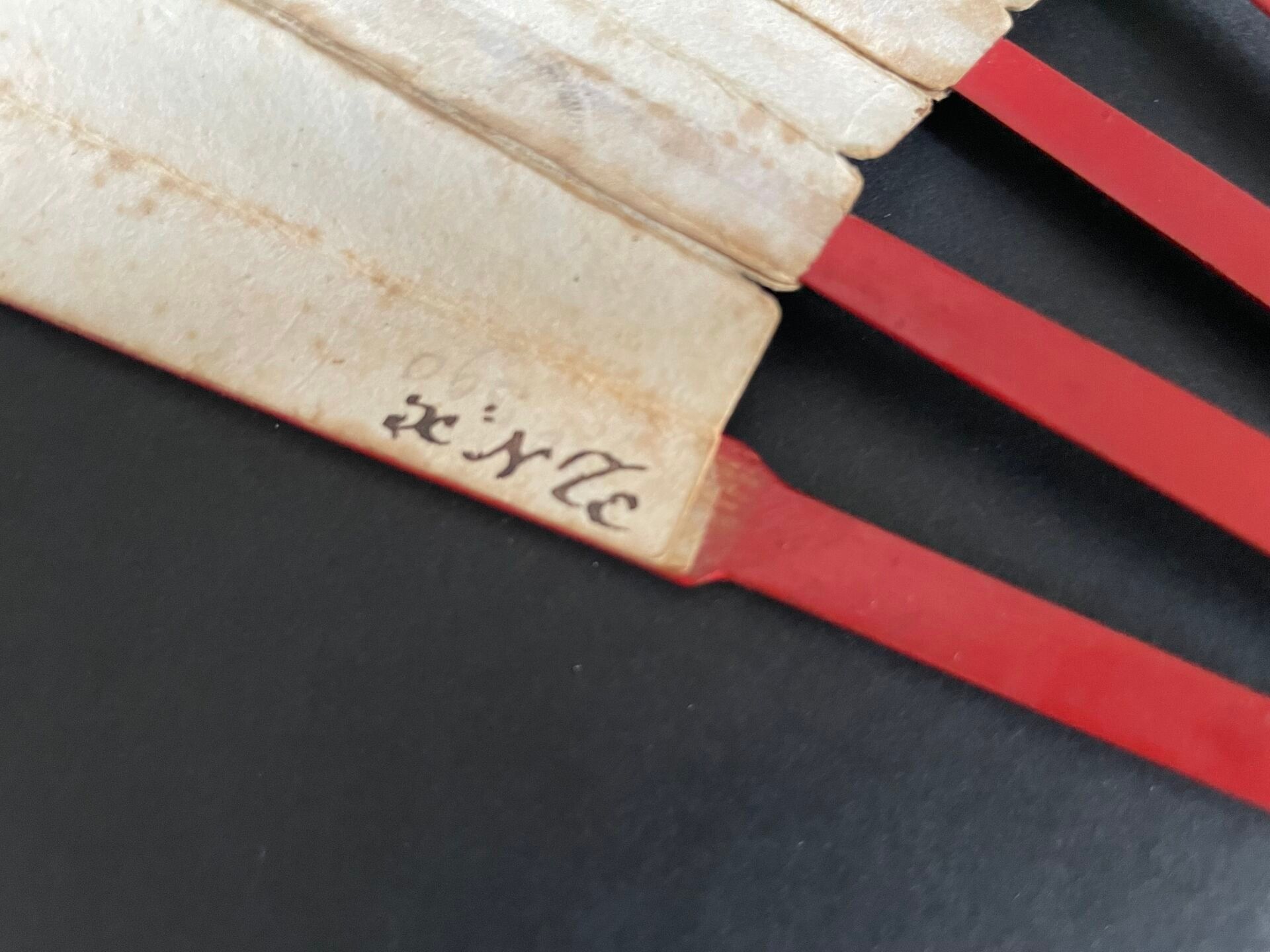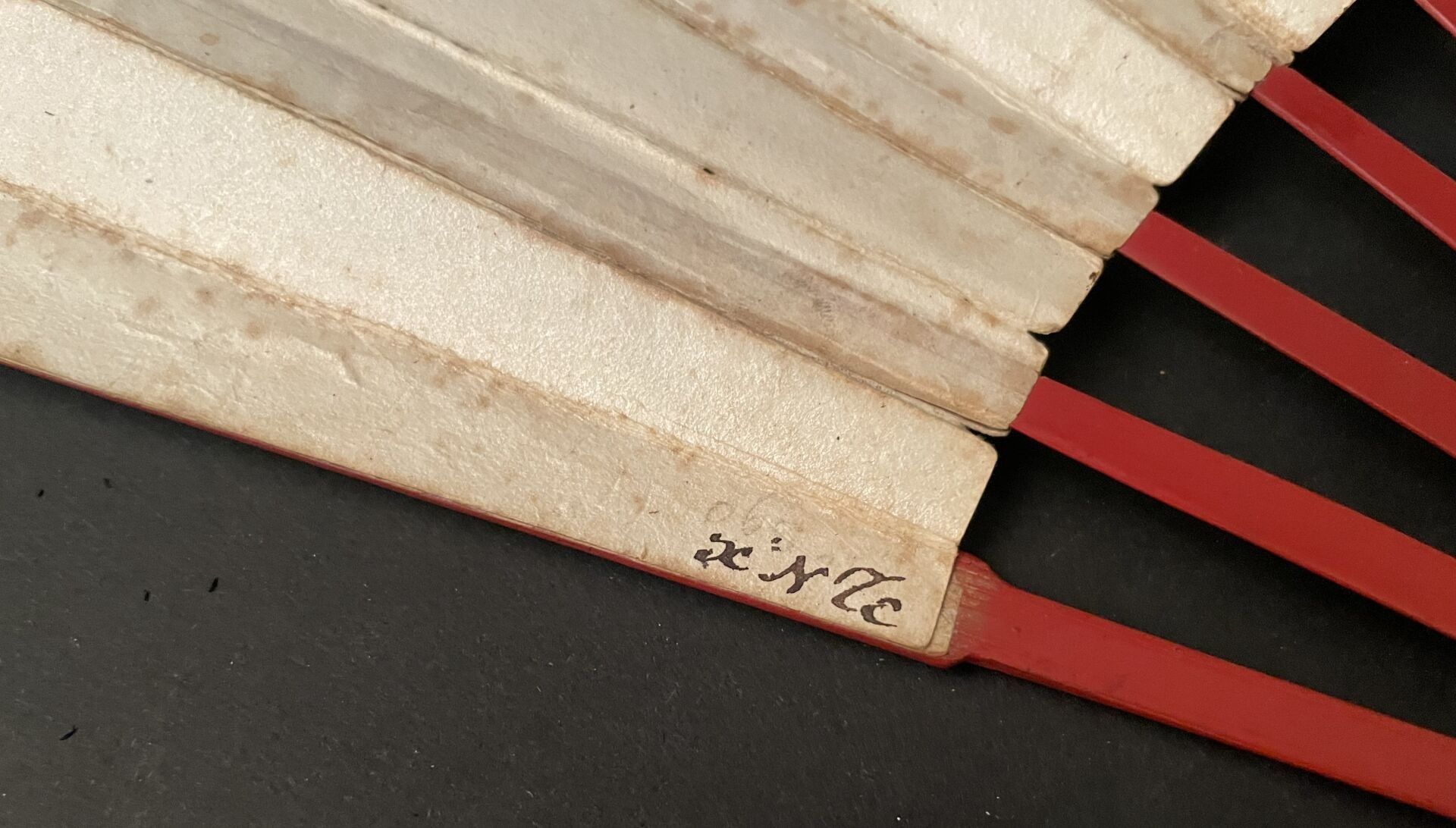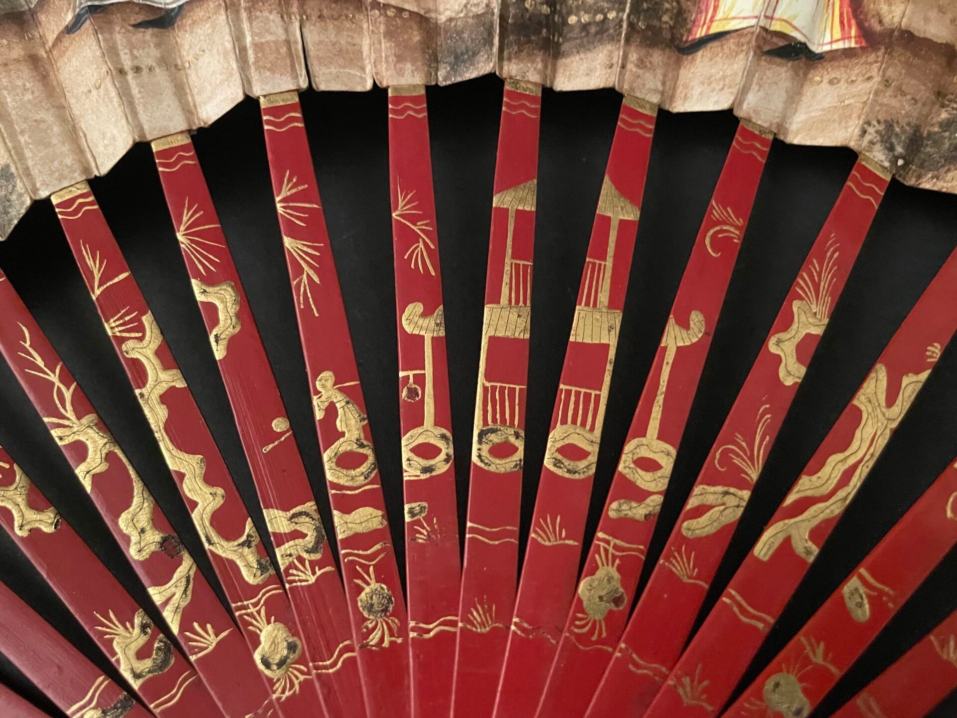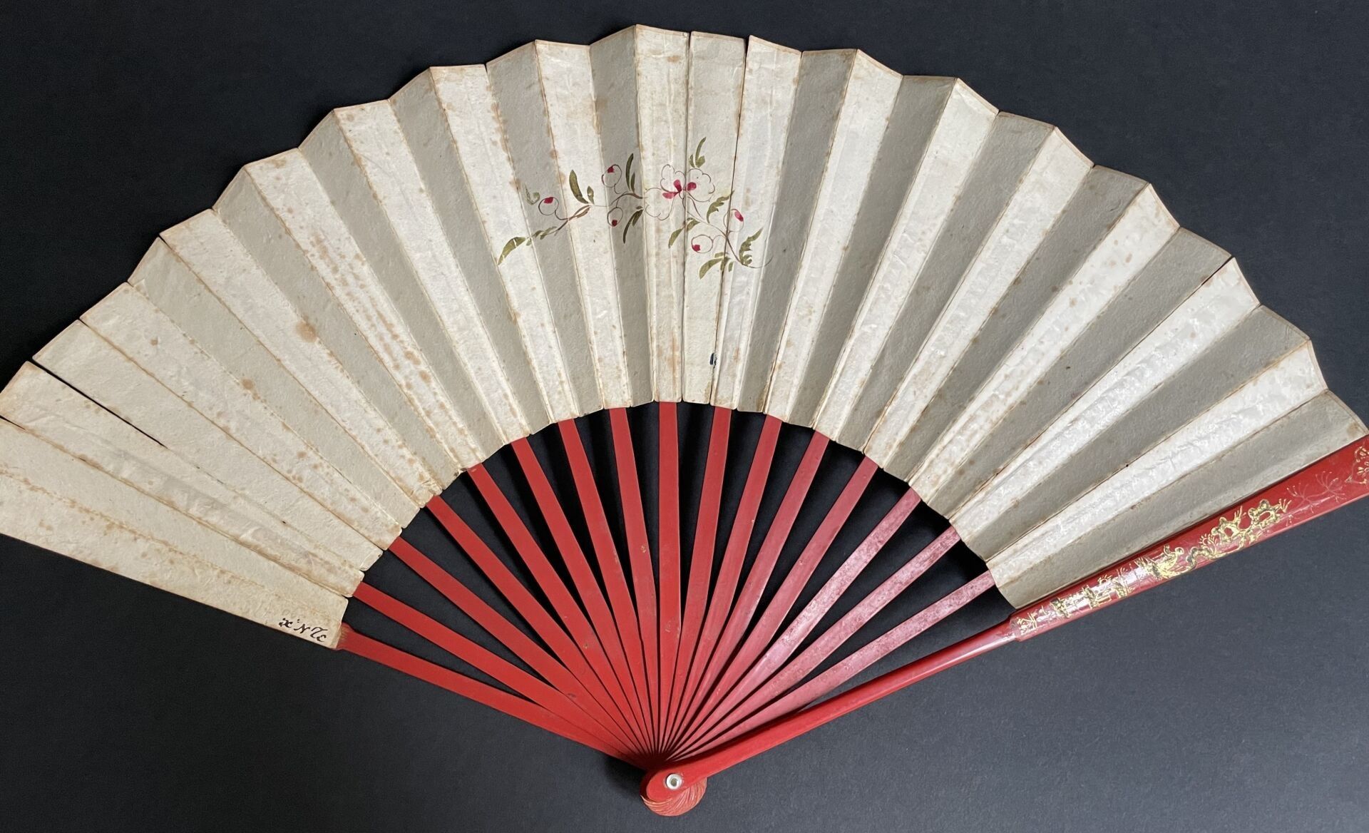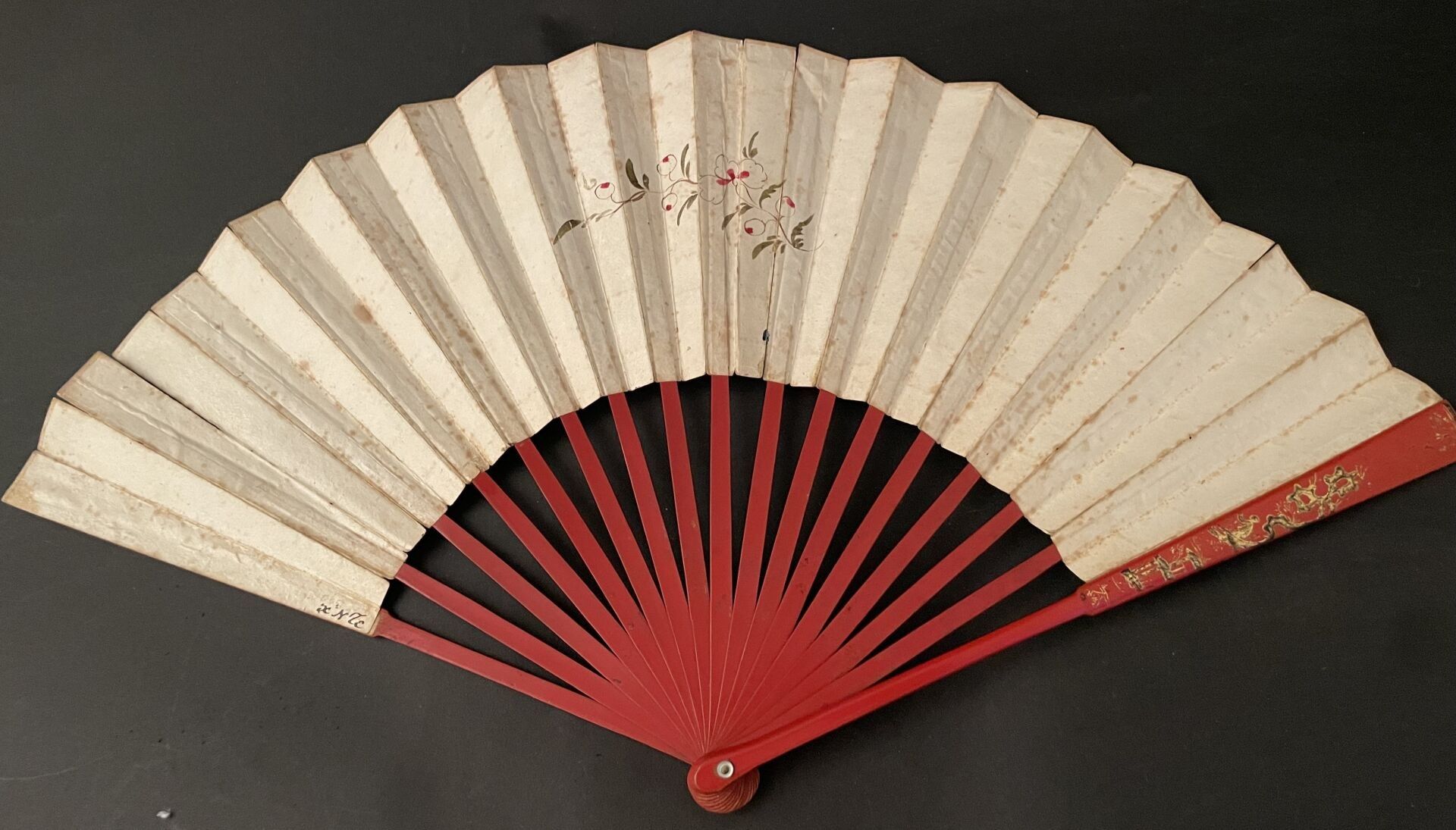 Folded fan, the double sheet of paper painted in the Chinese style with two figures in a garden.