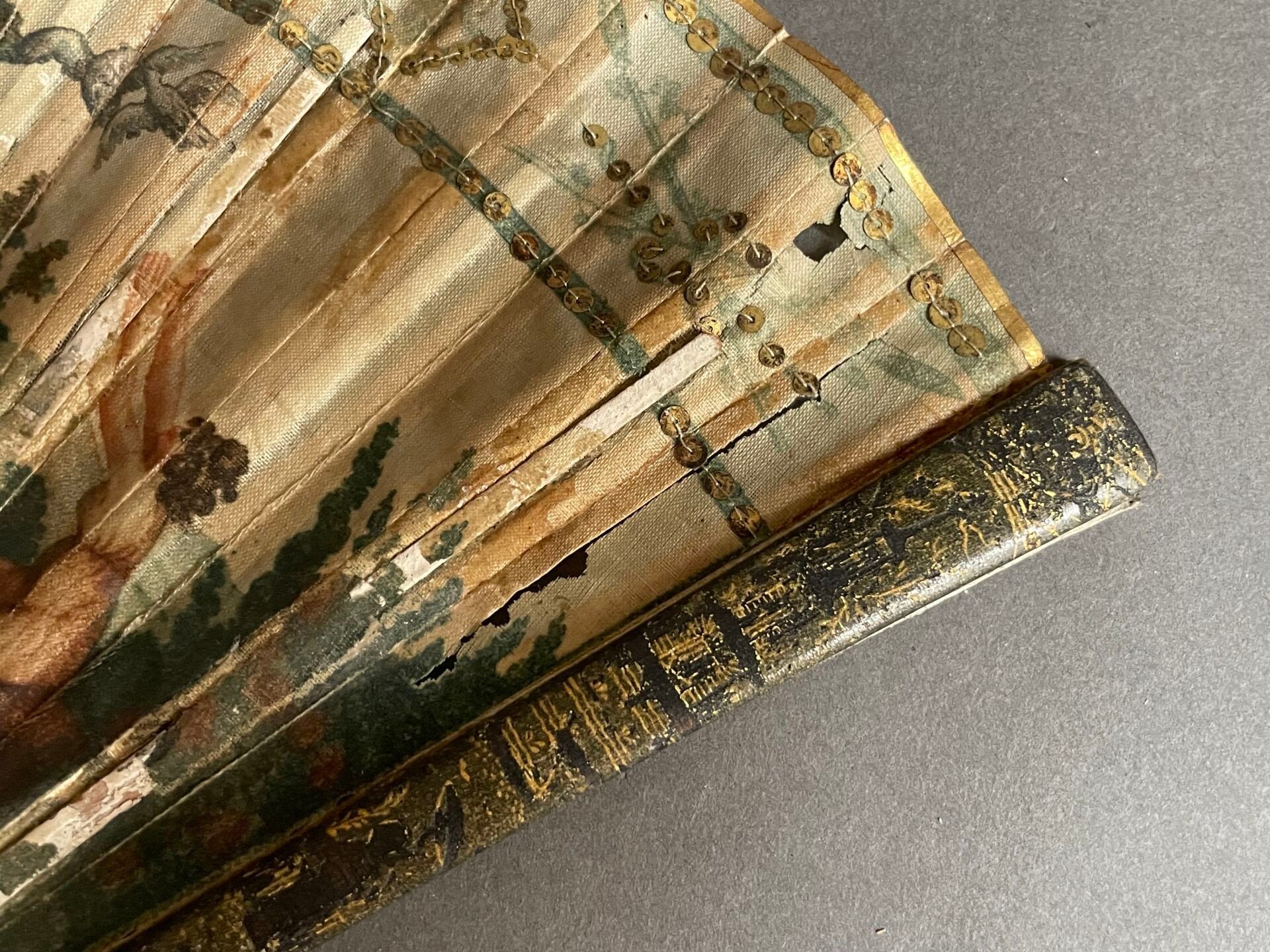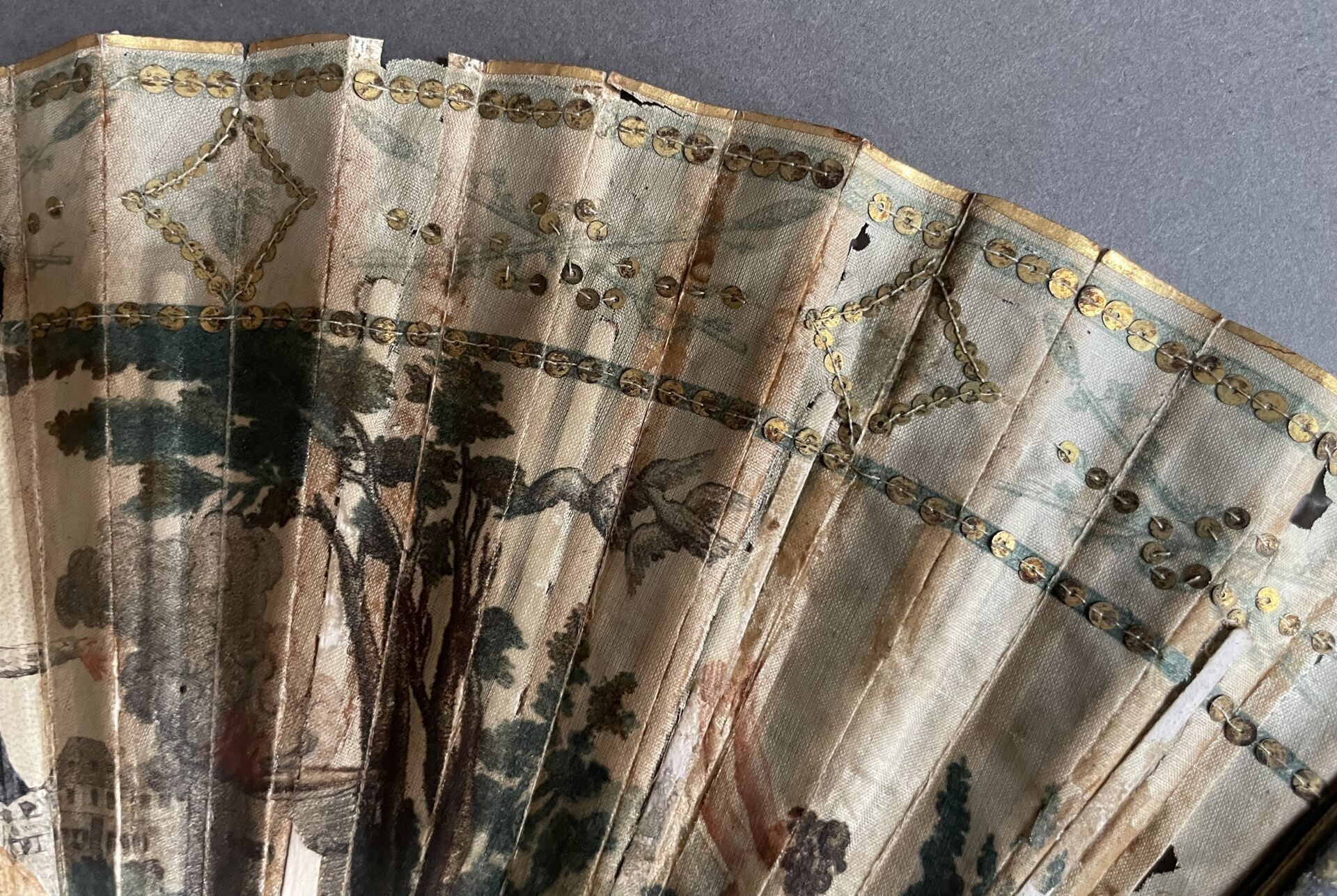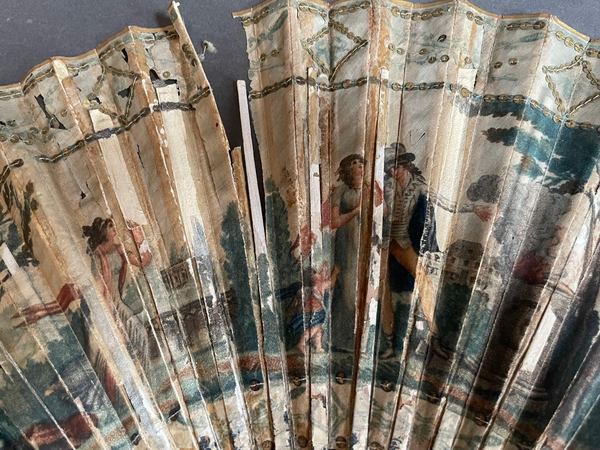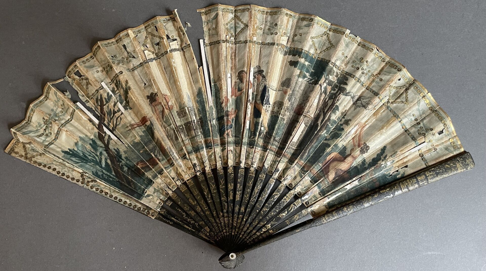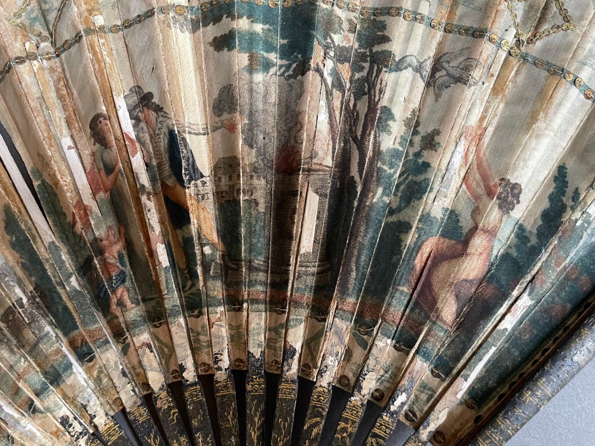 Folded fan, the beige silk leaf engraved in colour with supplications and oaths to Love.