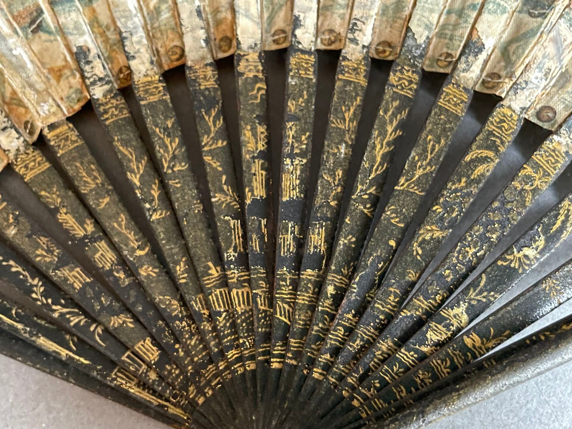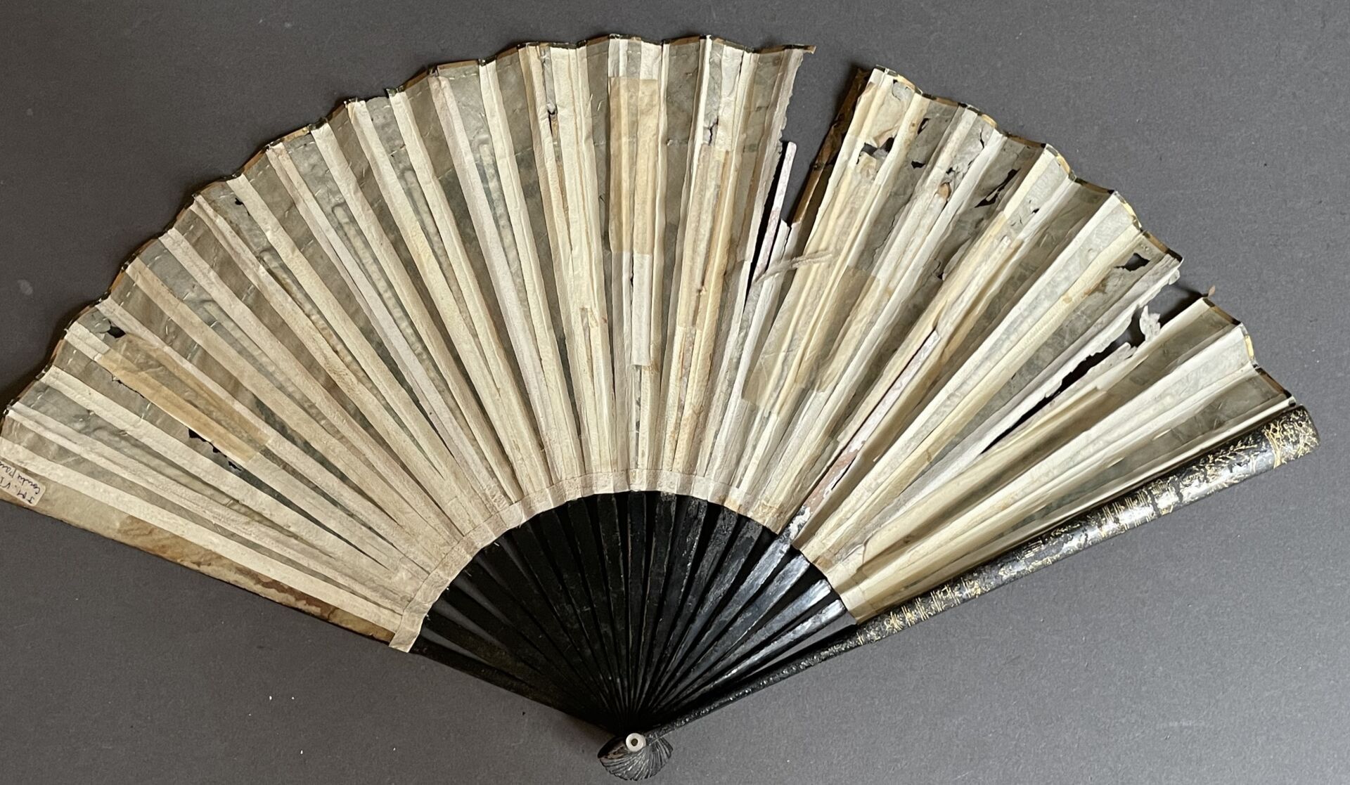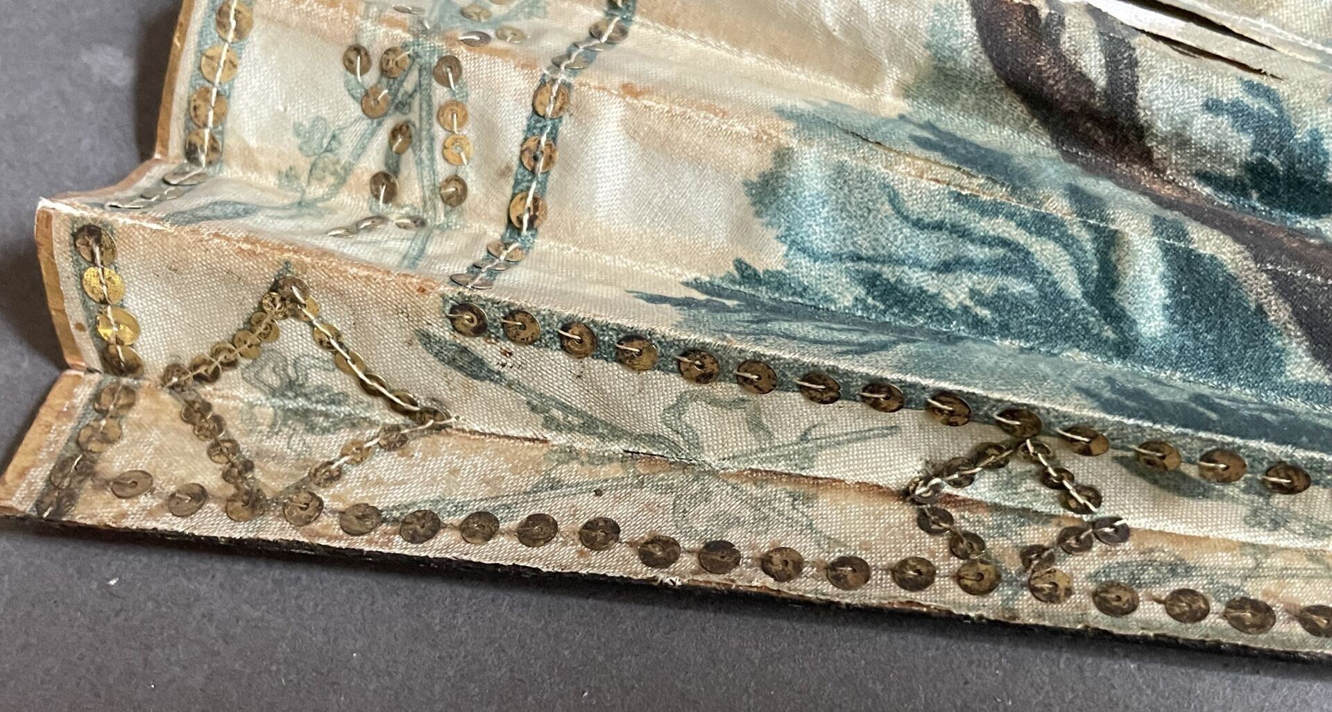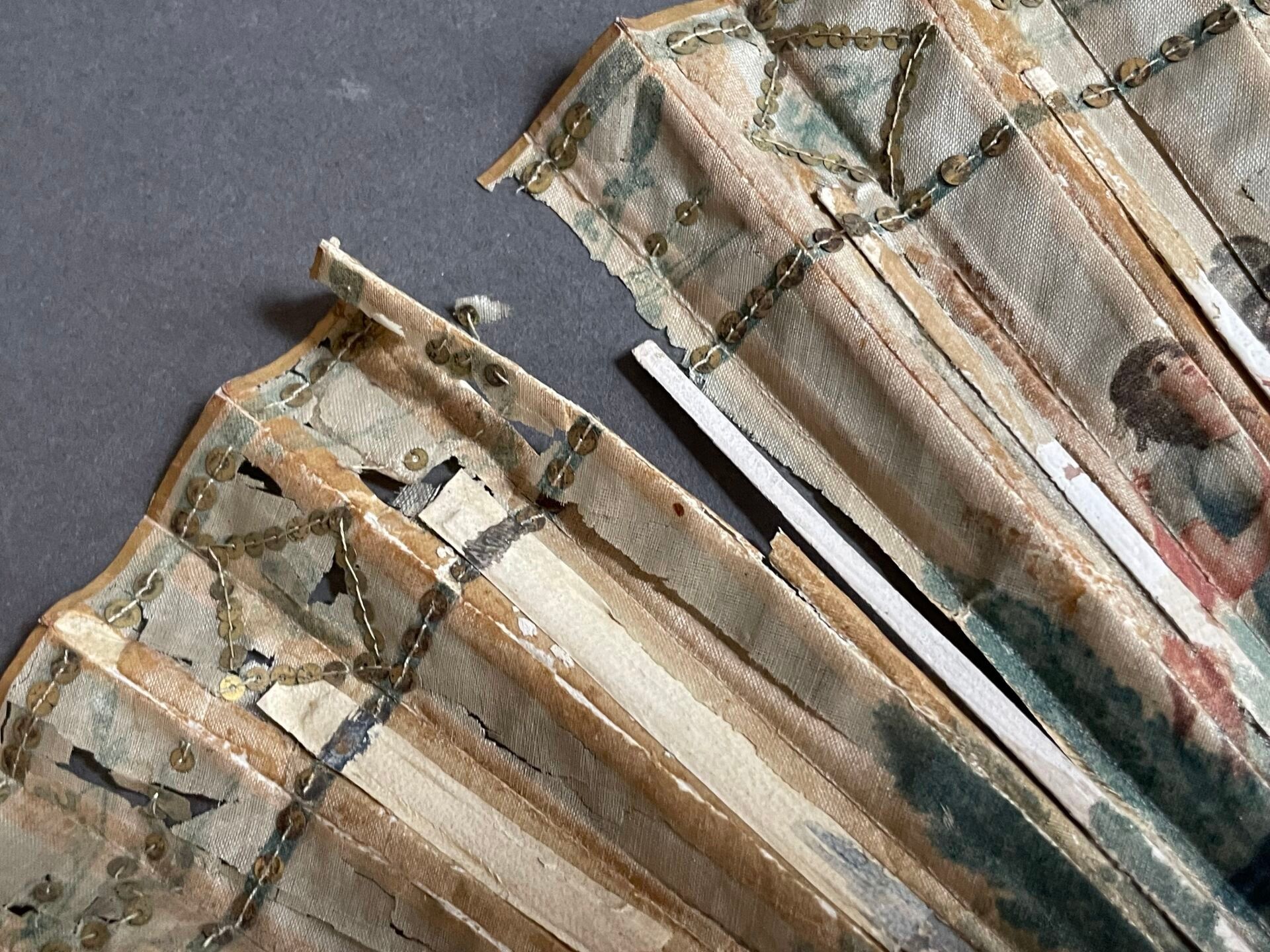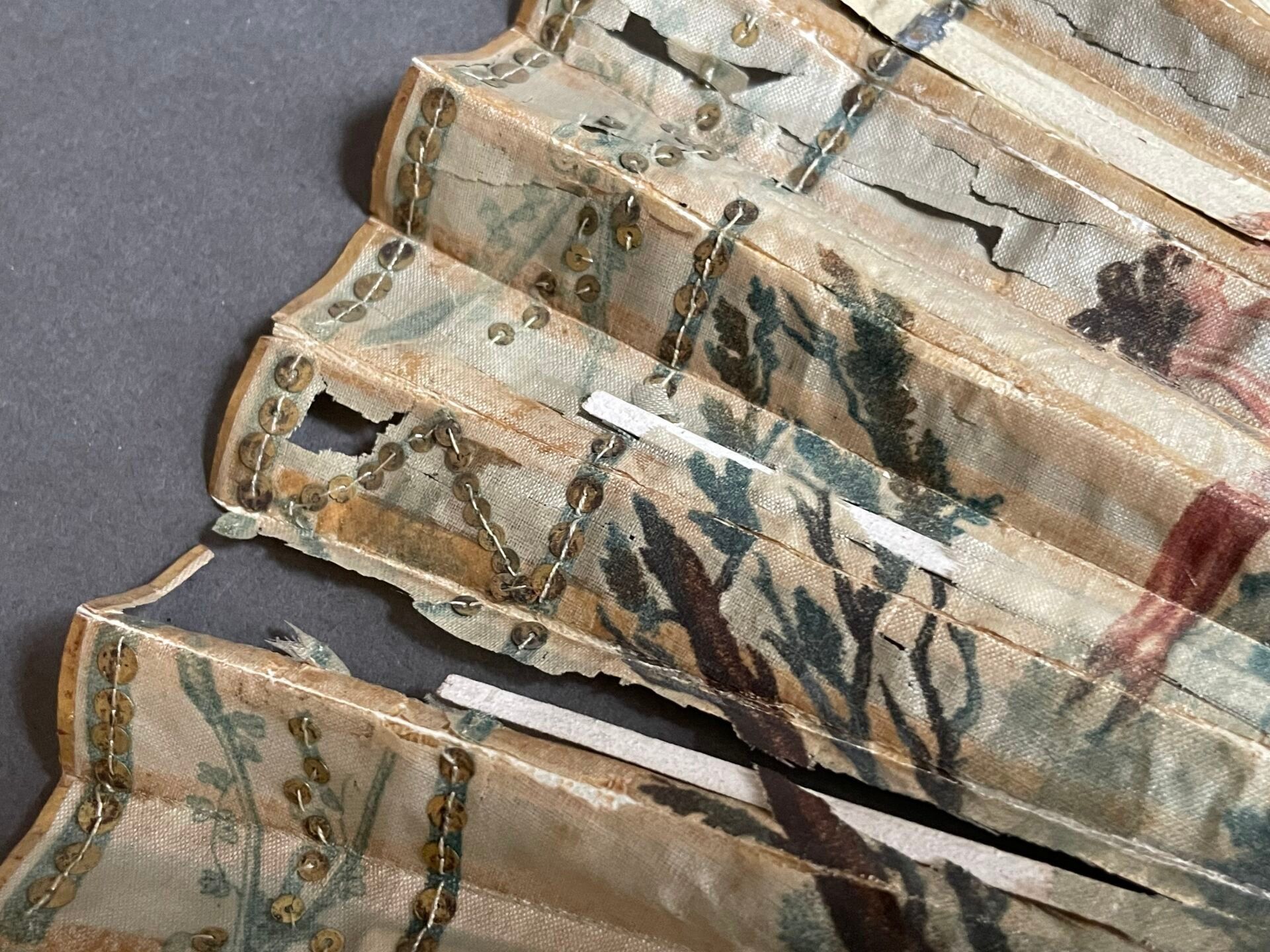 Folded fan, the beige silk leaf engraved in colour with supplications and oaths to Love.