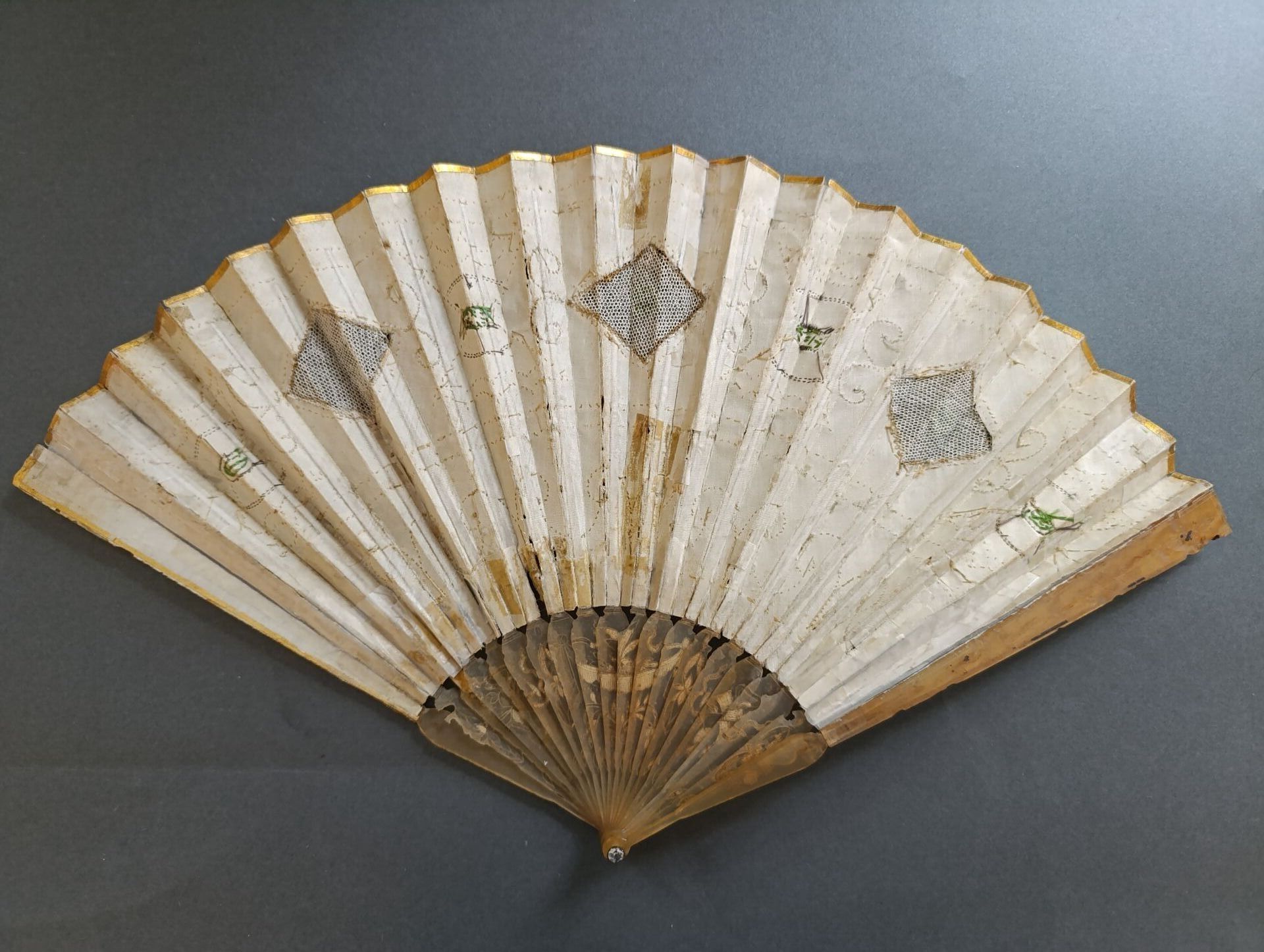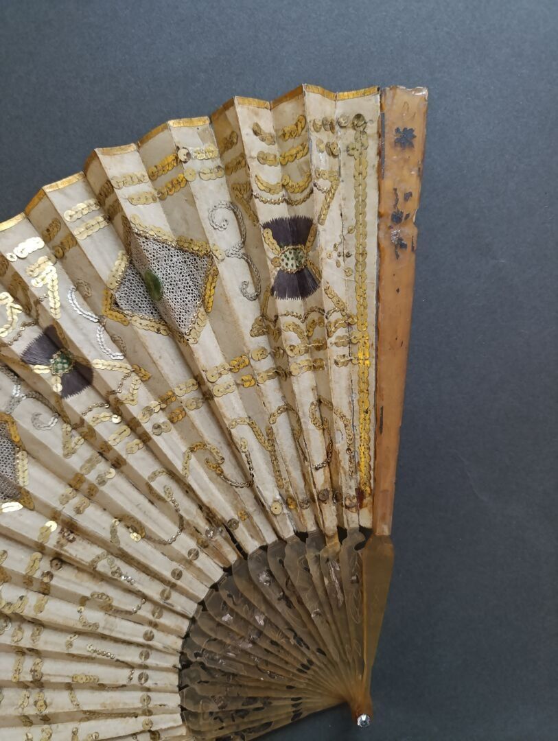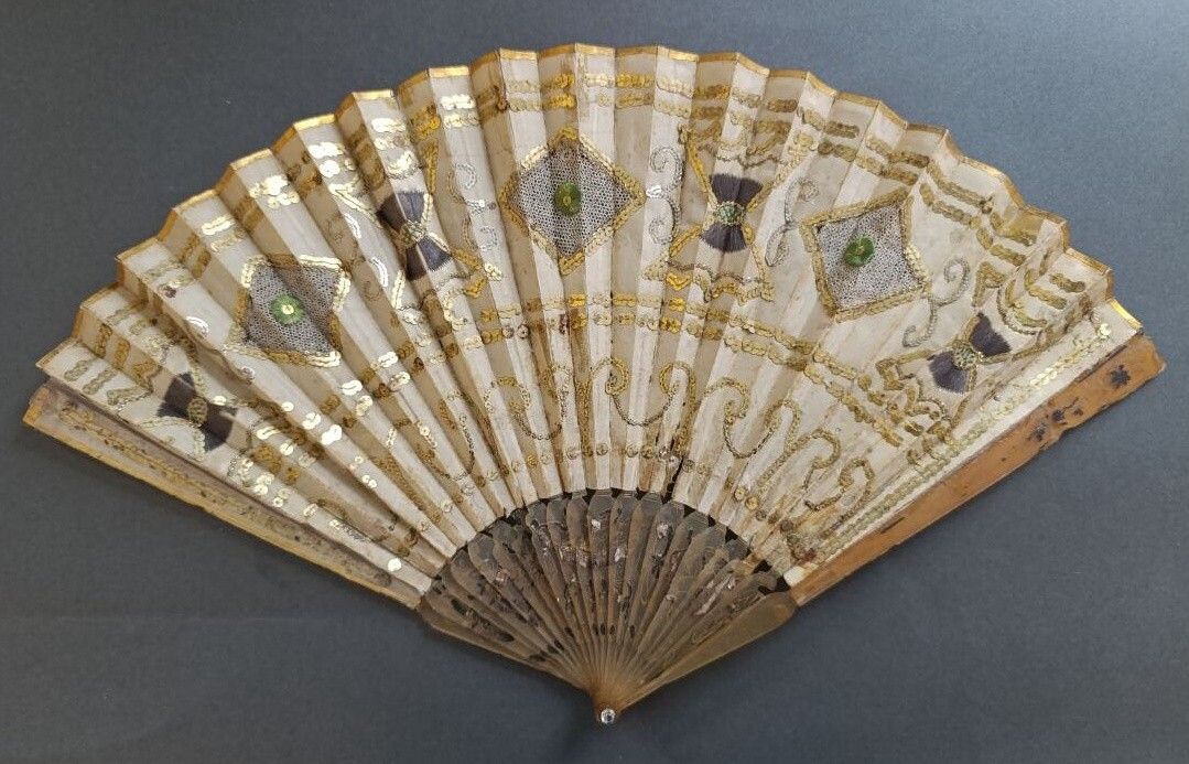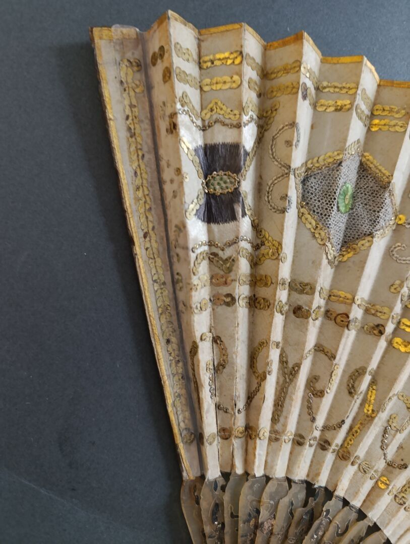 Folded fan, the silk leaf embroidered with gold sequins, opened by tulle windows and enriched with embroidery.