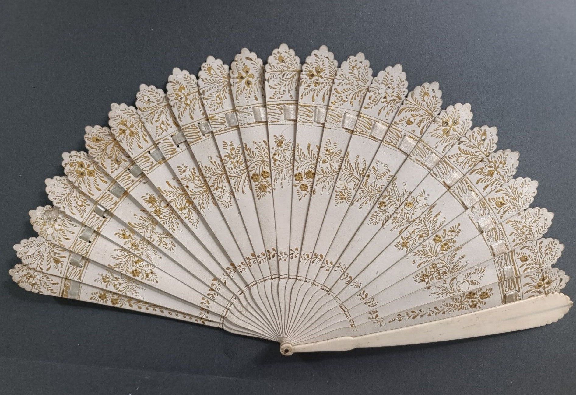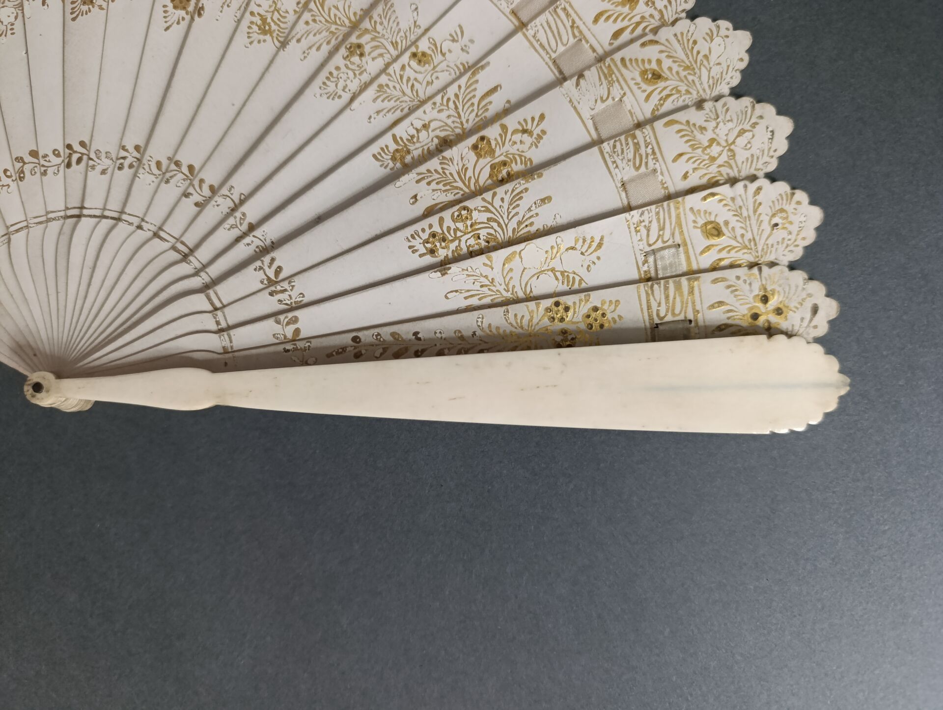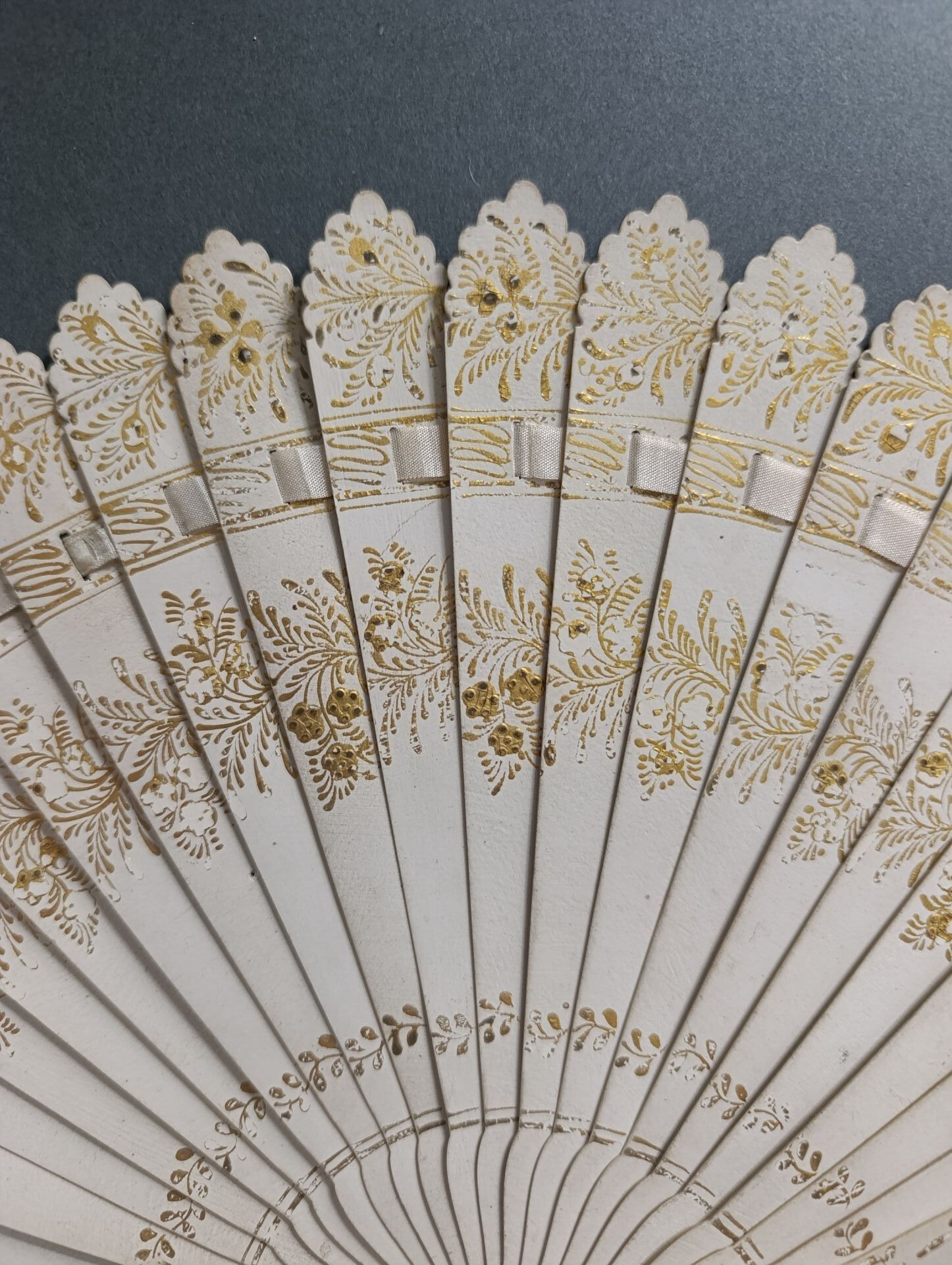Folded fan, ball book, sheet of prepared "donkey skin" paper decorated with two garlands of gilded foliage.