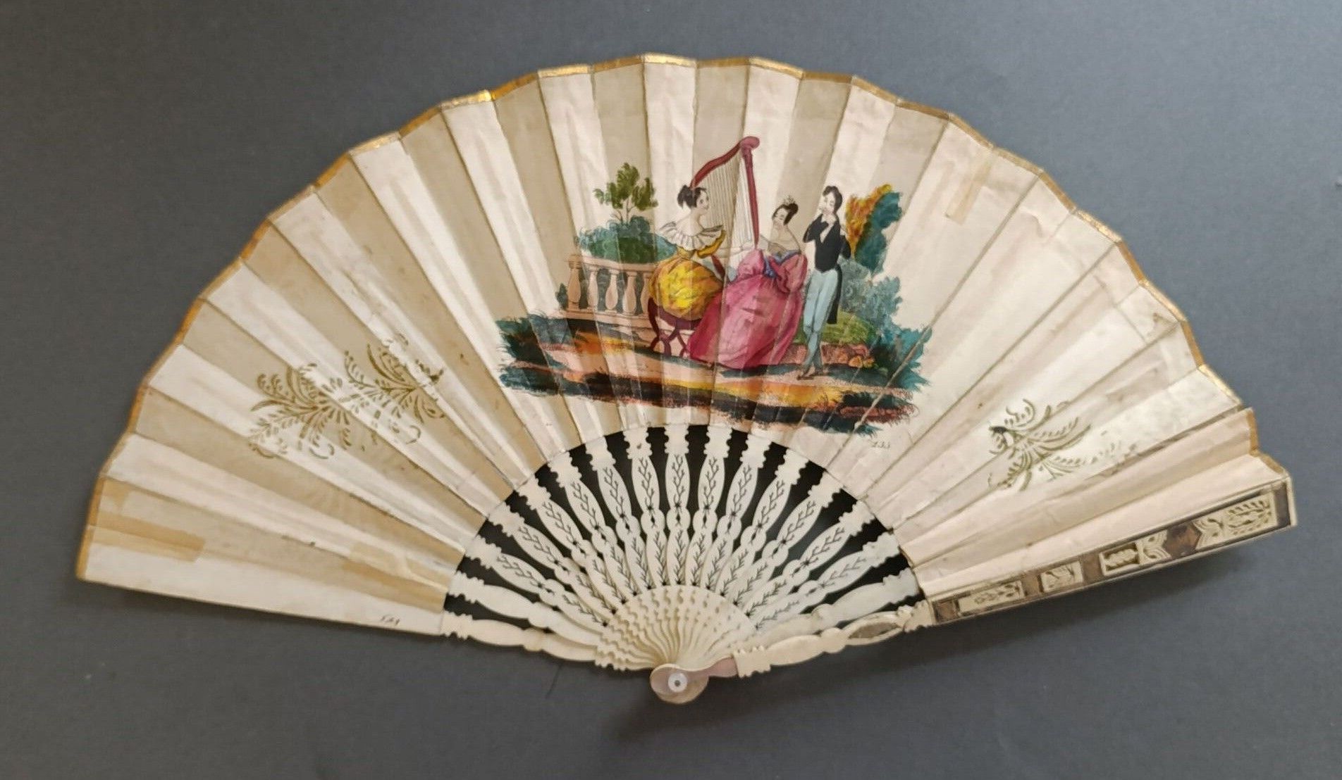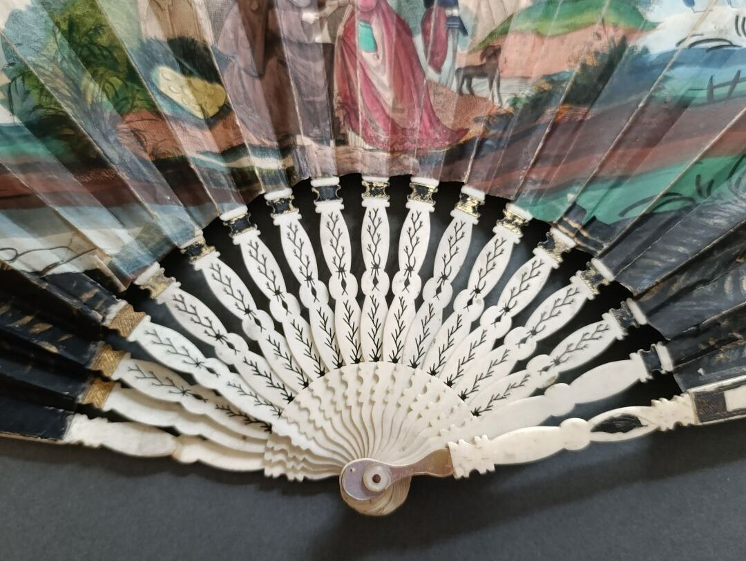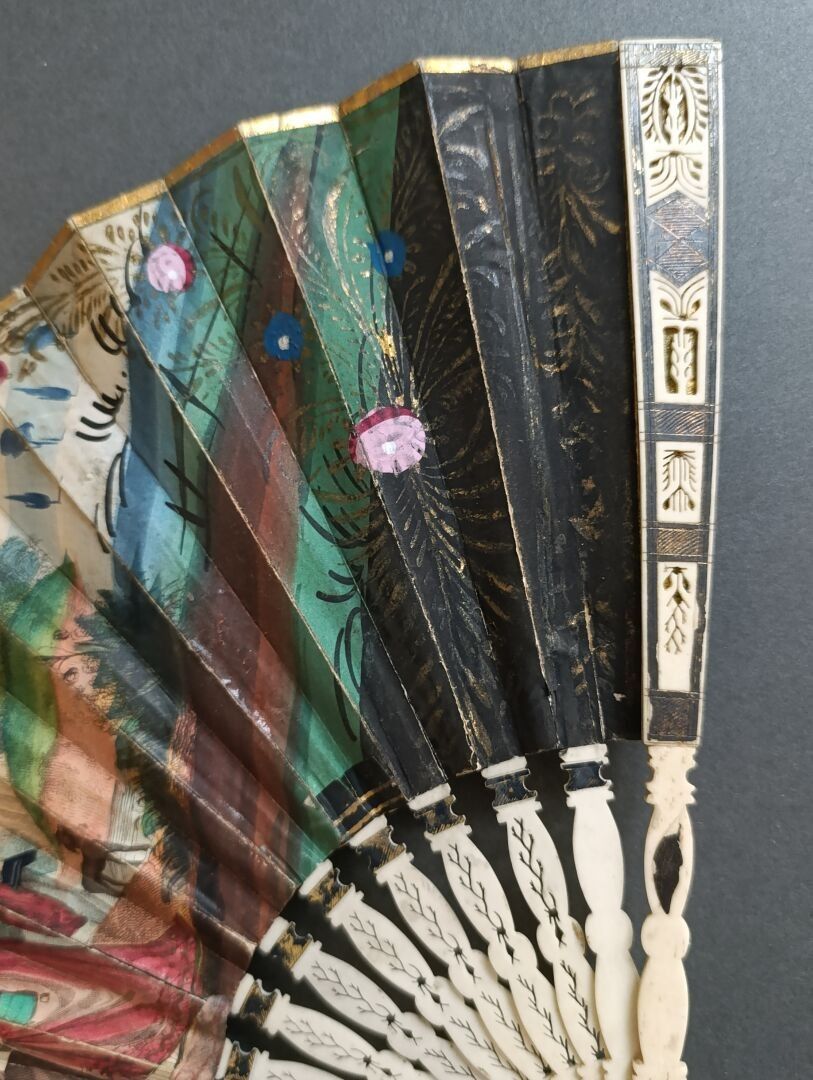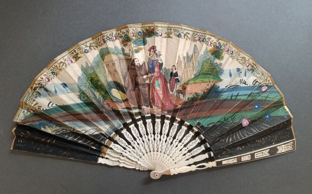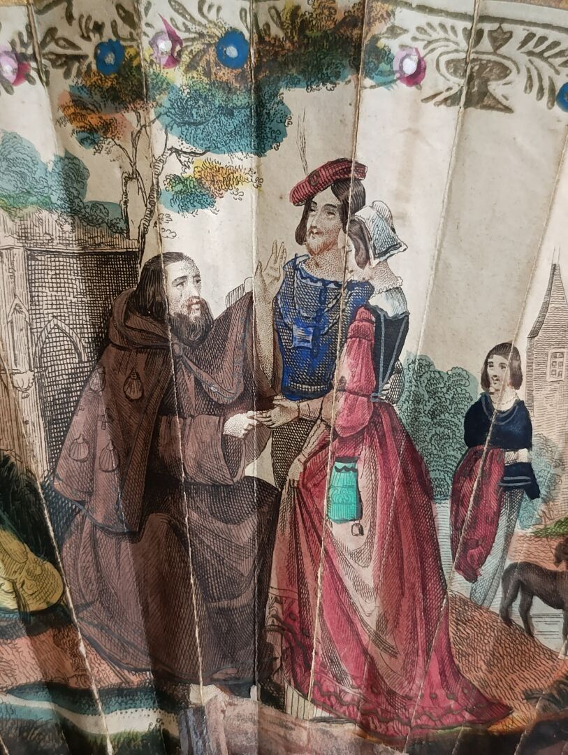 Folded fan, the double sheet in engraved and enhanced paper with Saint James wearing a pilgrim's habit adorned with scallops, blessing a couple of squires, dressed in medieval fashion.