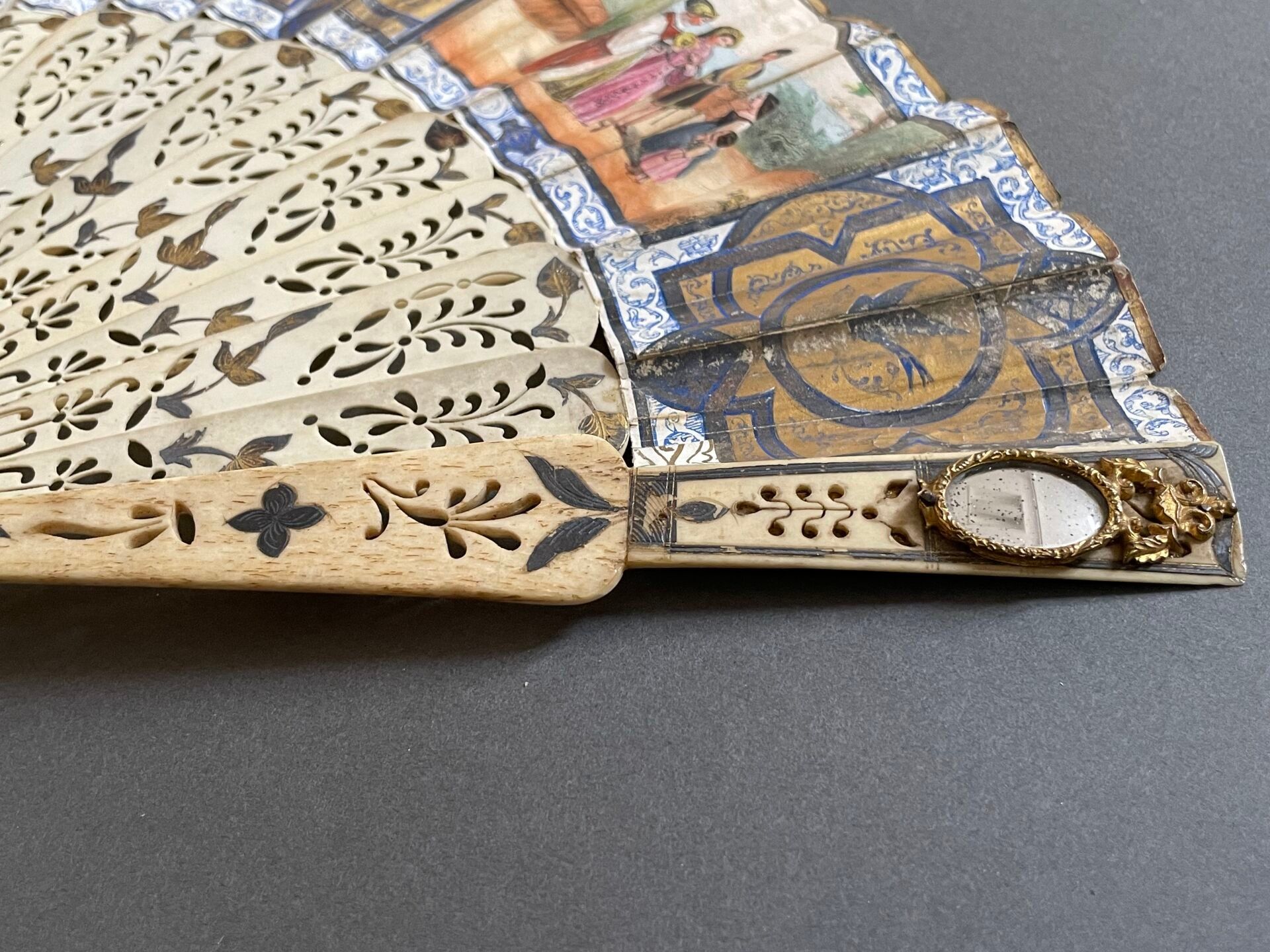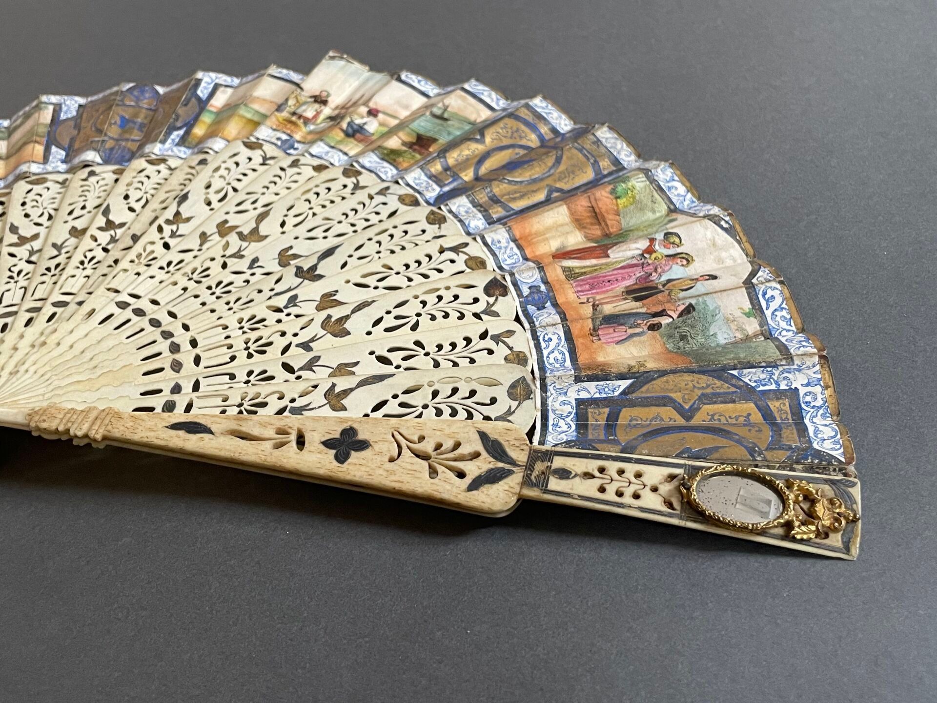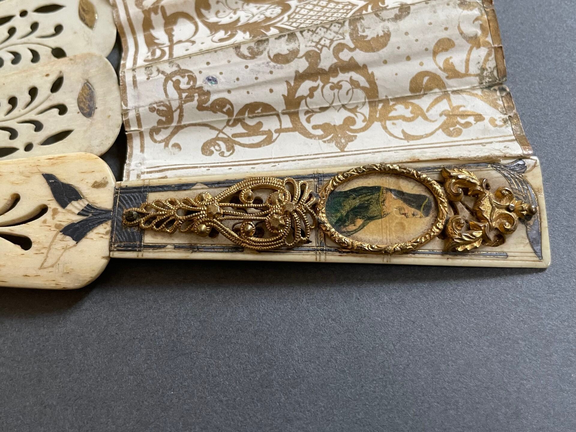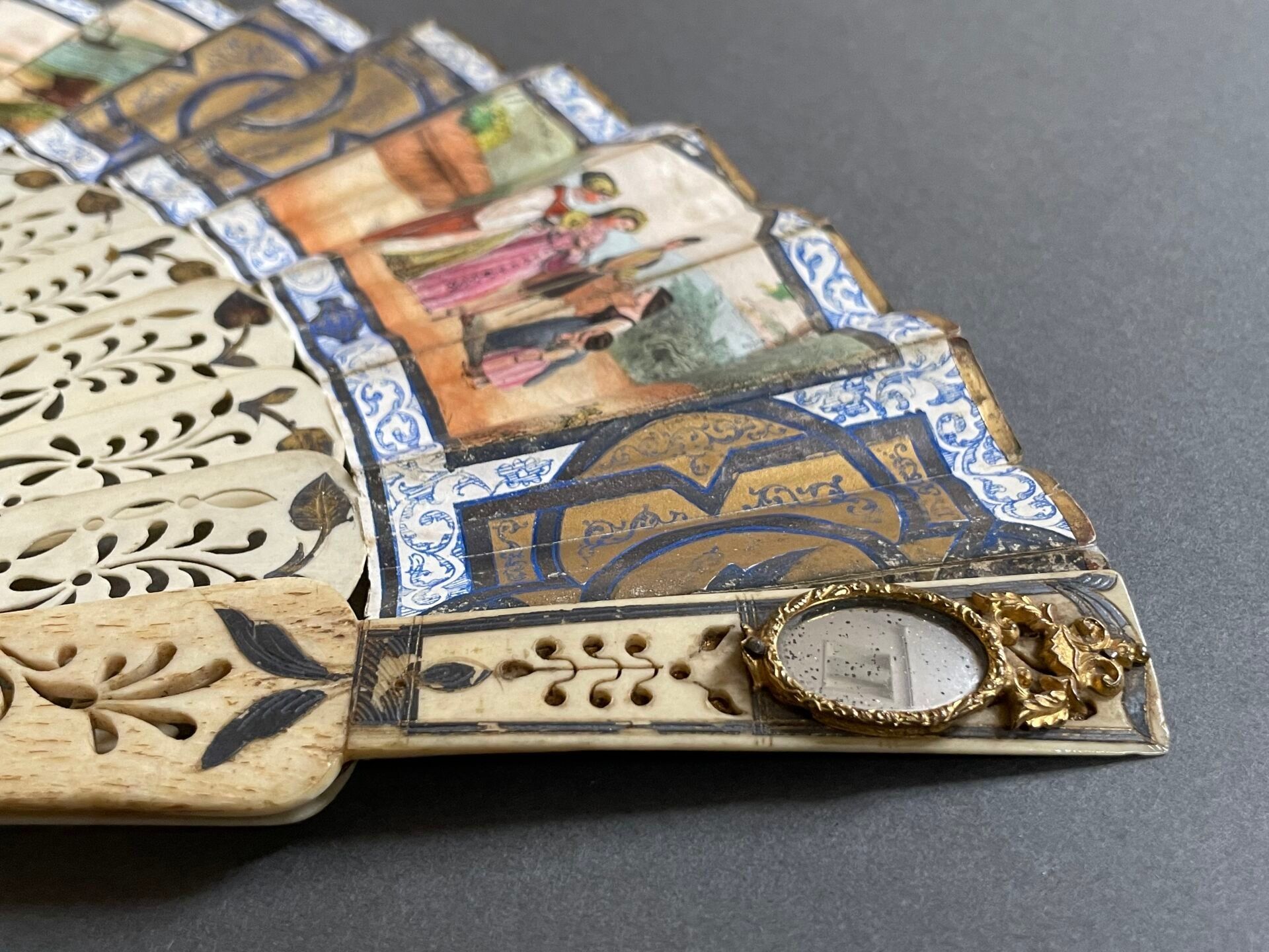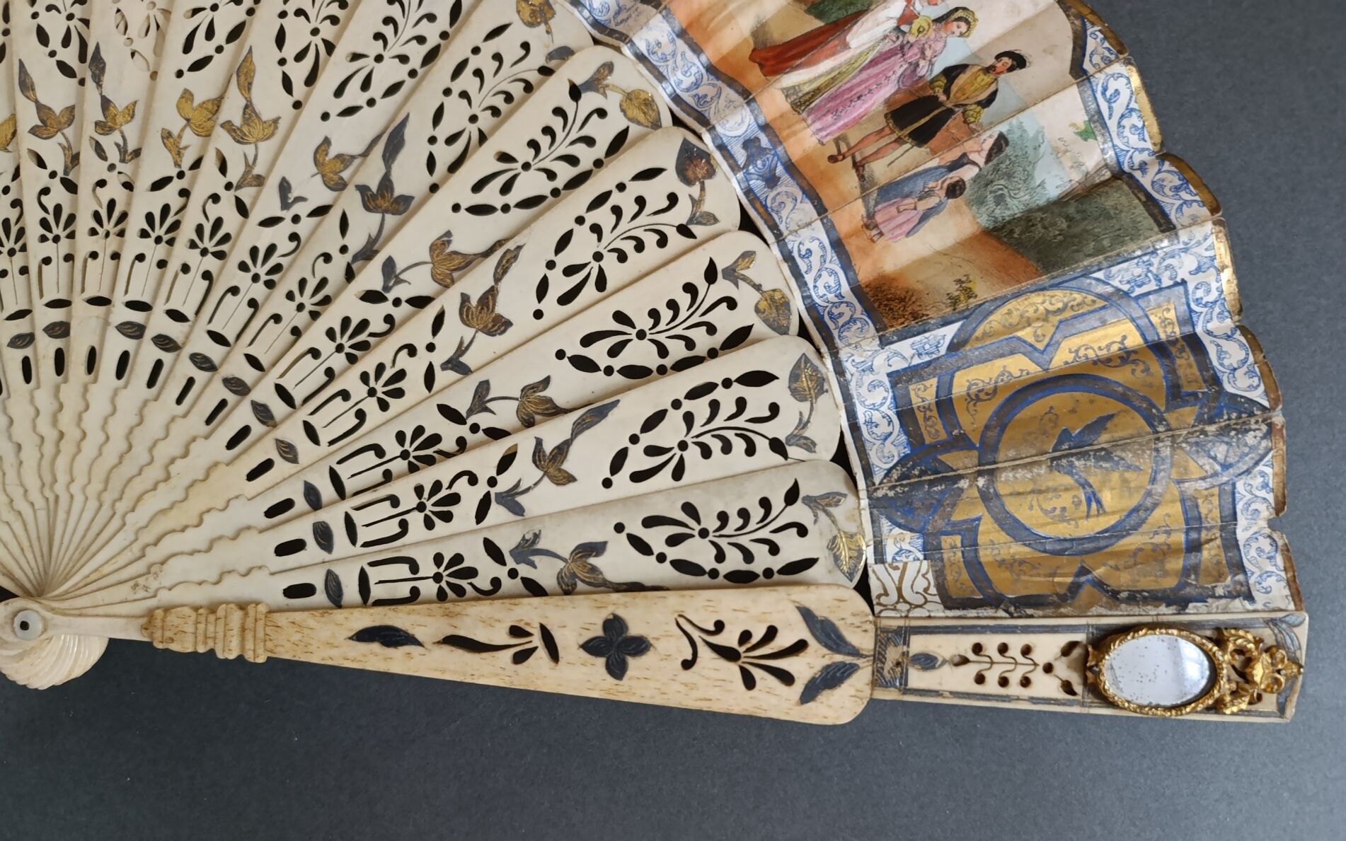 Mounted in engraved and gilded pierced bone. The plume adorned with a mirror, the reverse decorated with a miniature.