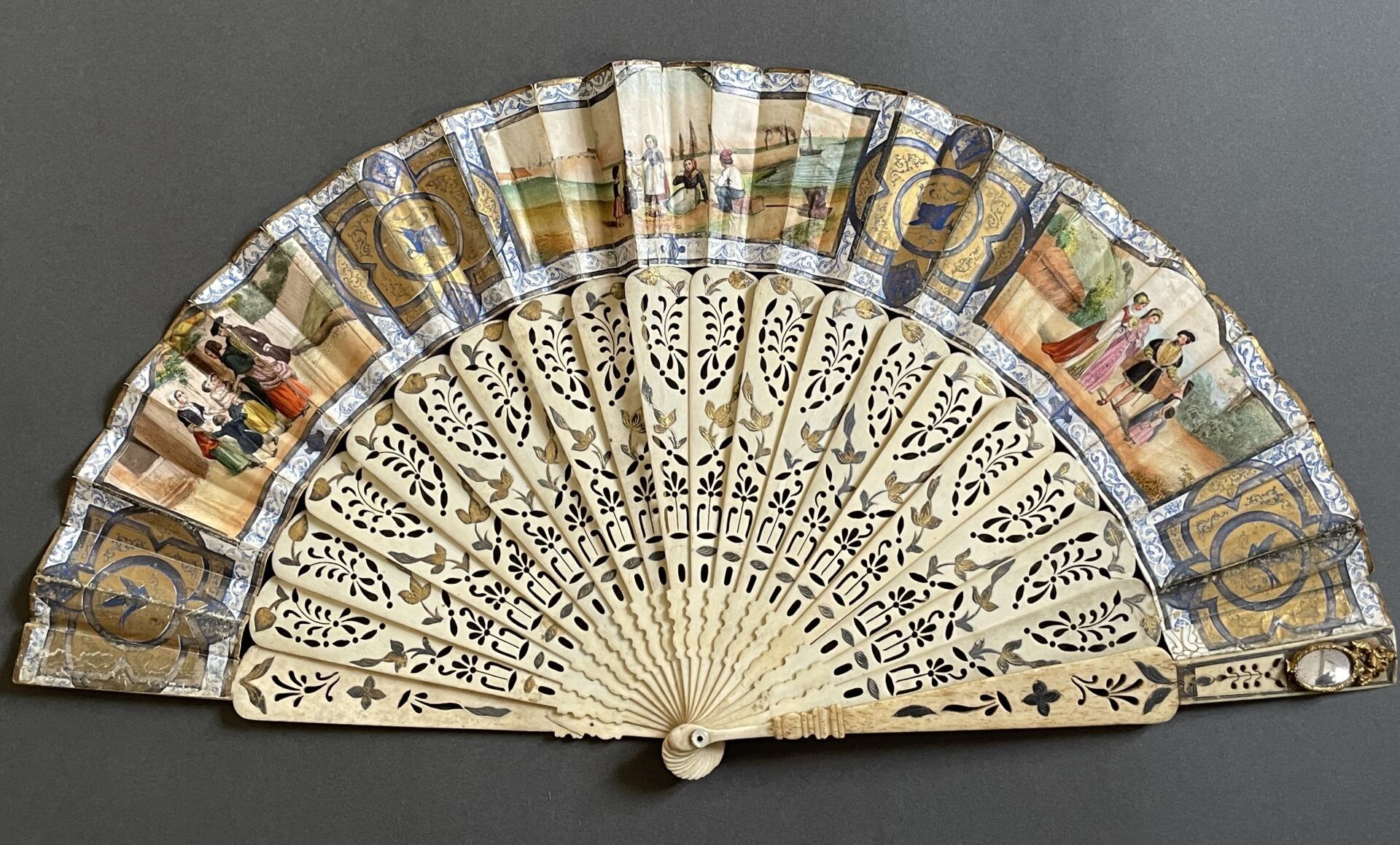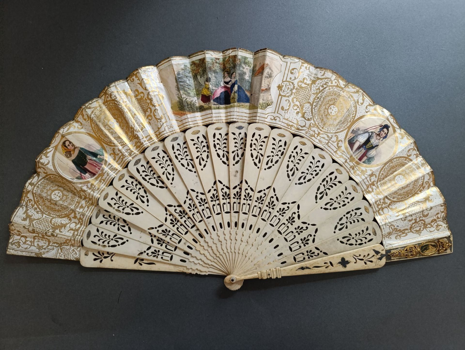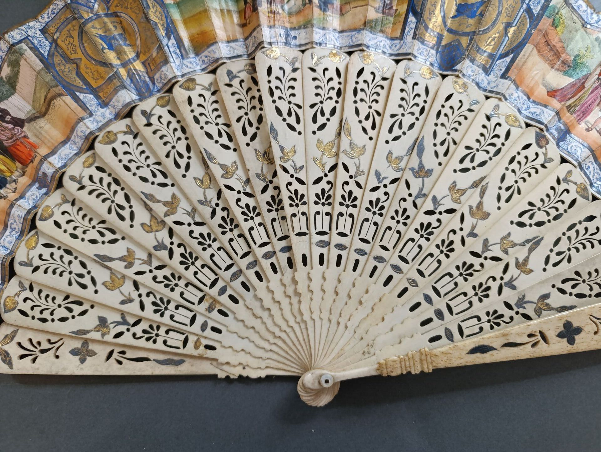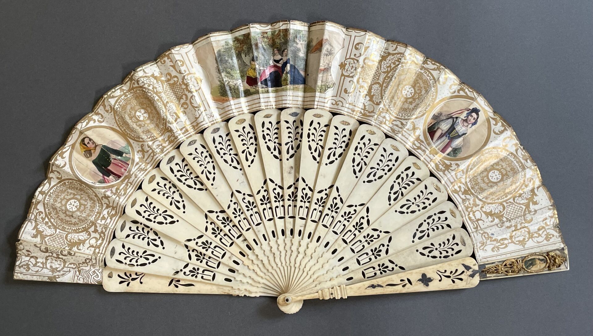 Mounted in engraved and gilded pierced bone. The plume adorned with a mirror, the reverse decorated with a miniature.