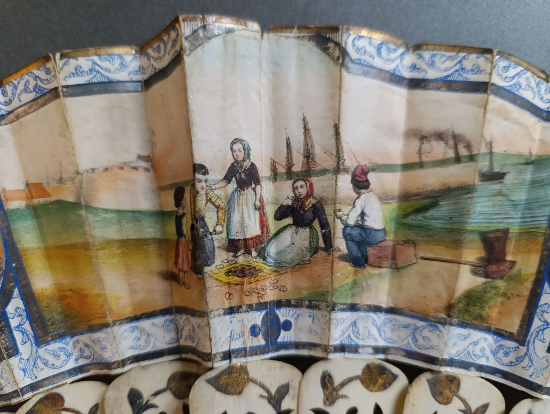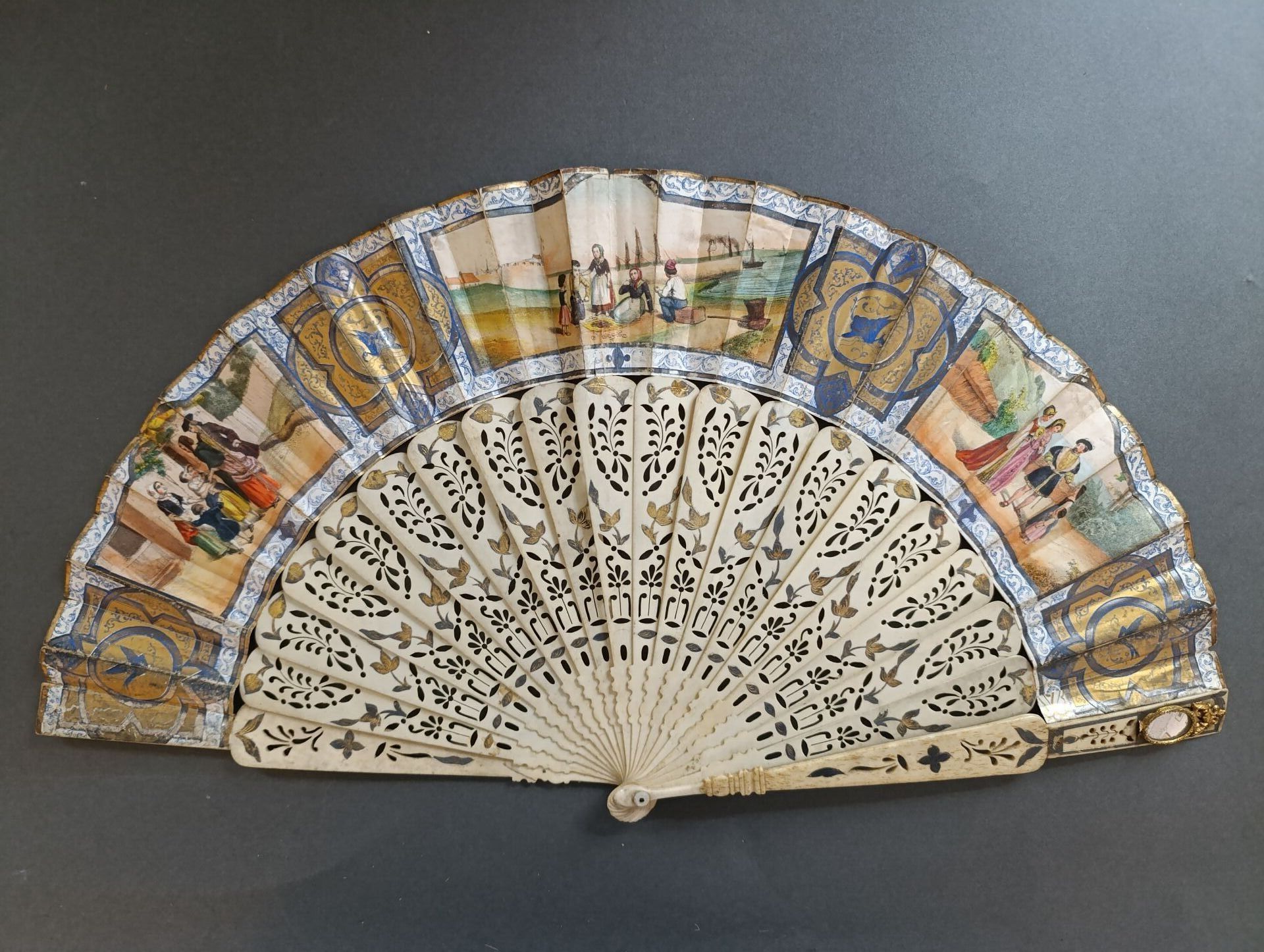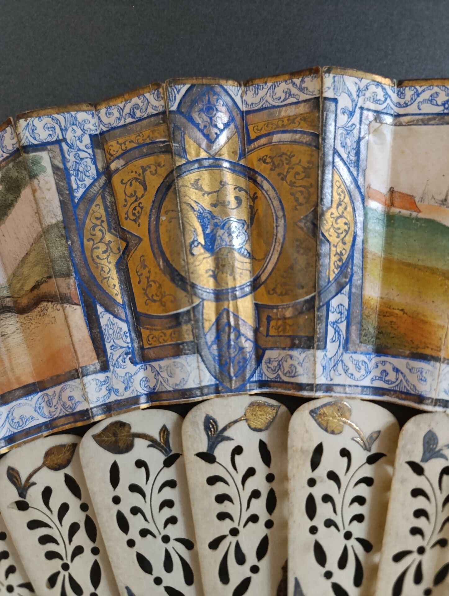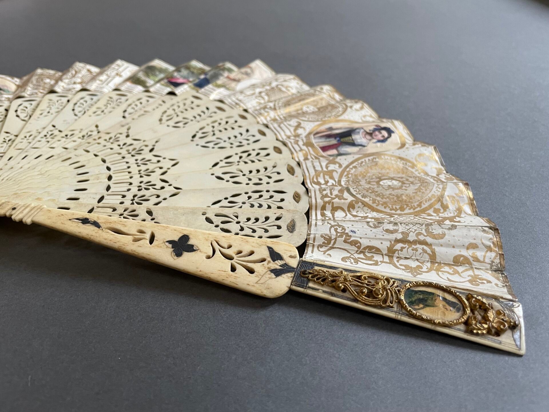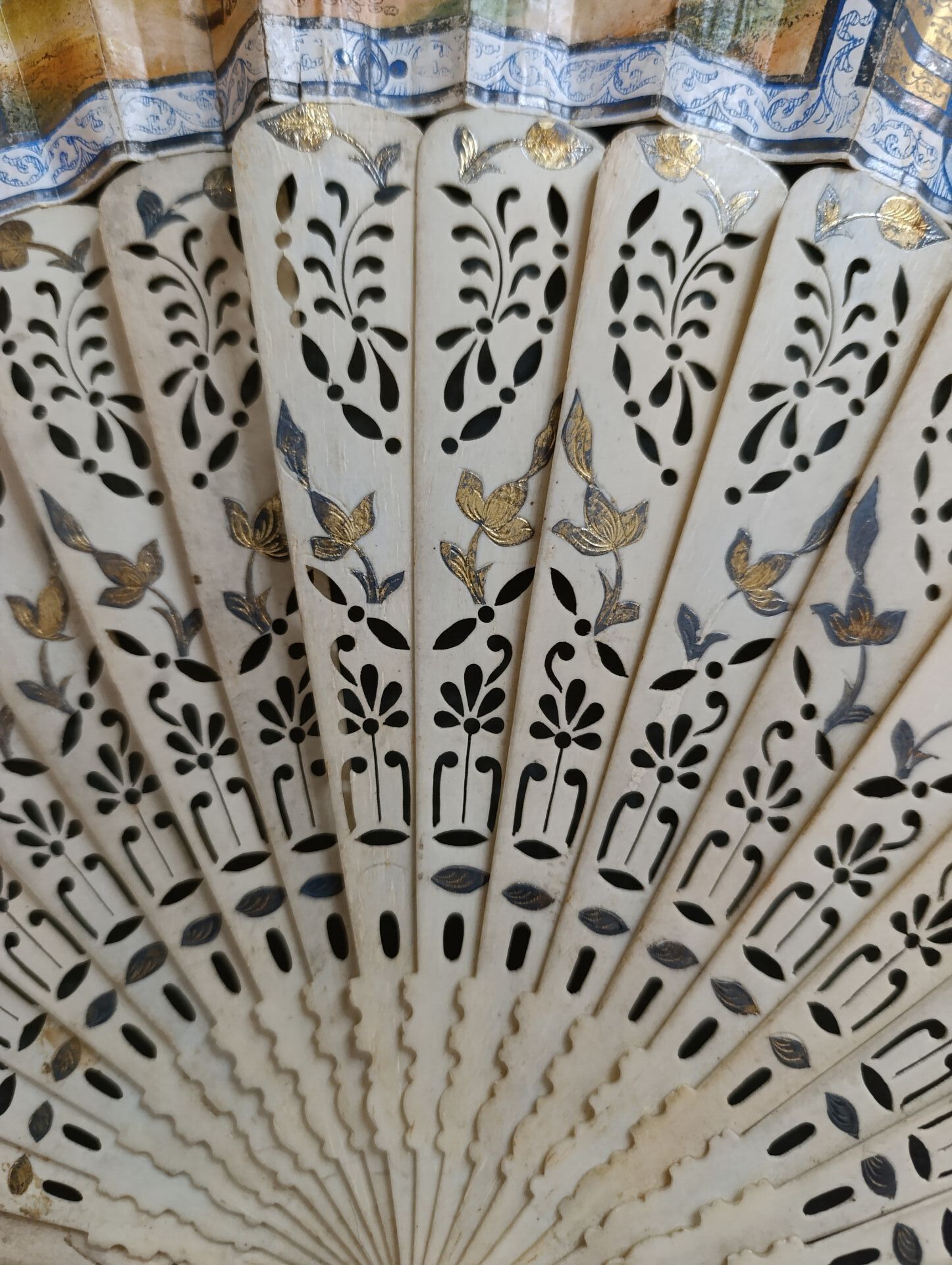 Mounted in engraved and gilded pierced bone. The plume adorned with a mirror, the reverse decorated with a miniature.