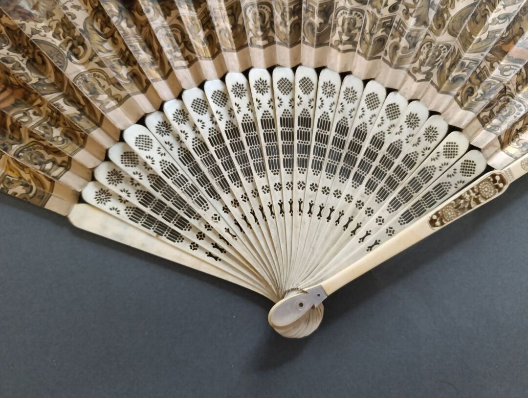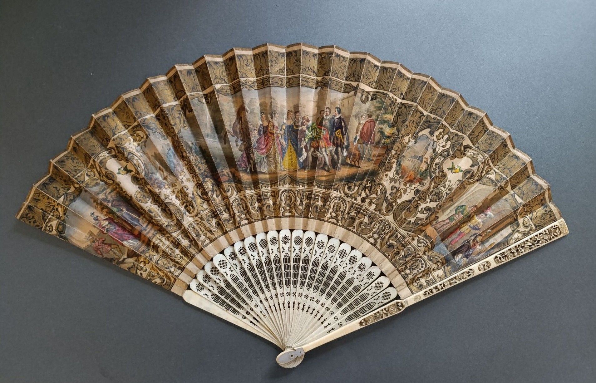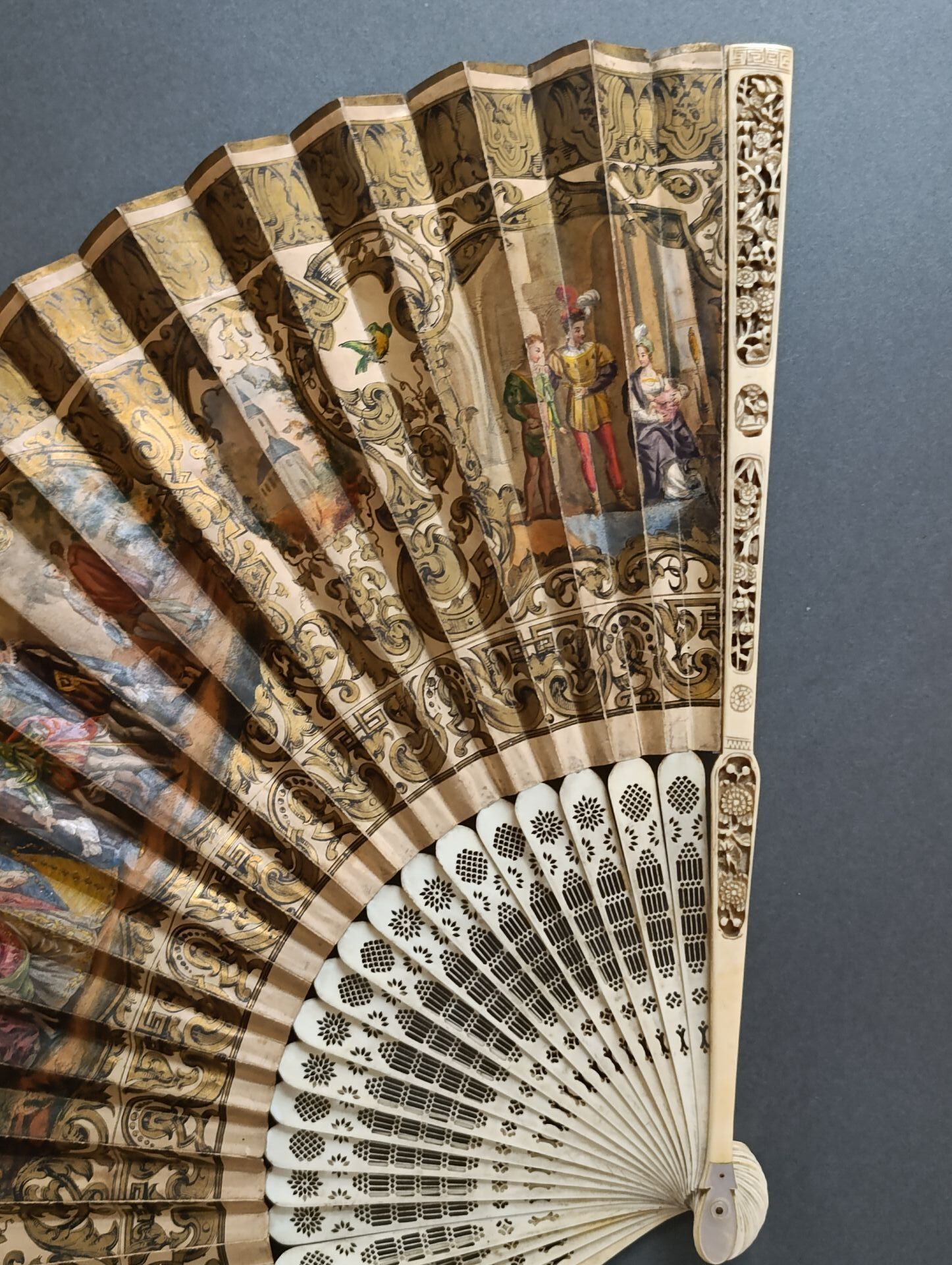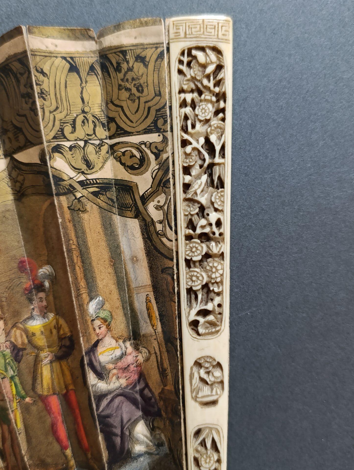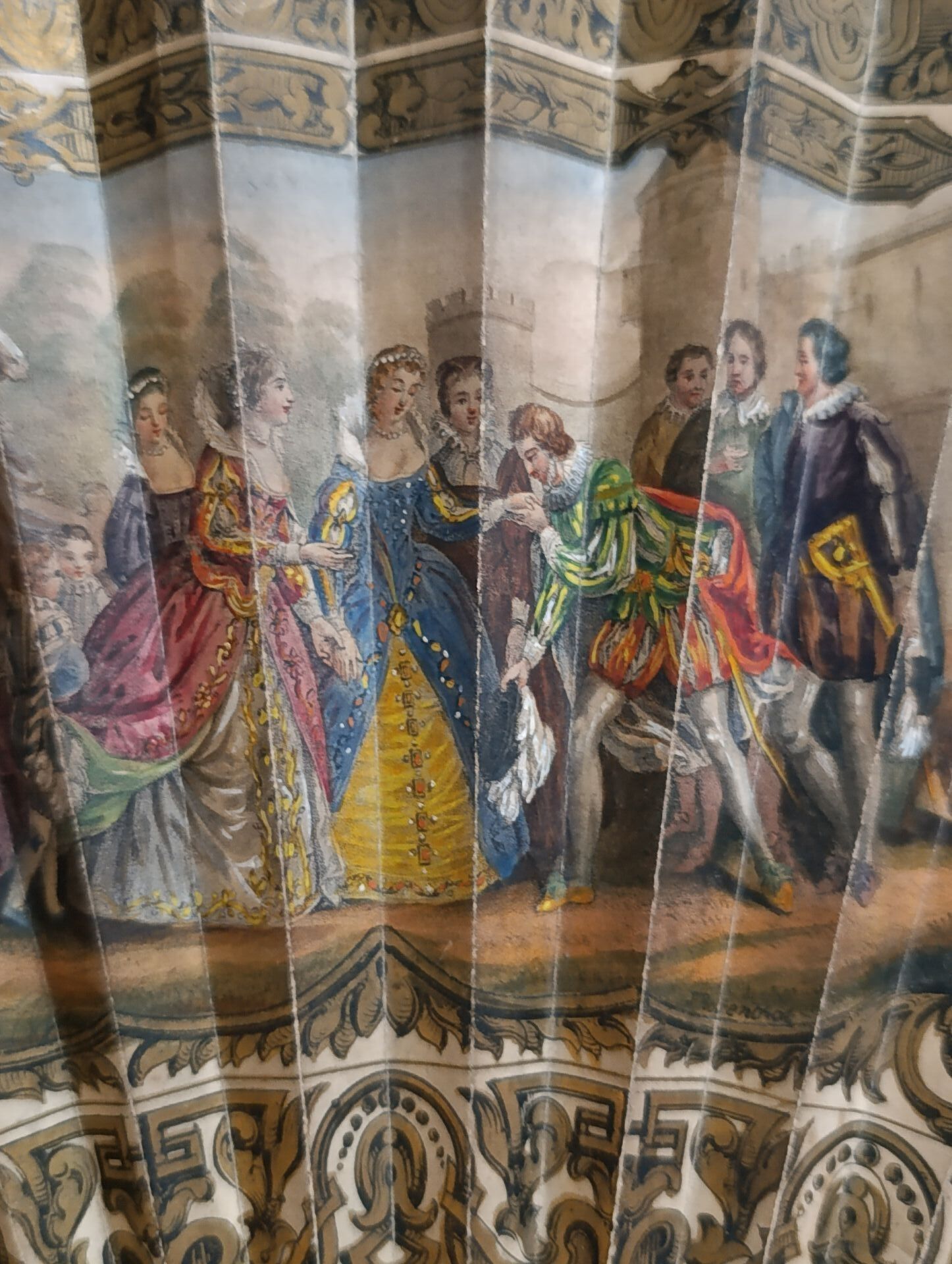A folded fan with a double sheet of lithographed paper showing three scenes inspired by medieval history. In the centre, a knight kisses the hand of a lady of quality surrounded by a court. The engraver's name can be read on the border "Rosenthal".