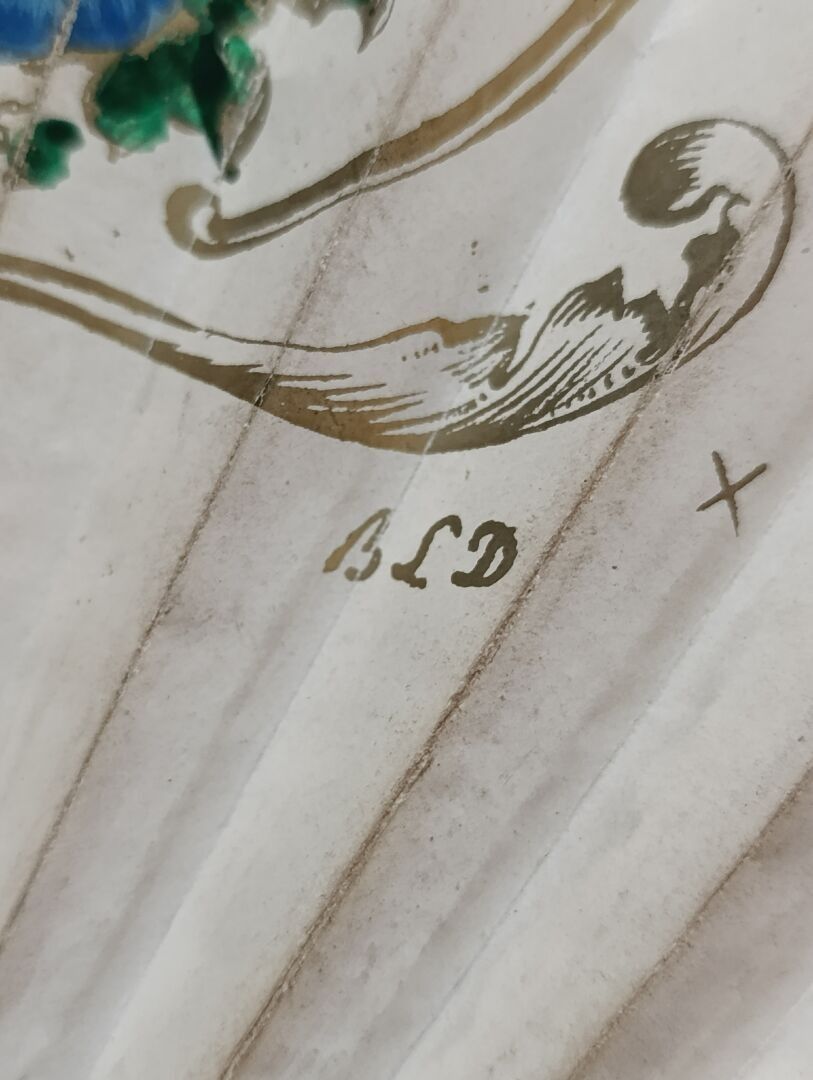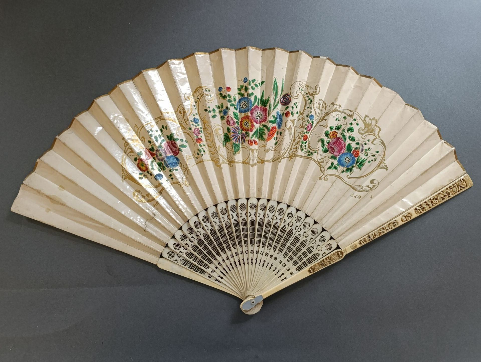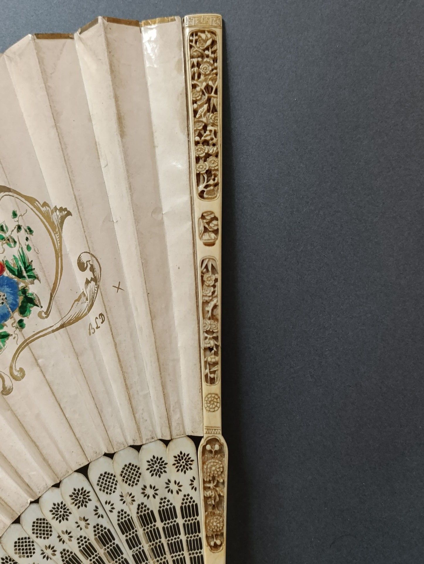 Mounted in finely carved imported ivory. The plumes are pierced, carved and engraved with flowers.