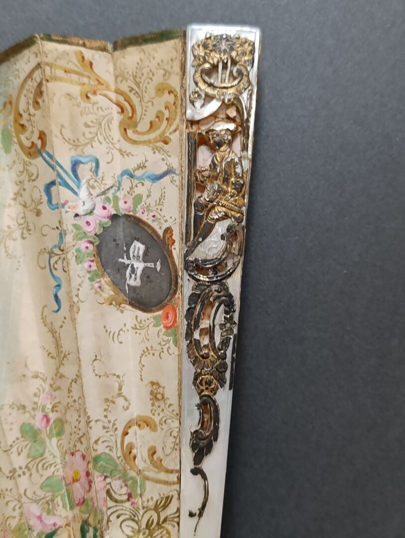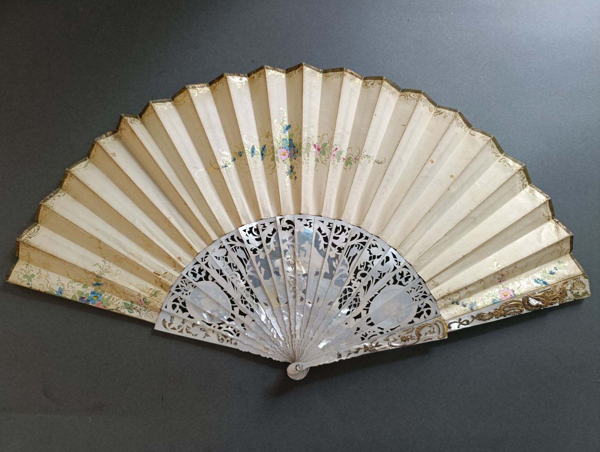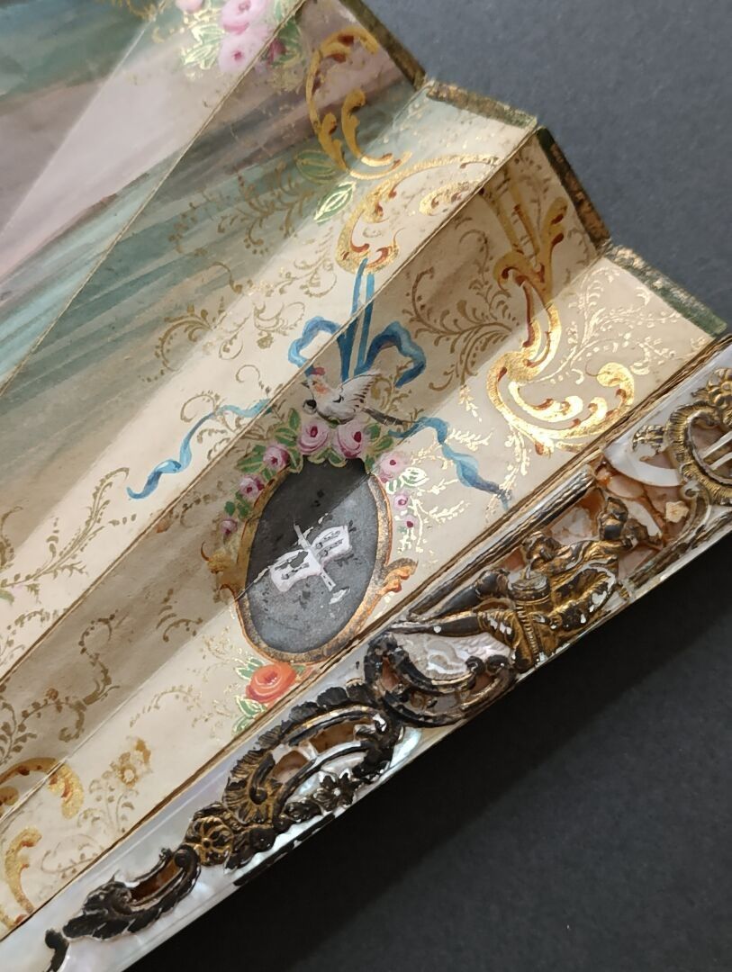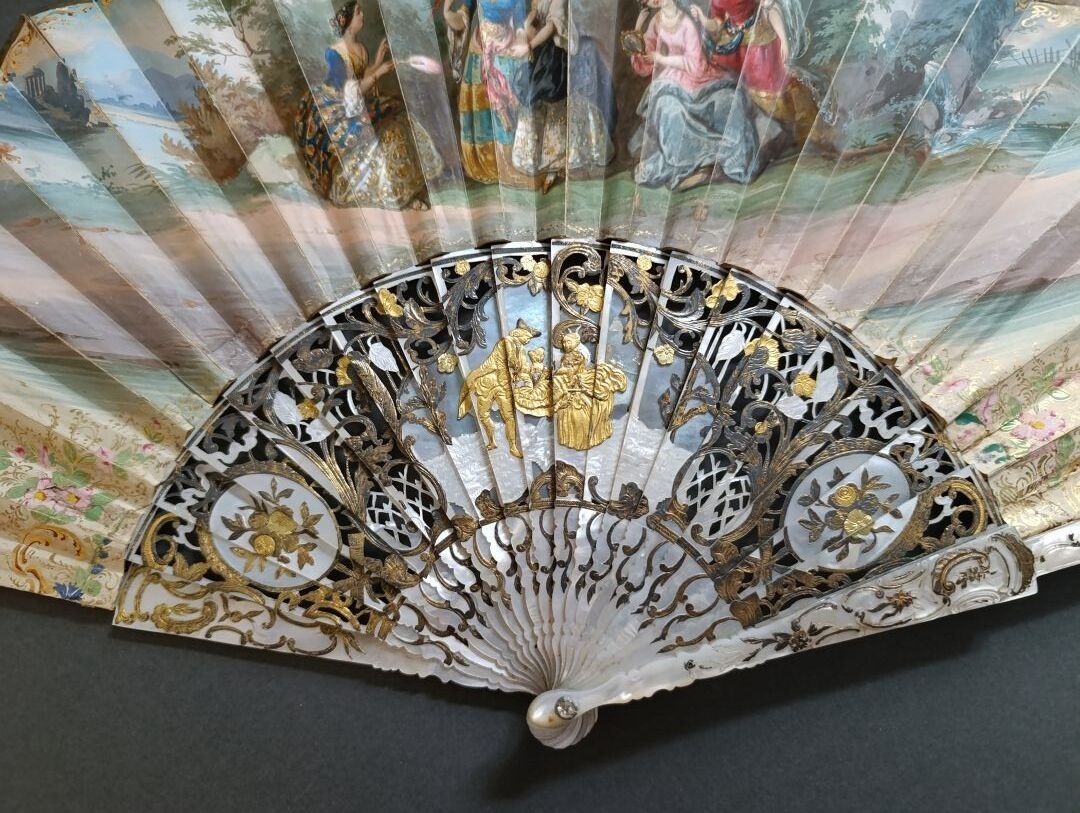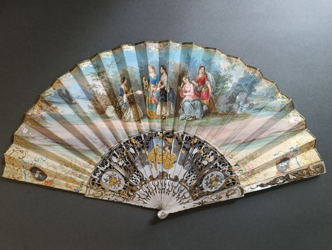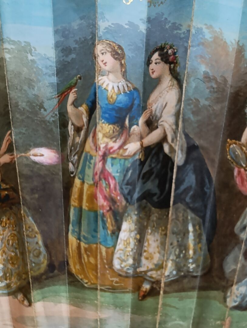 Folded fan, the skin-lined paper sheet painted with five young women holding fans, mirrors or exotic birds in a country setting.