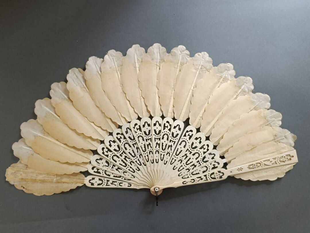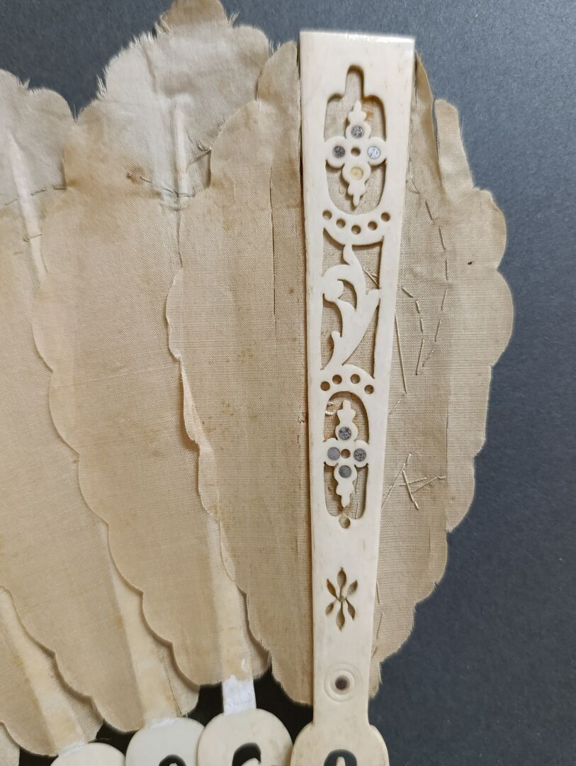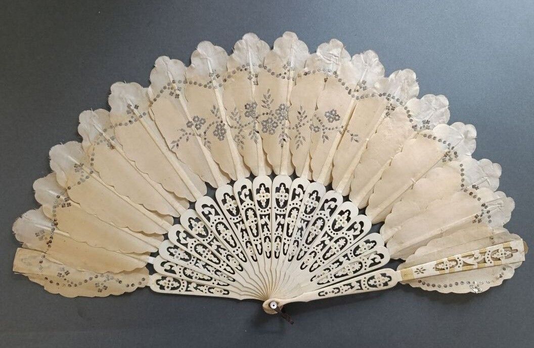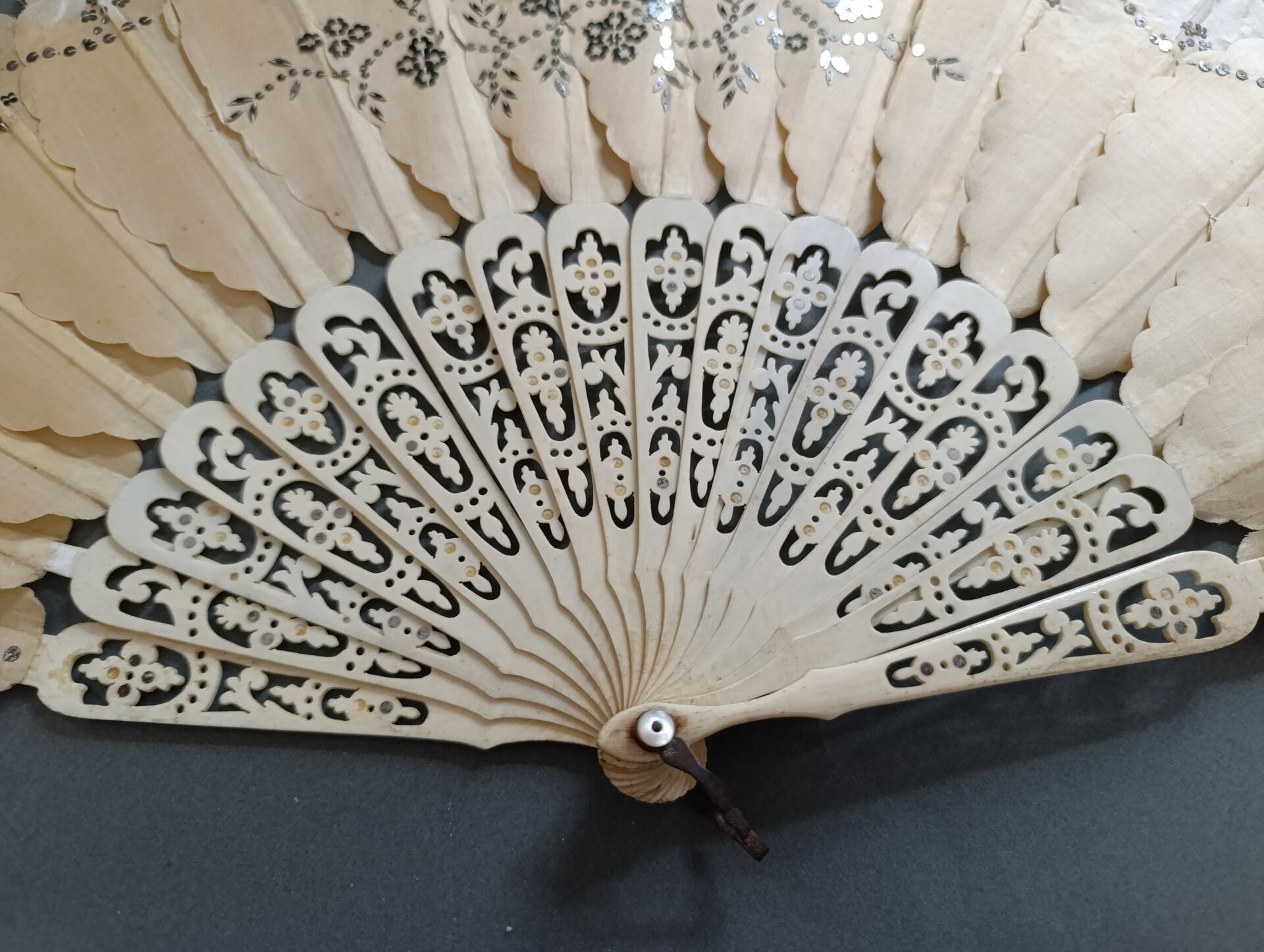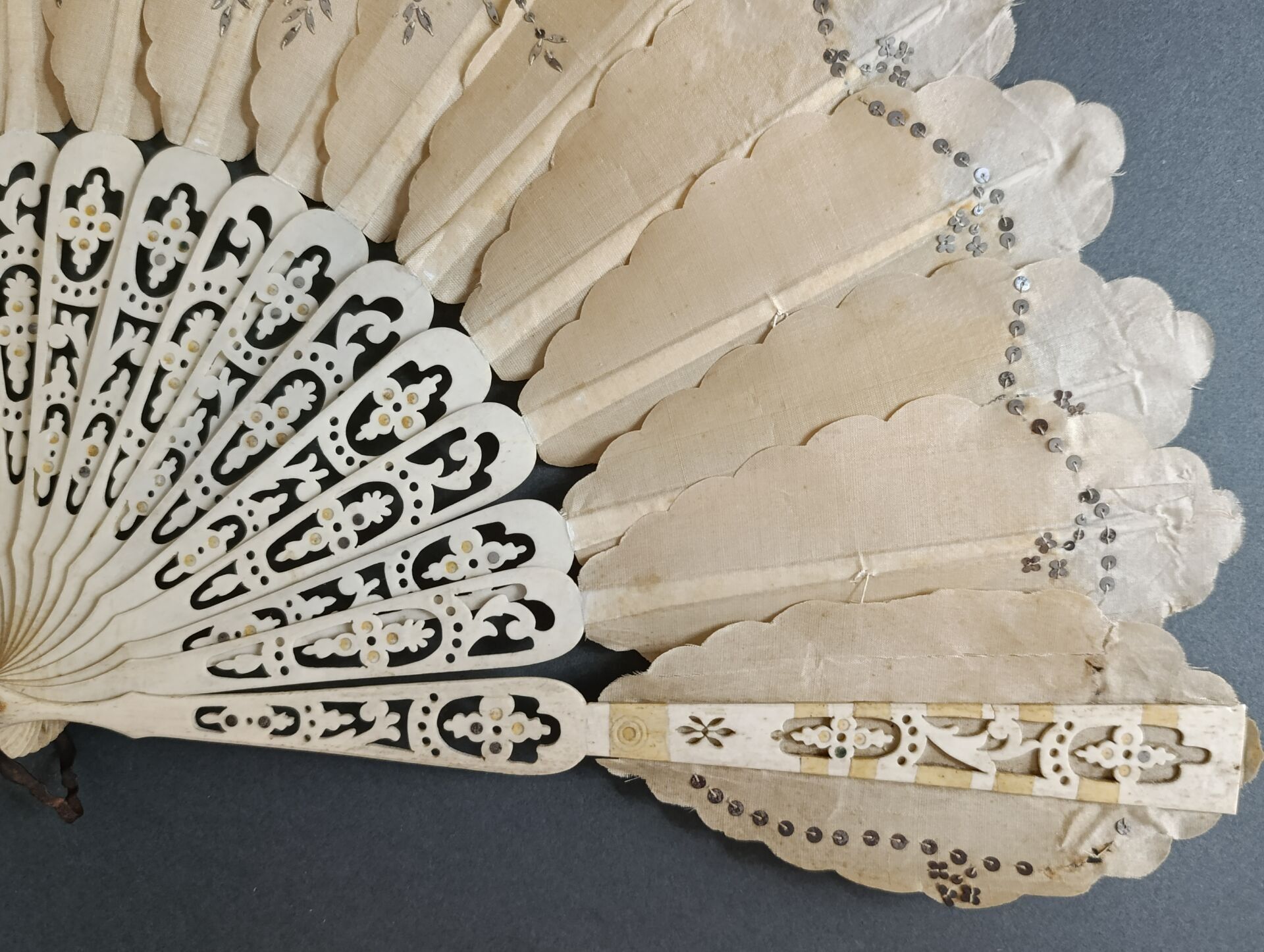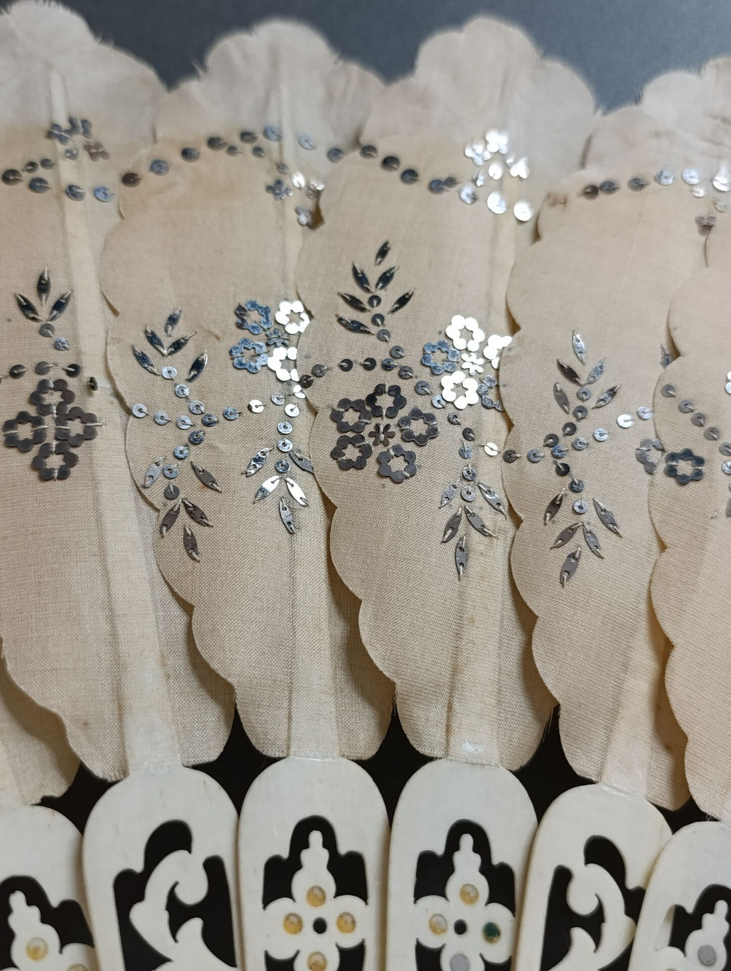 Fan, the leaf composed of scalloped silk palmettes embroidered with silver sequins drawing a flowering branch.