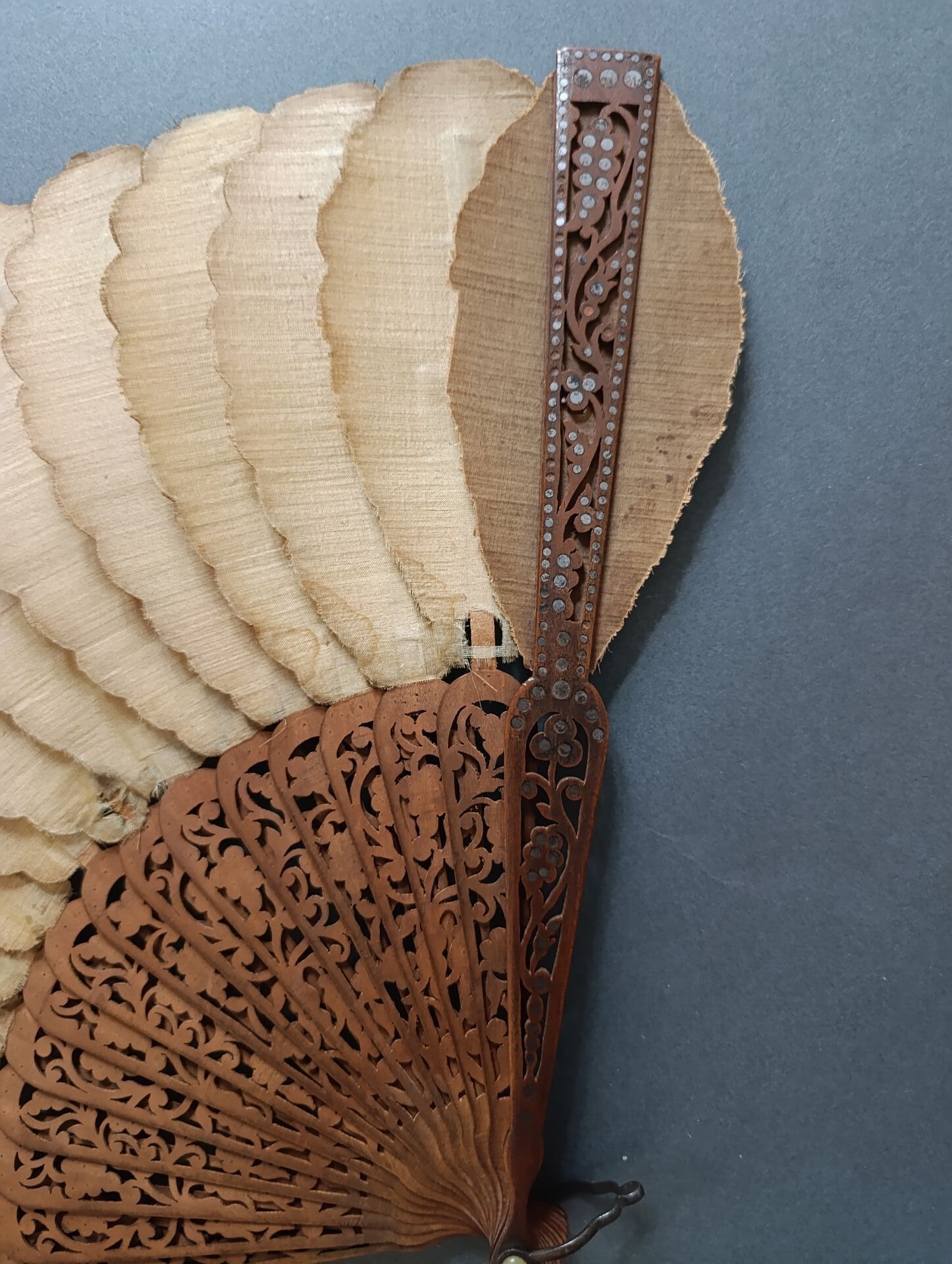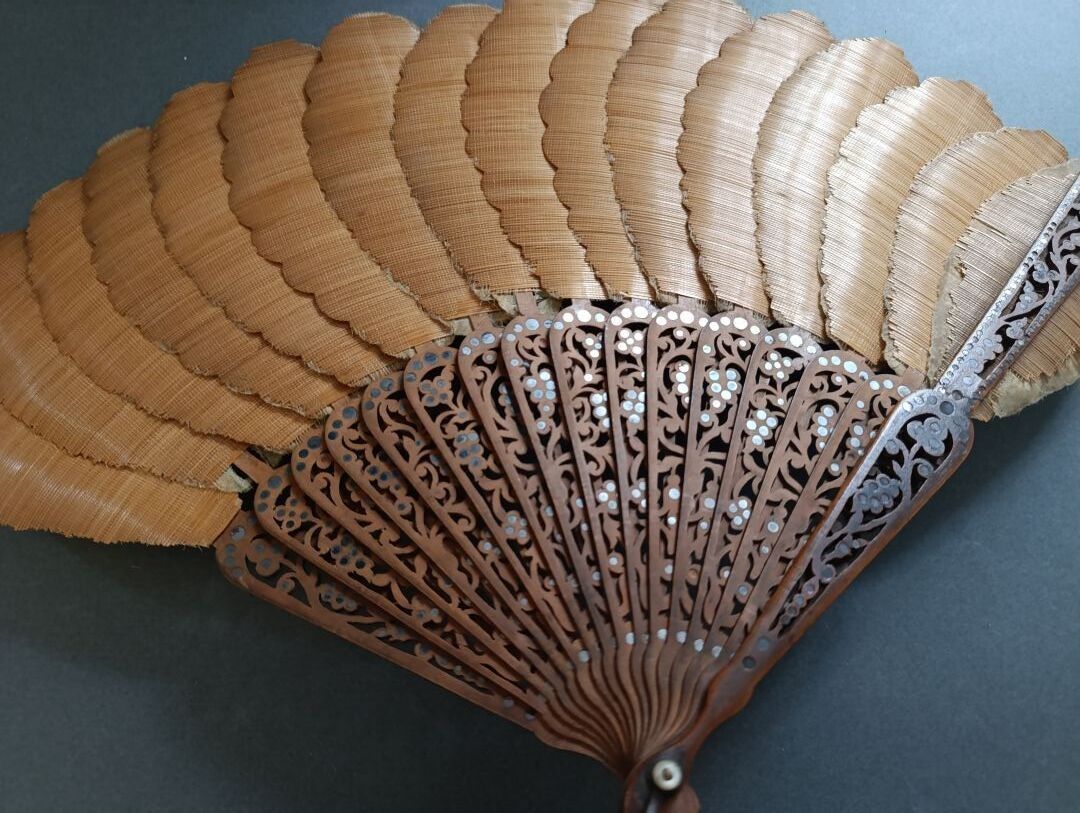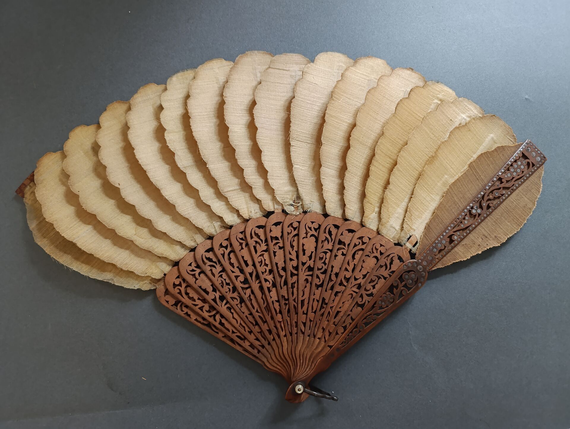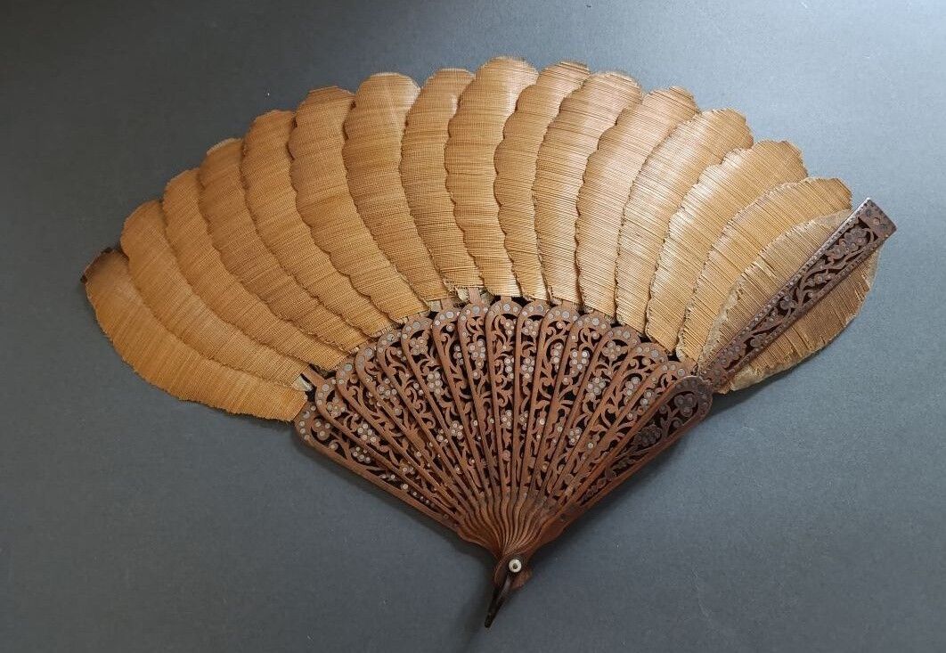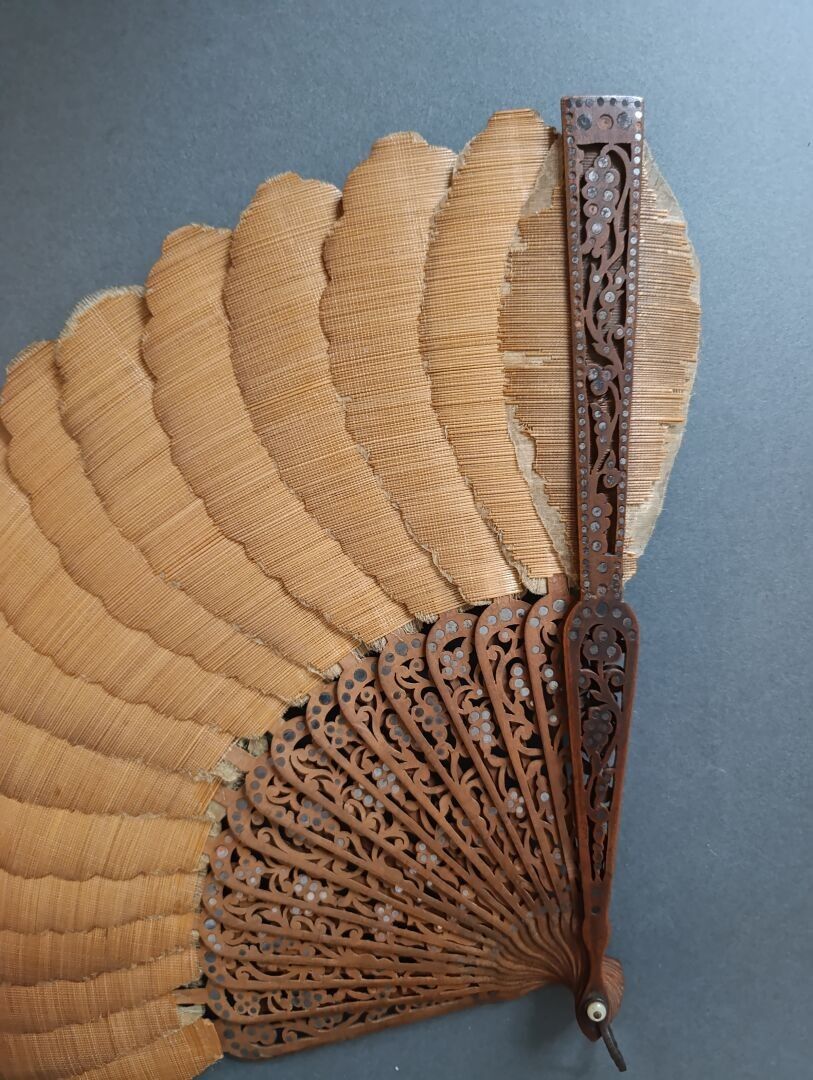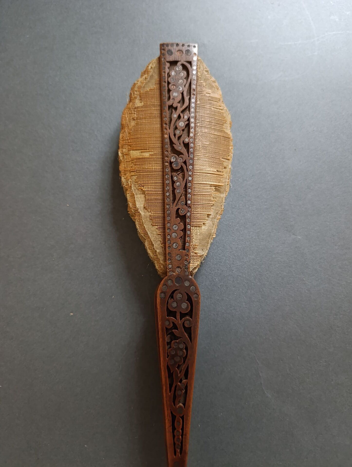 Original fan, the leaf composed of palmettes decorated with natural straw applied to silk.