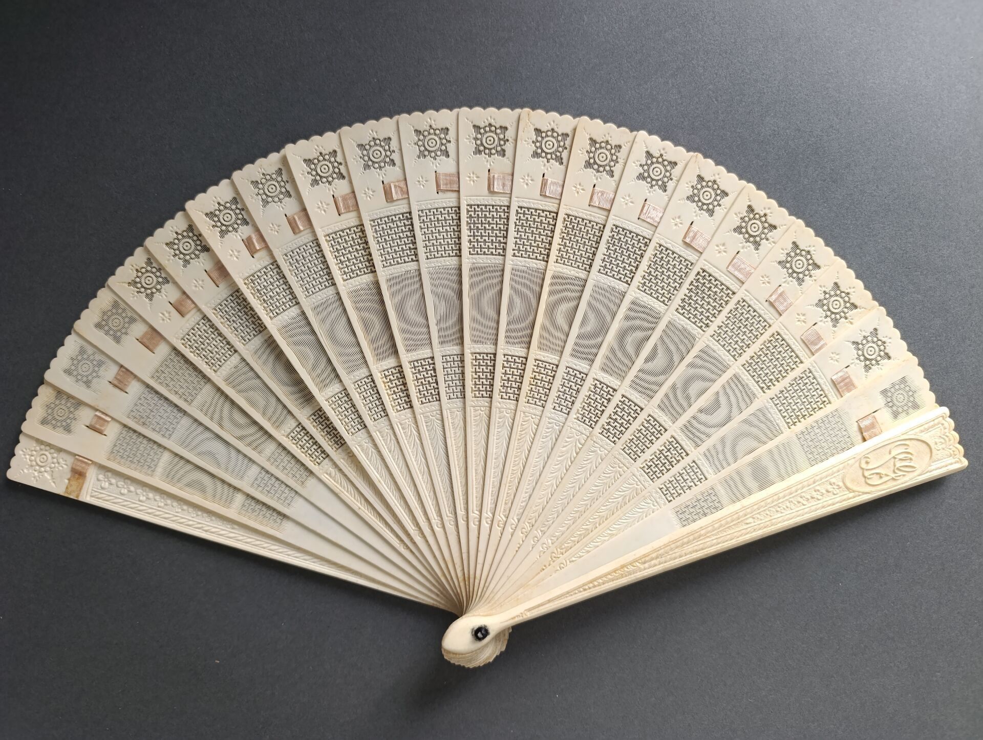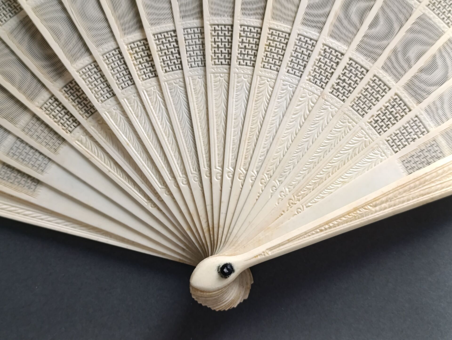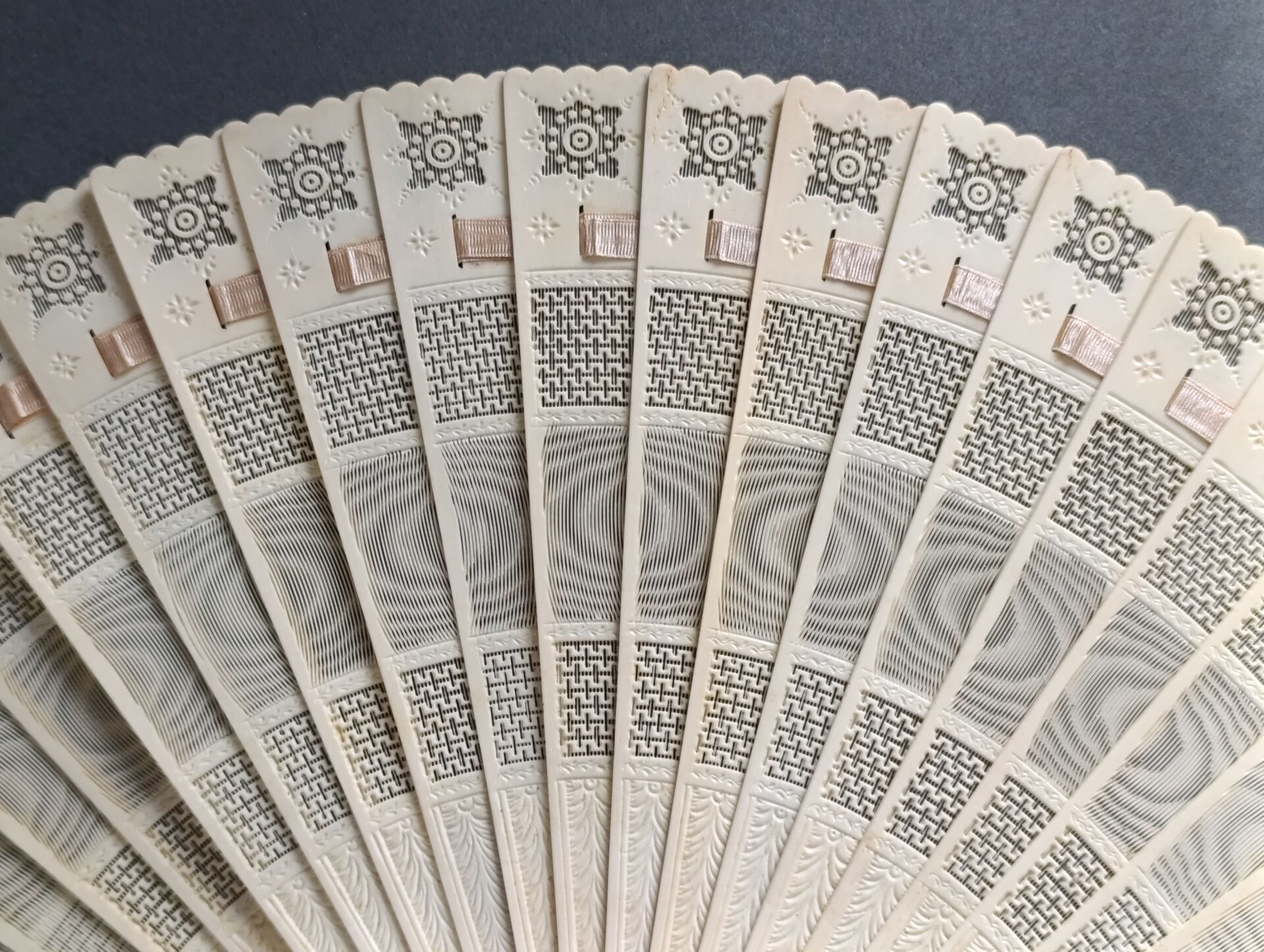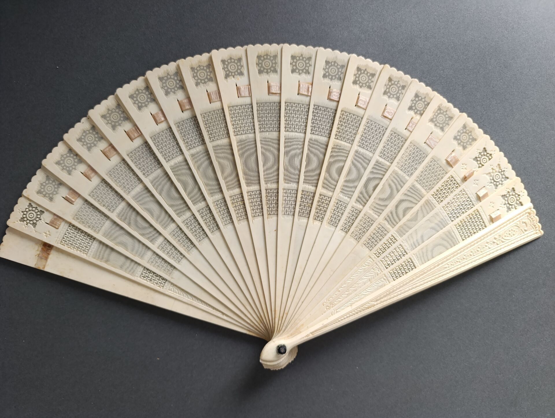 A broken bone fan, finely re-pierced mechanically using a process invented by a craftsman called Baude from the Oise region.