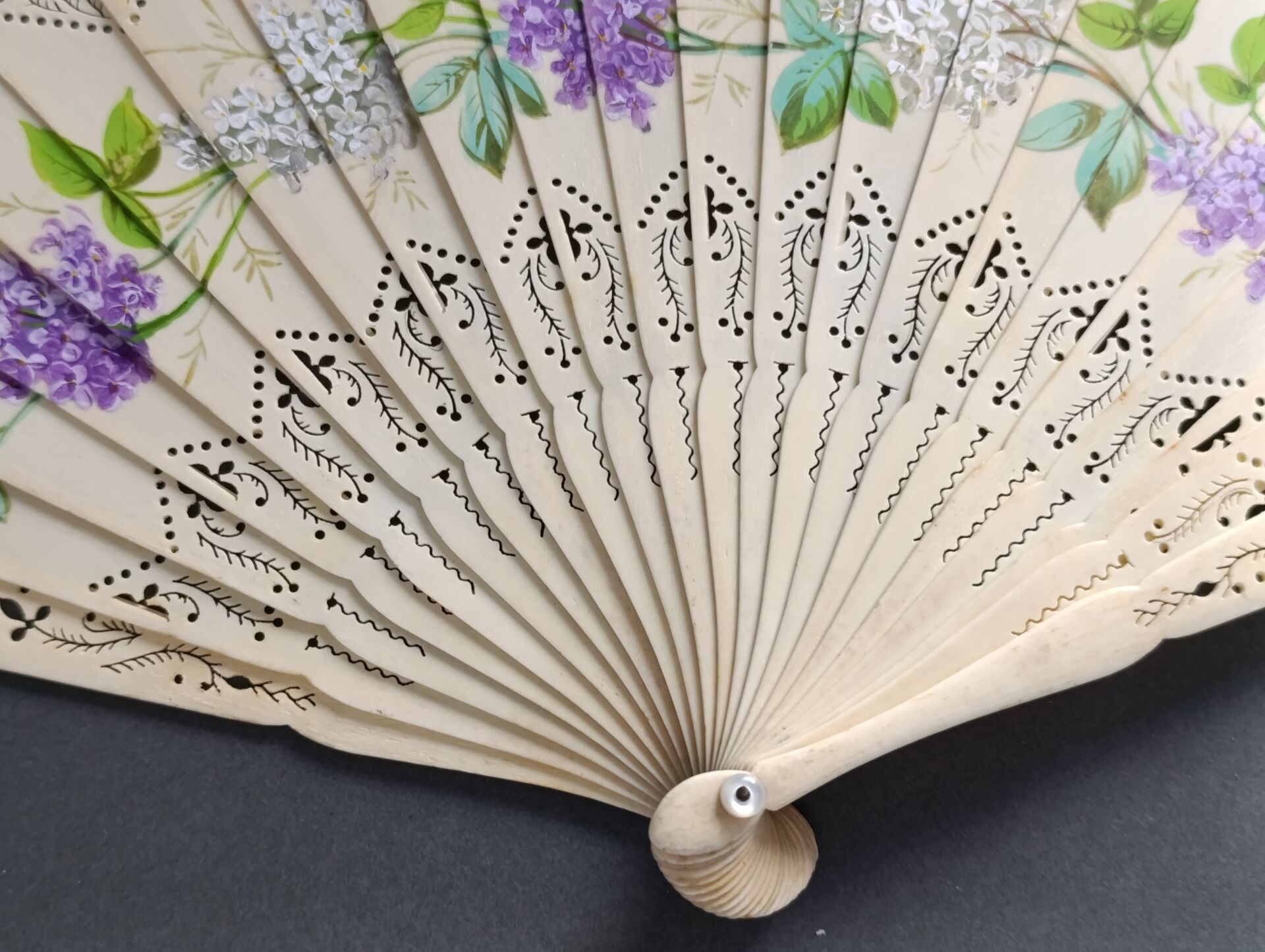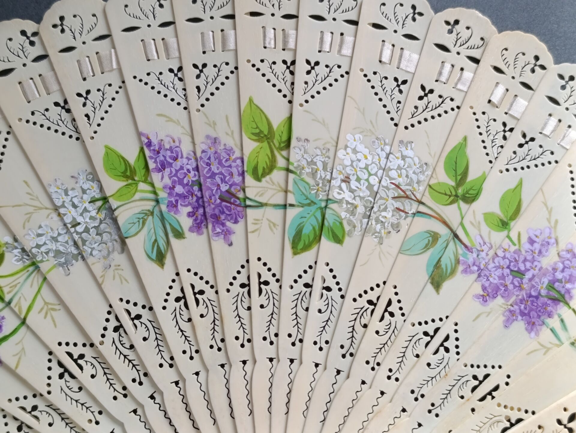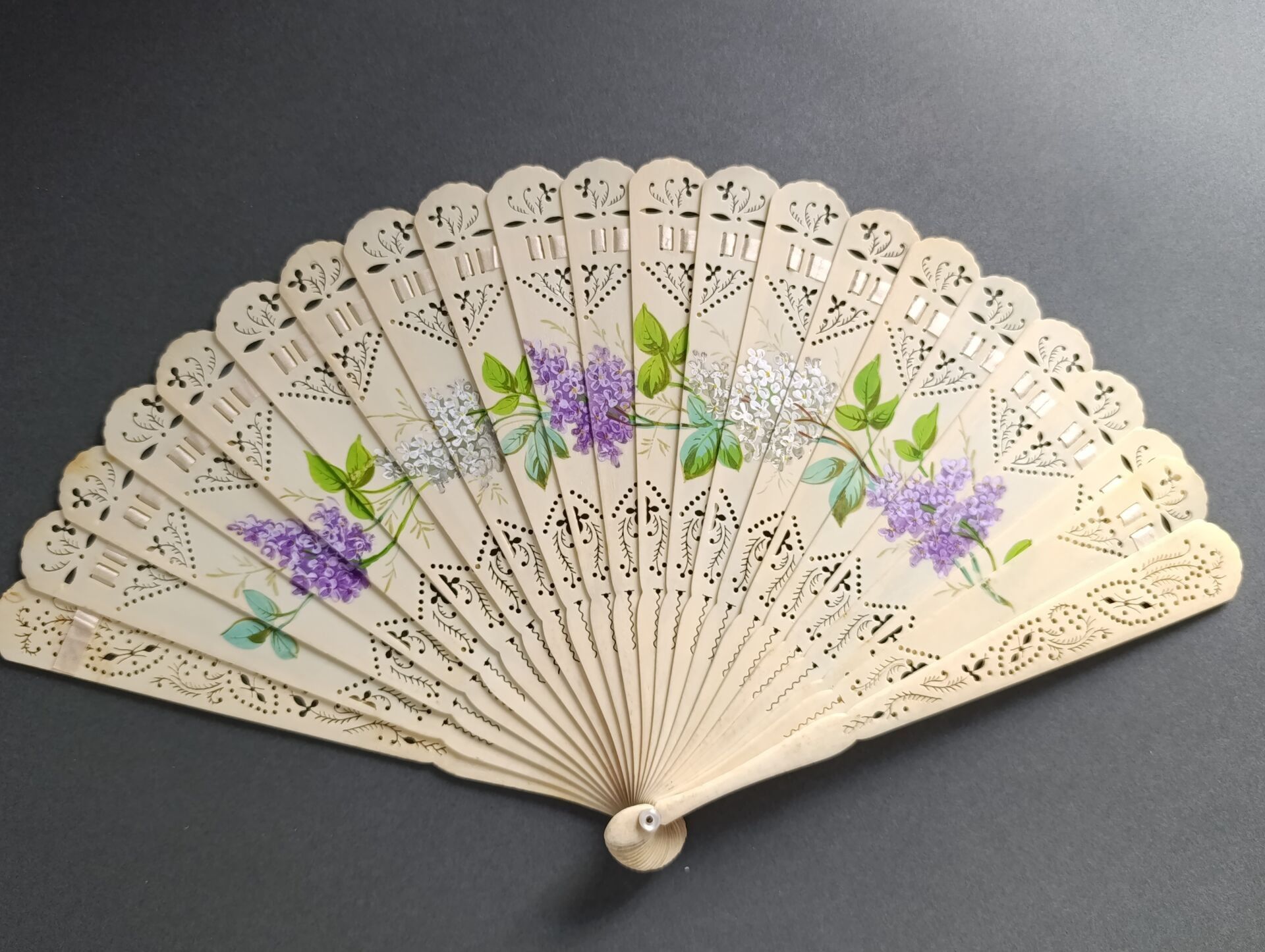 A broken bone fan, pierced and painted with alternating bunches of white and violet lilacs.
