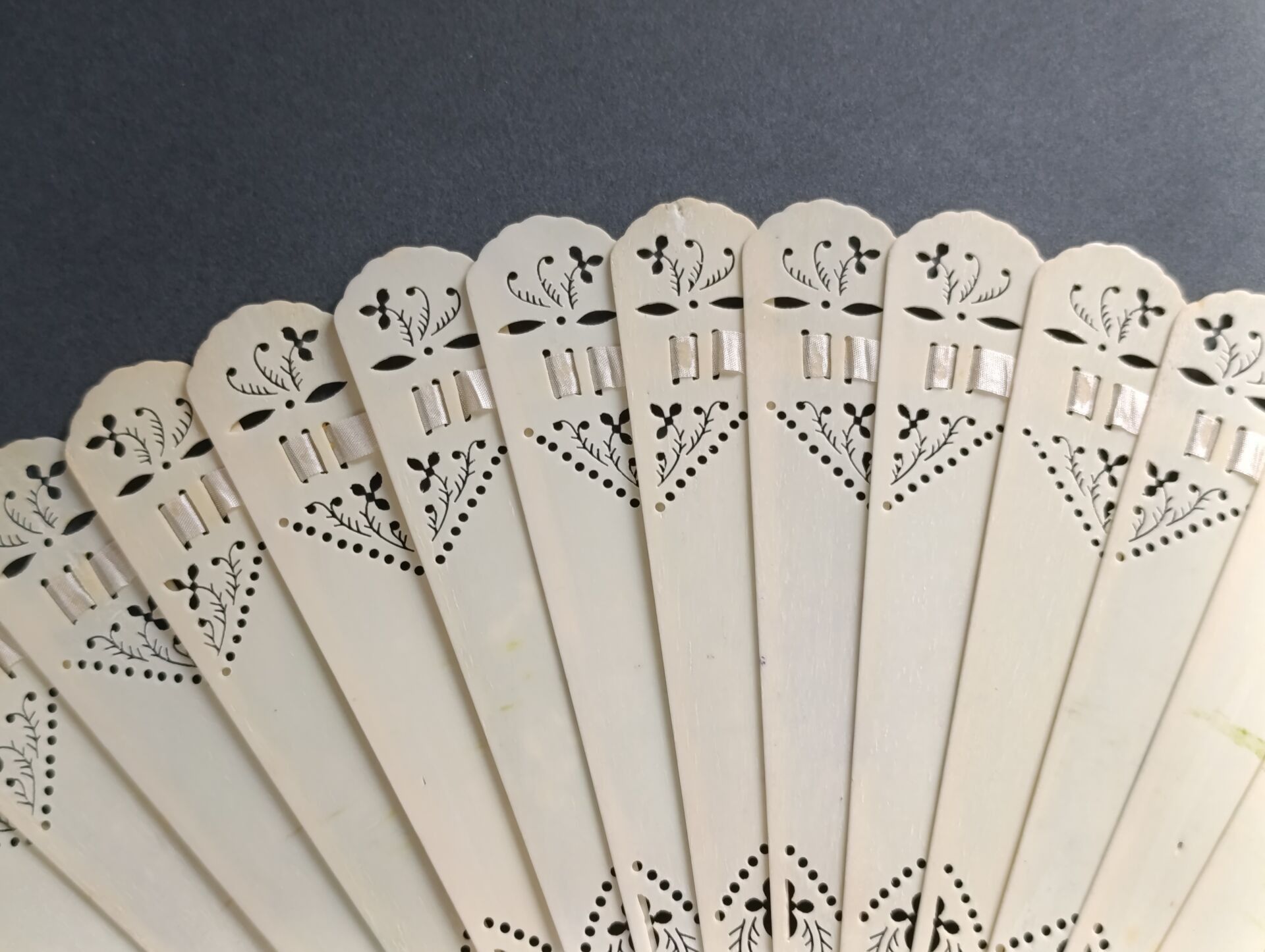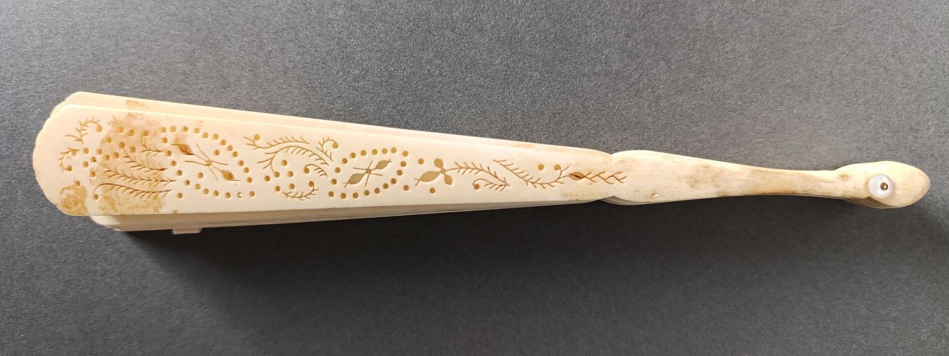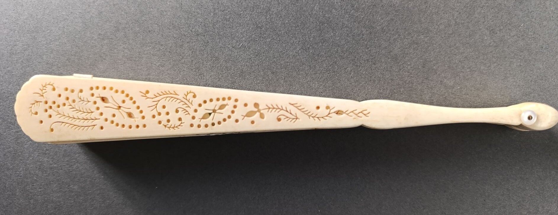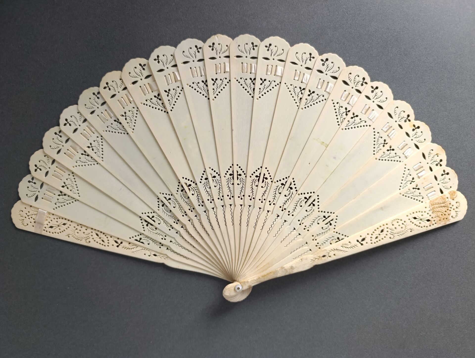 A broken bone fan, pierced and painted with alternating bunches of white and violet lilacs.