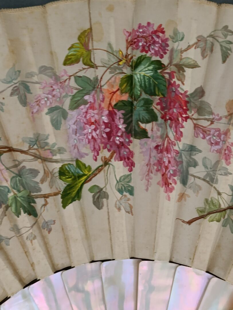 Folded fan, double sheet of cream silk painted with branches of flowering gooseberry called "cassis-fleur".