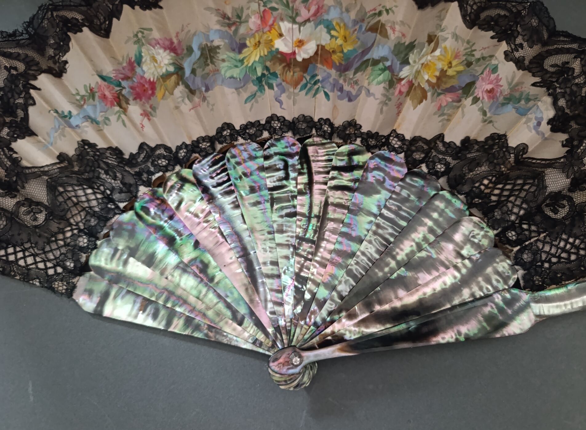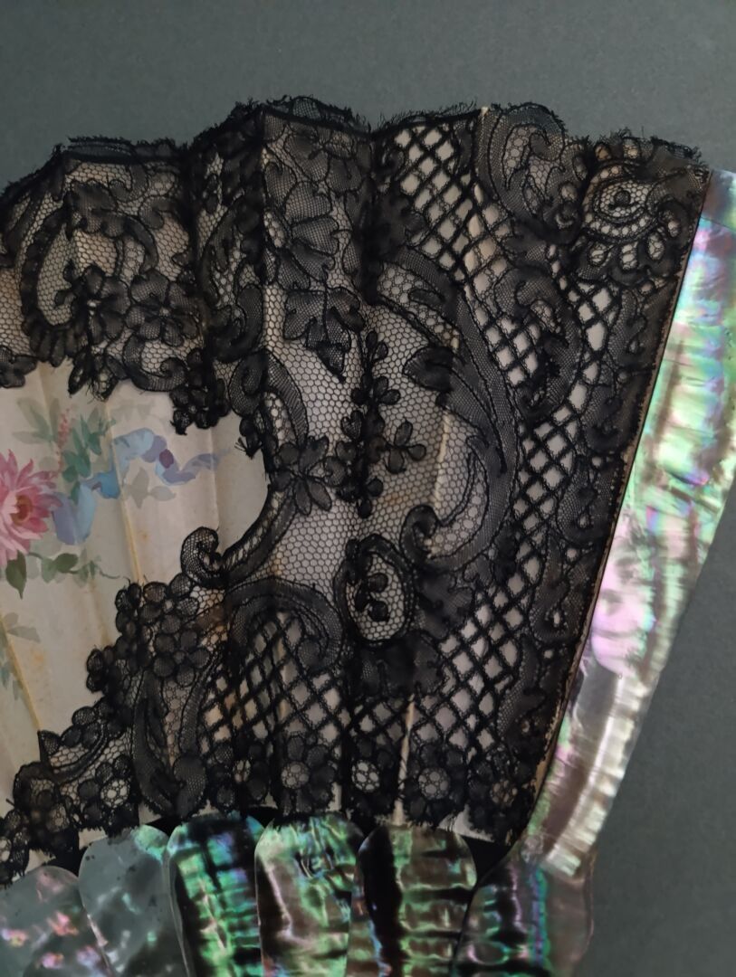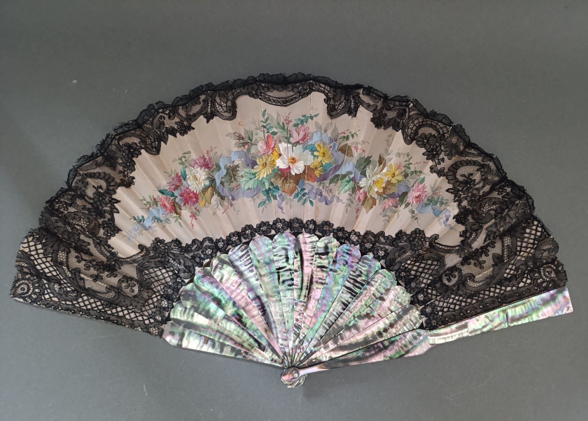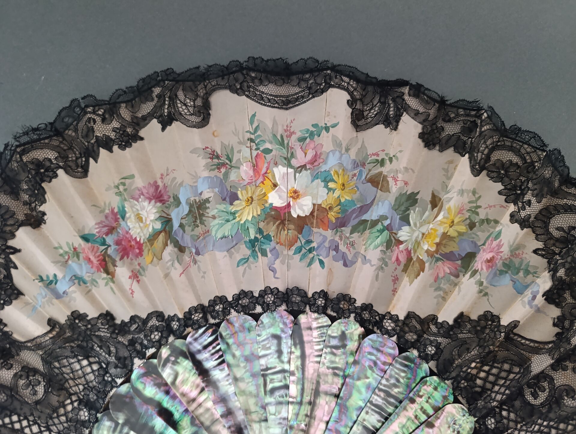 Folded fan, the cream silk sheet edged with black bobbin lace and painted with a colourful bouquet held together by a ribbon. Monogrammed "HB".