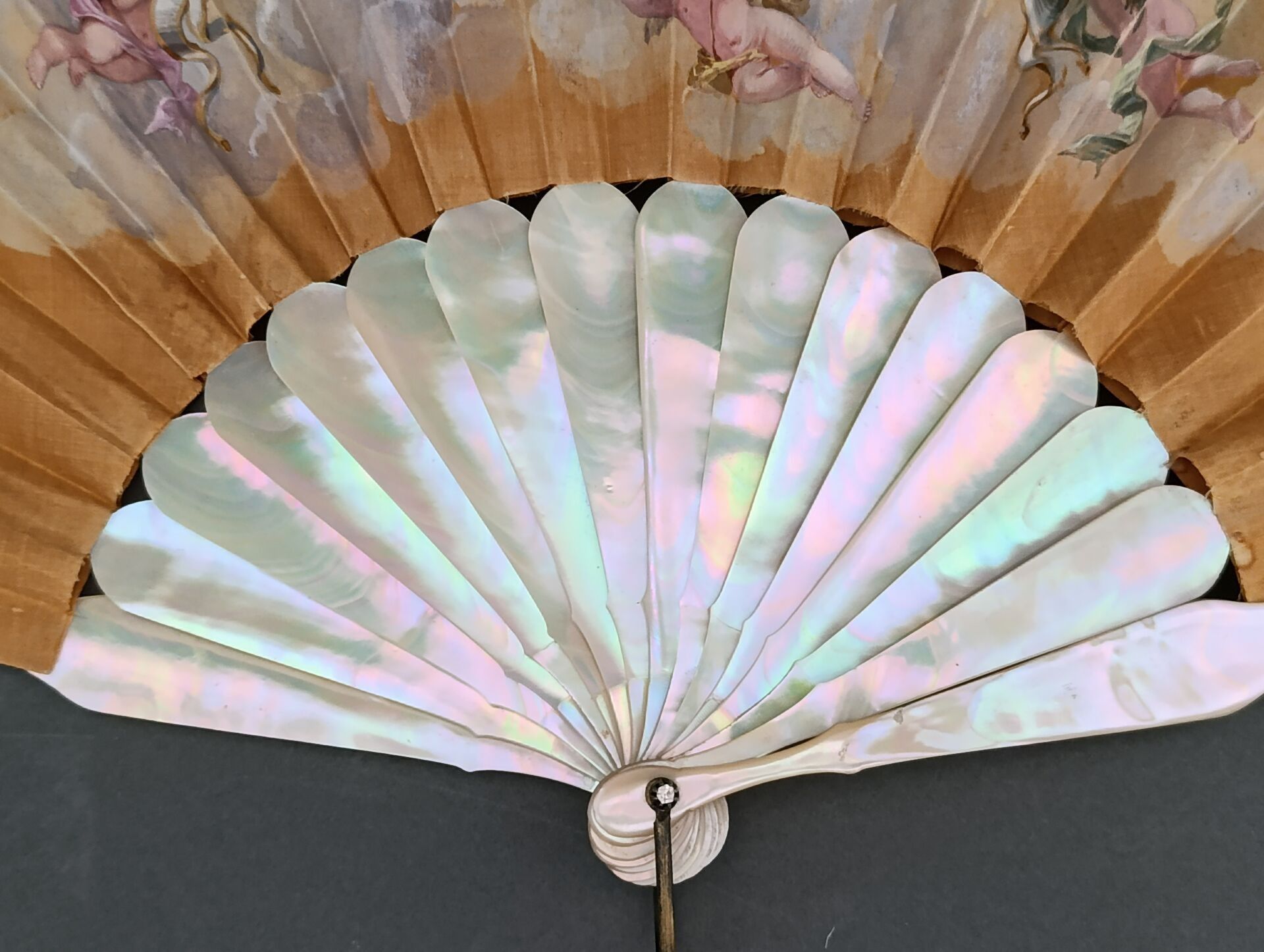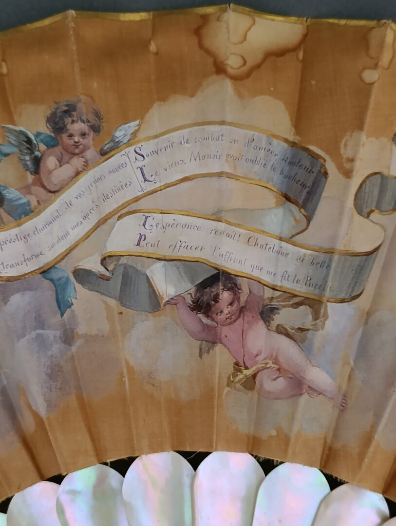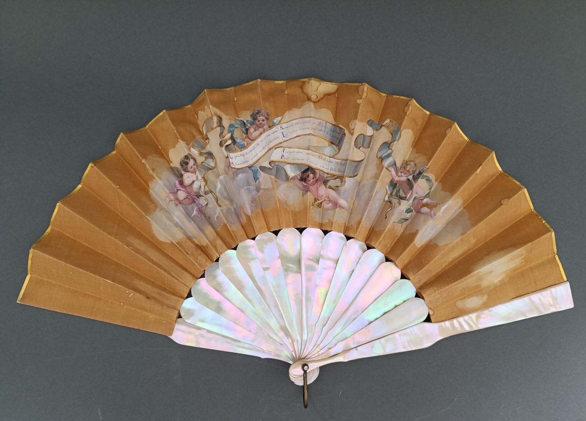 Folded fan, the double sheet in ochre silk painted with four loves holding phylacteries on which are written verses addressed to a young woman: "The charming prestige of your young years/ Has suddenly transformed my after destinies/ Memory of combat or bitter pain/ Hope is reborn, chatelaine so beautiful/ To erase the affront that the virgin made me".