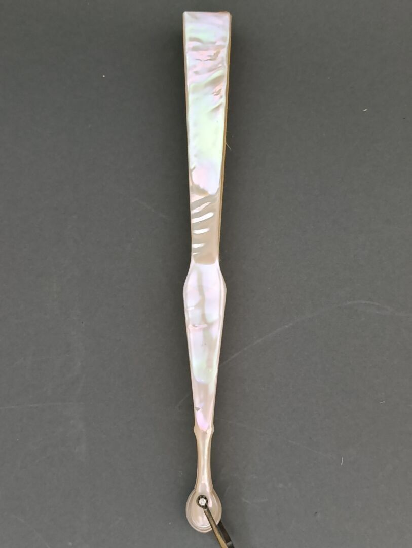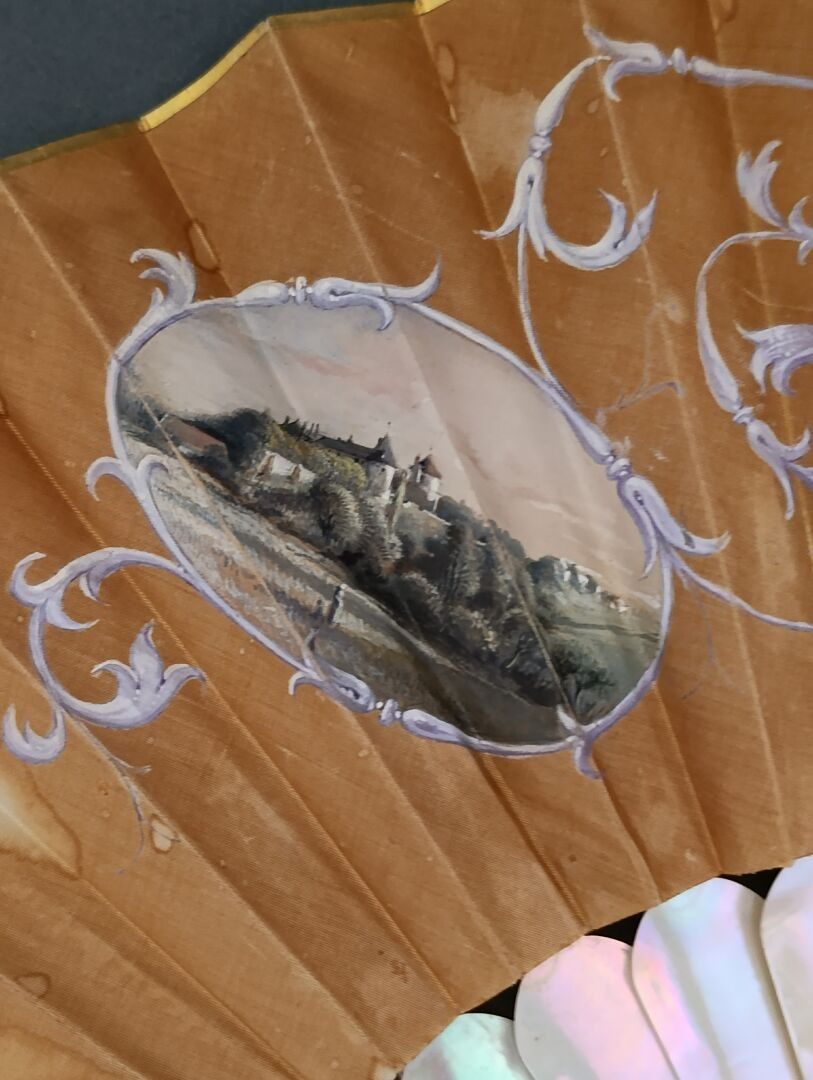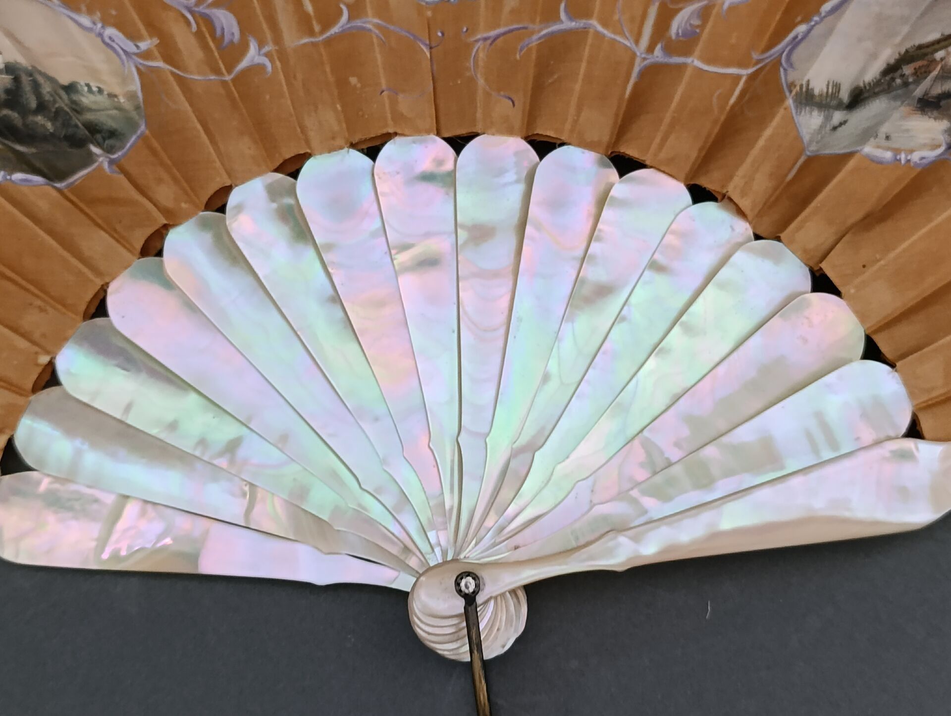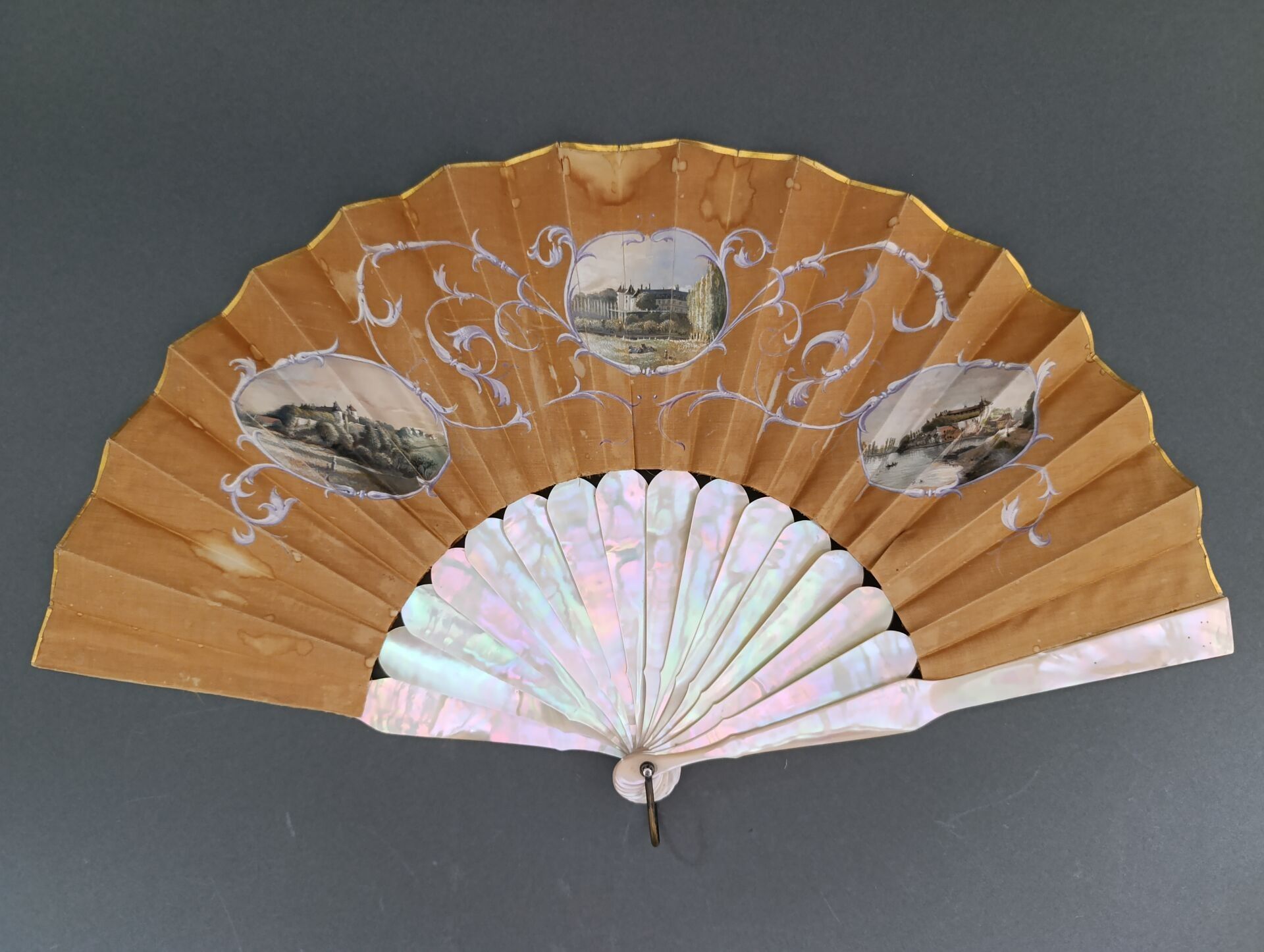 Folded fan, the double sheet in ochre silk painted with four loves holding phylacteries on which are written verses addressed to a young woman: "The charming prestige of your young years/ Has suddenly transformed my after destinies/ Memory of combat or bitter pain/ Hope is reborn, chatelaine so beautiful/ To erase the affront that the virgin made me".