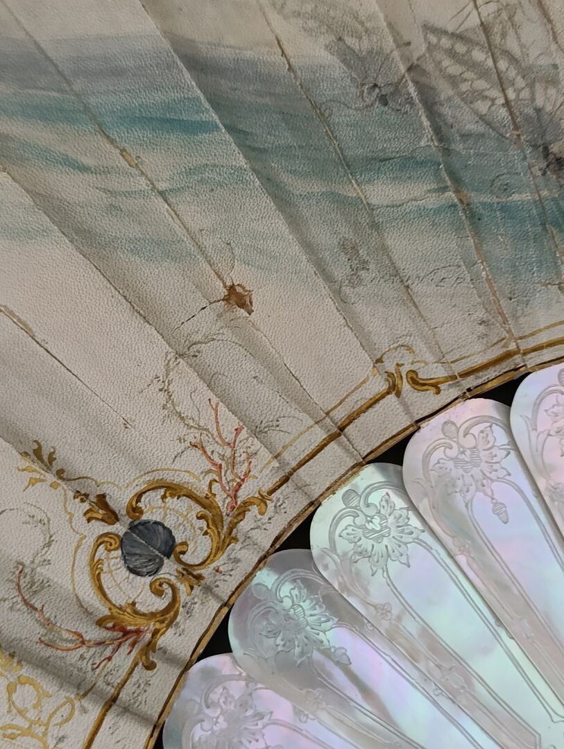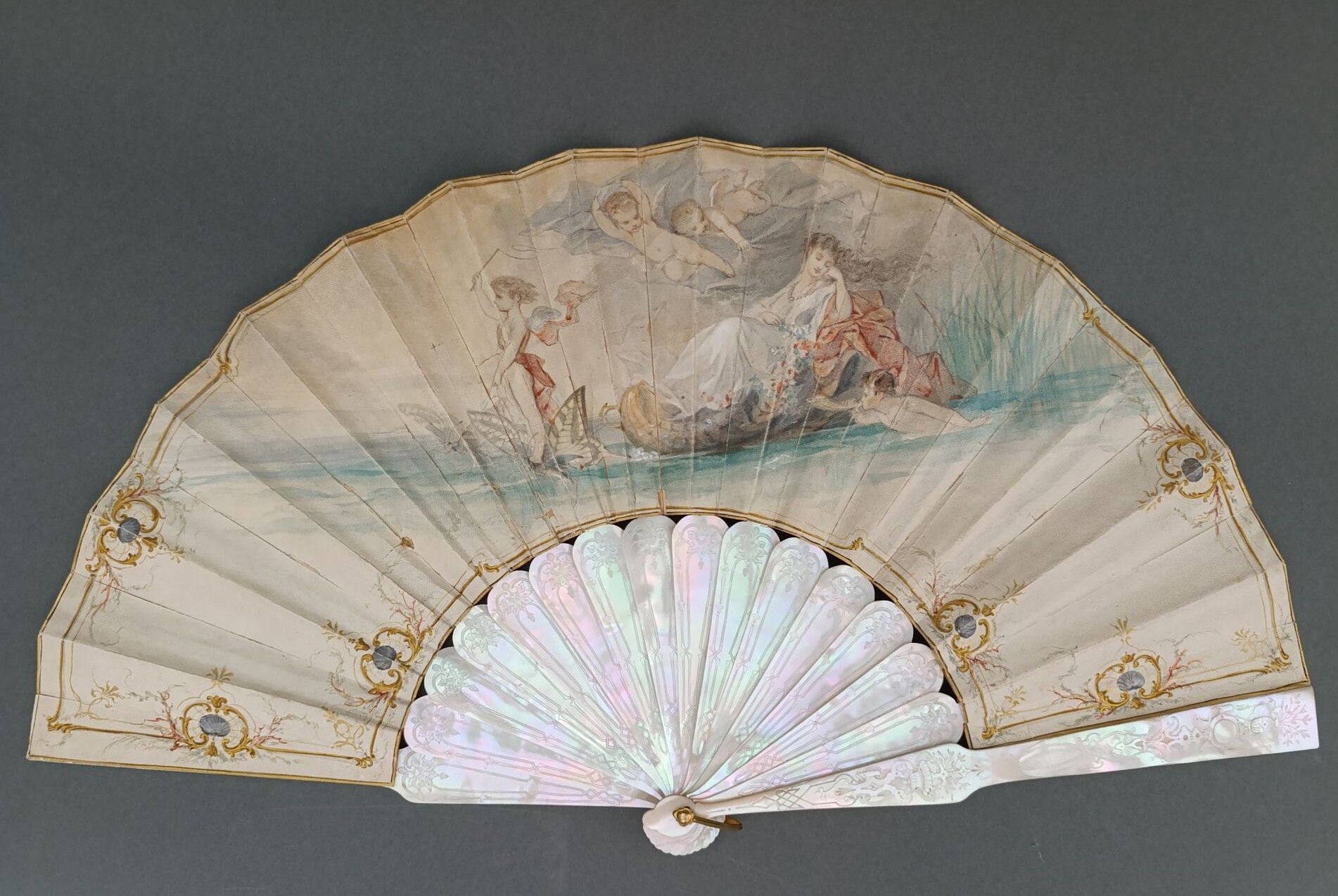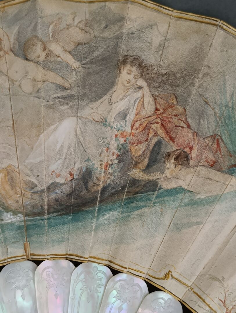 Folded fan, the skin sheet painted with a nymph carried on water by a conch led by a love guiding butterflies. Signed on the left.