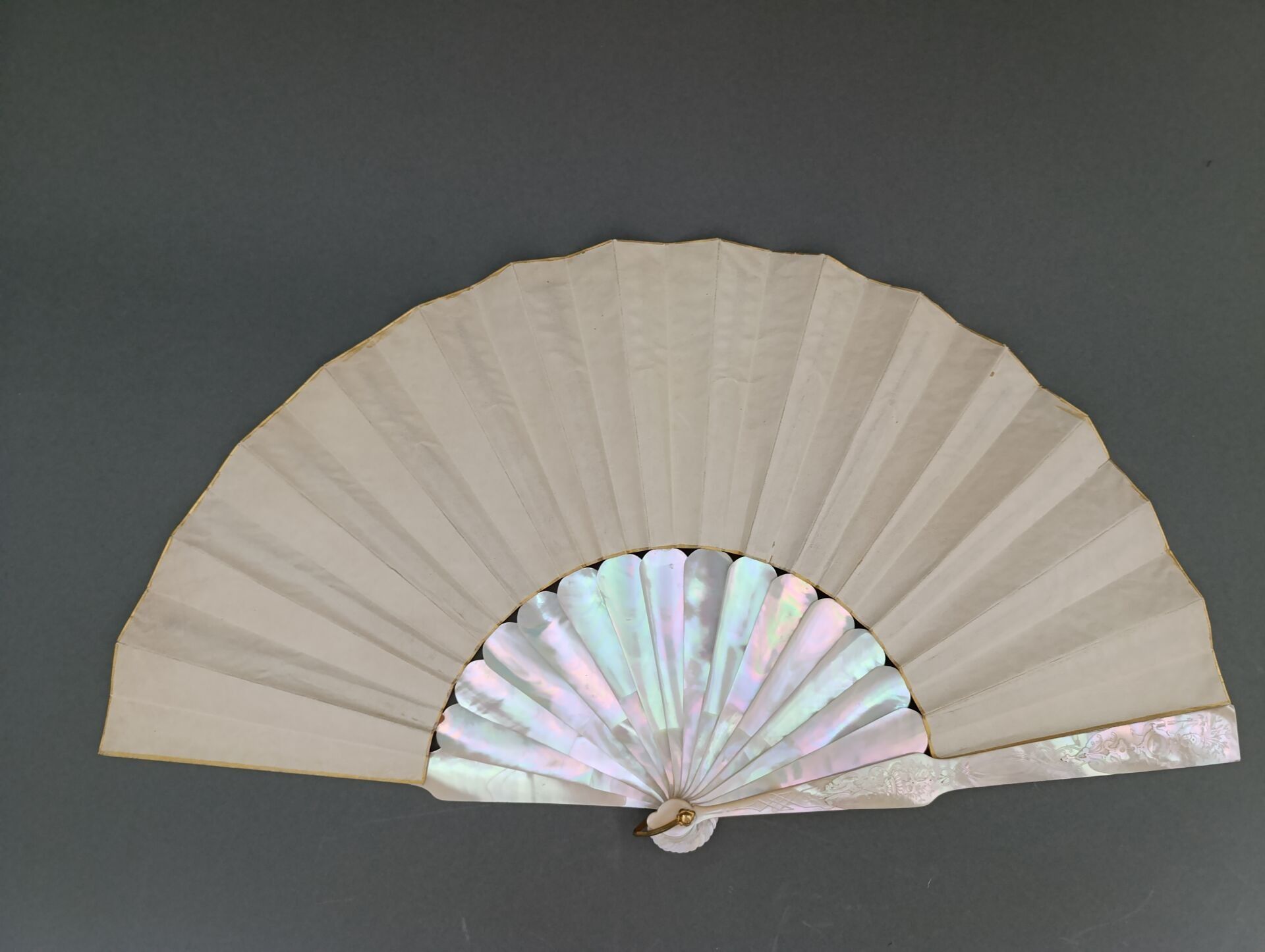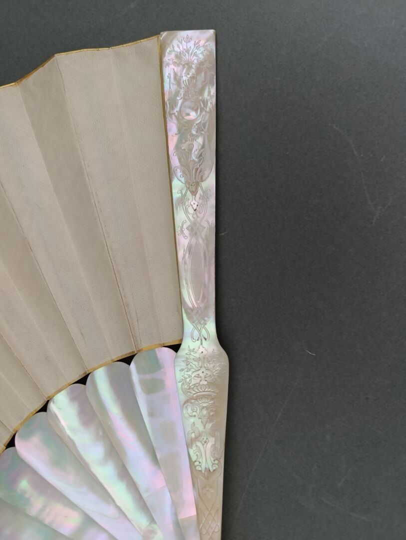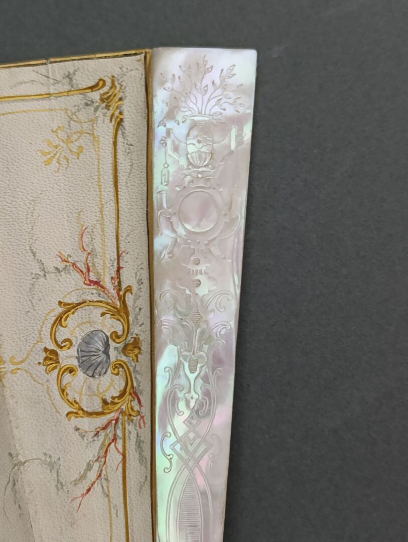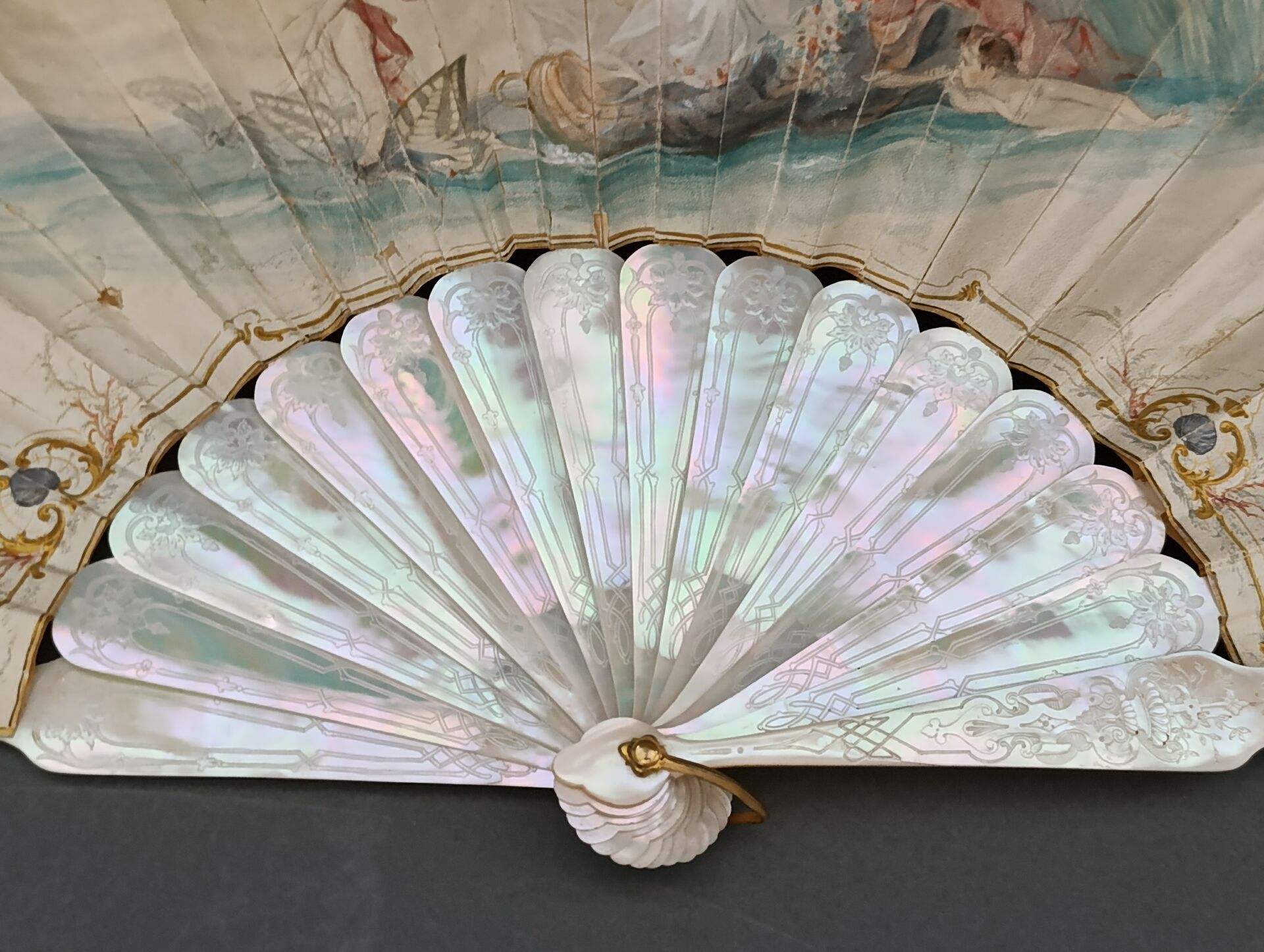 Folded fan, the skin sheet painted with a nymph carried on water by a conch led by a love guiding butterflies. Signed on the left.
