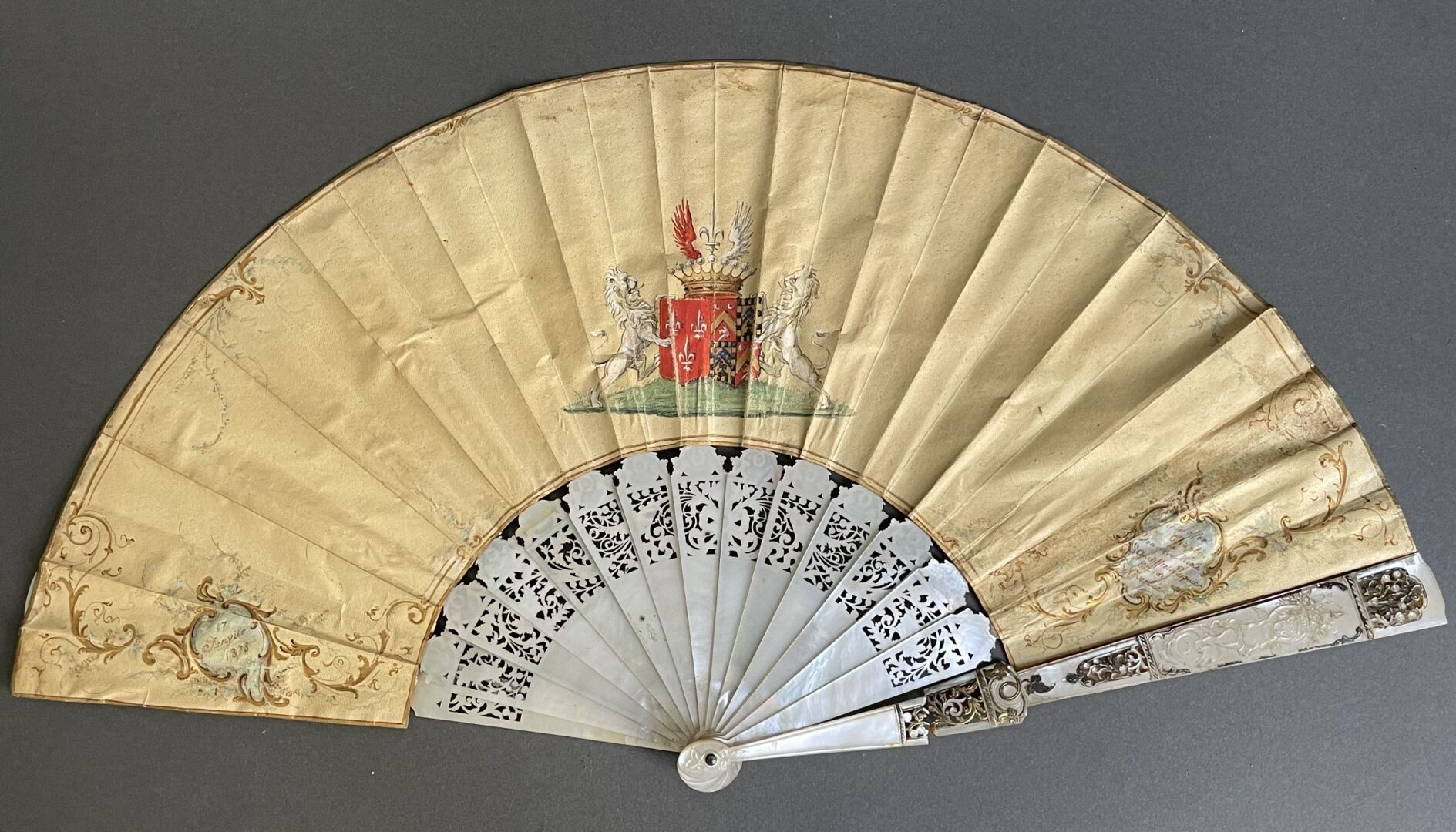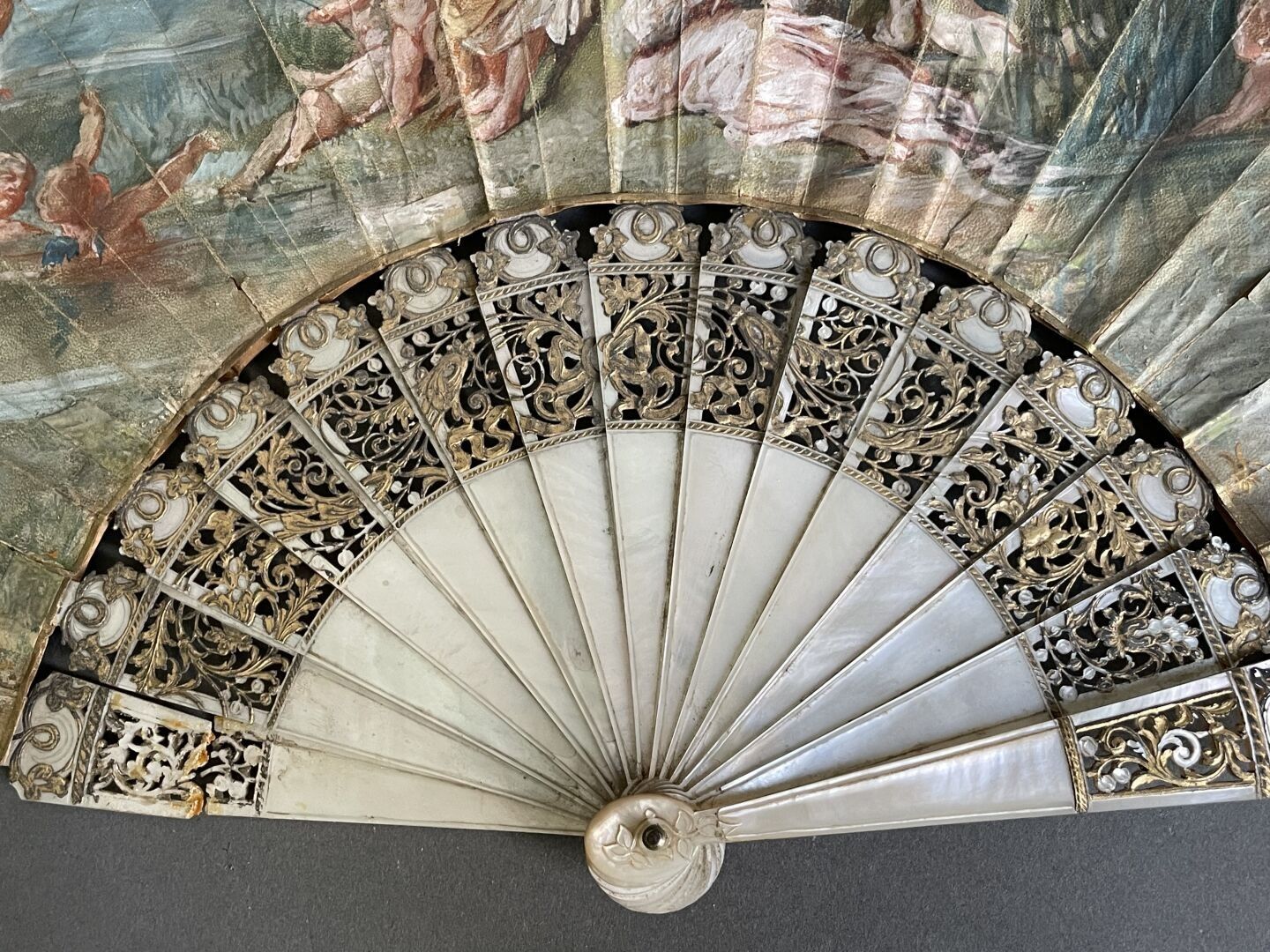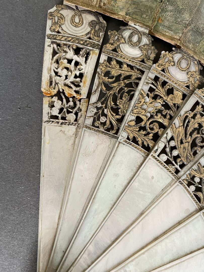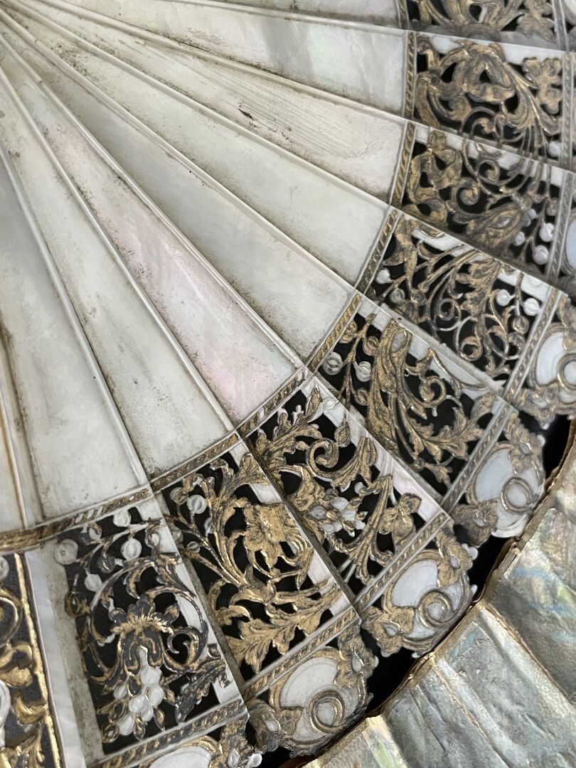 White mother-of-pearl mounting with fine engraved and gilded scrollwork.