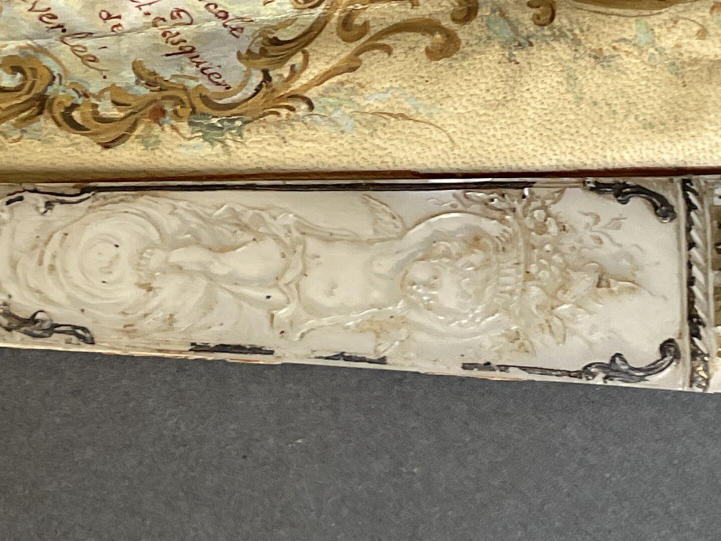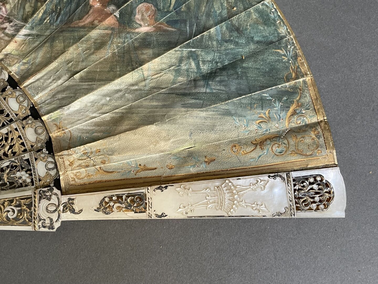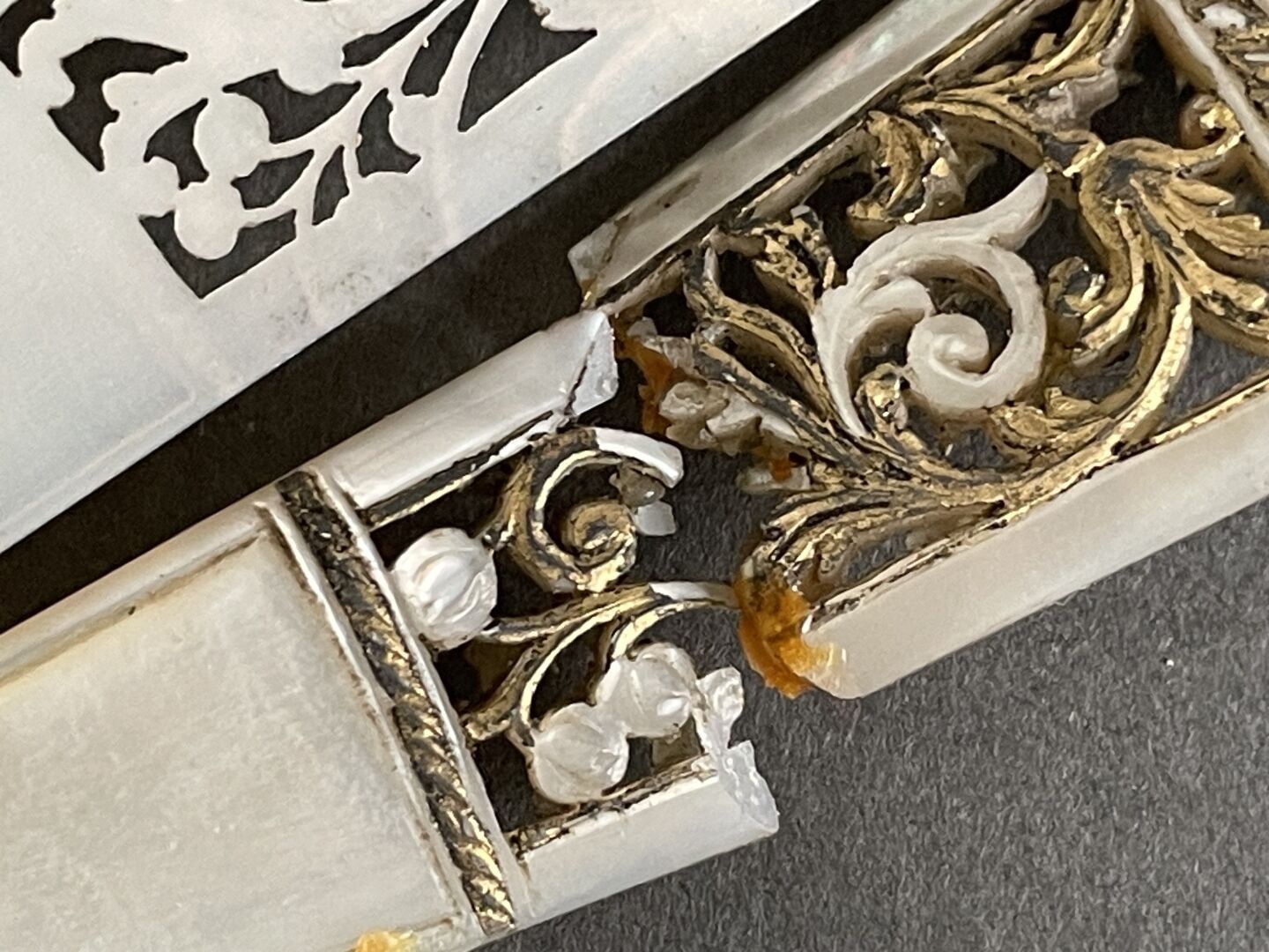 White mother-of-pearl mounting with fine engraved and gilded scrollwork.