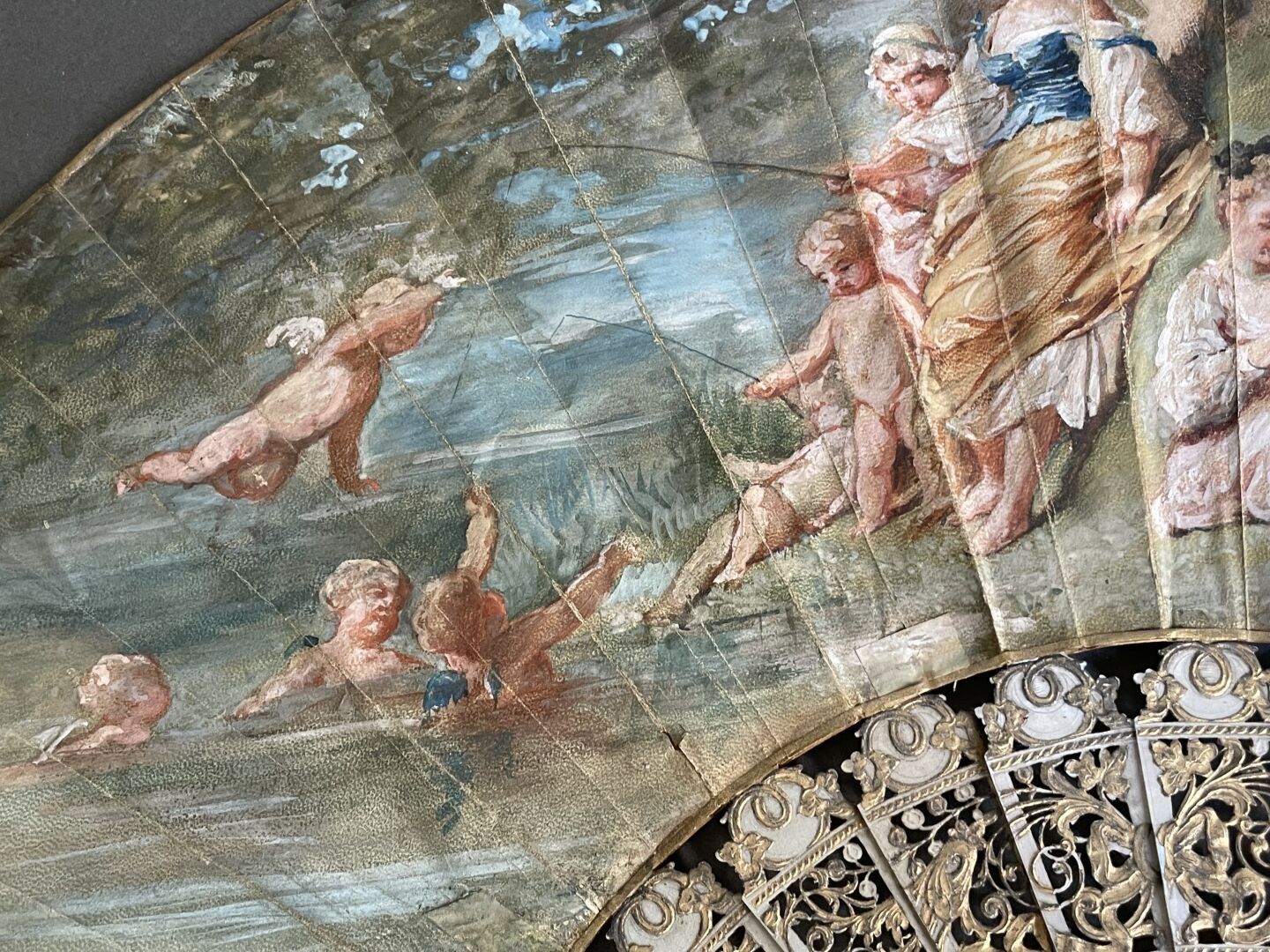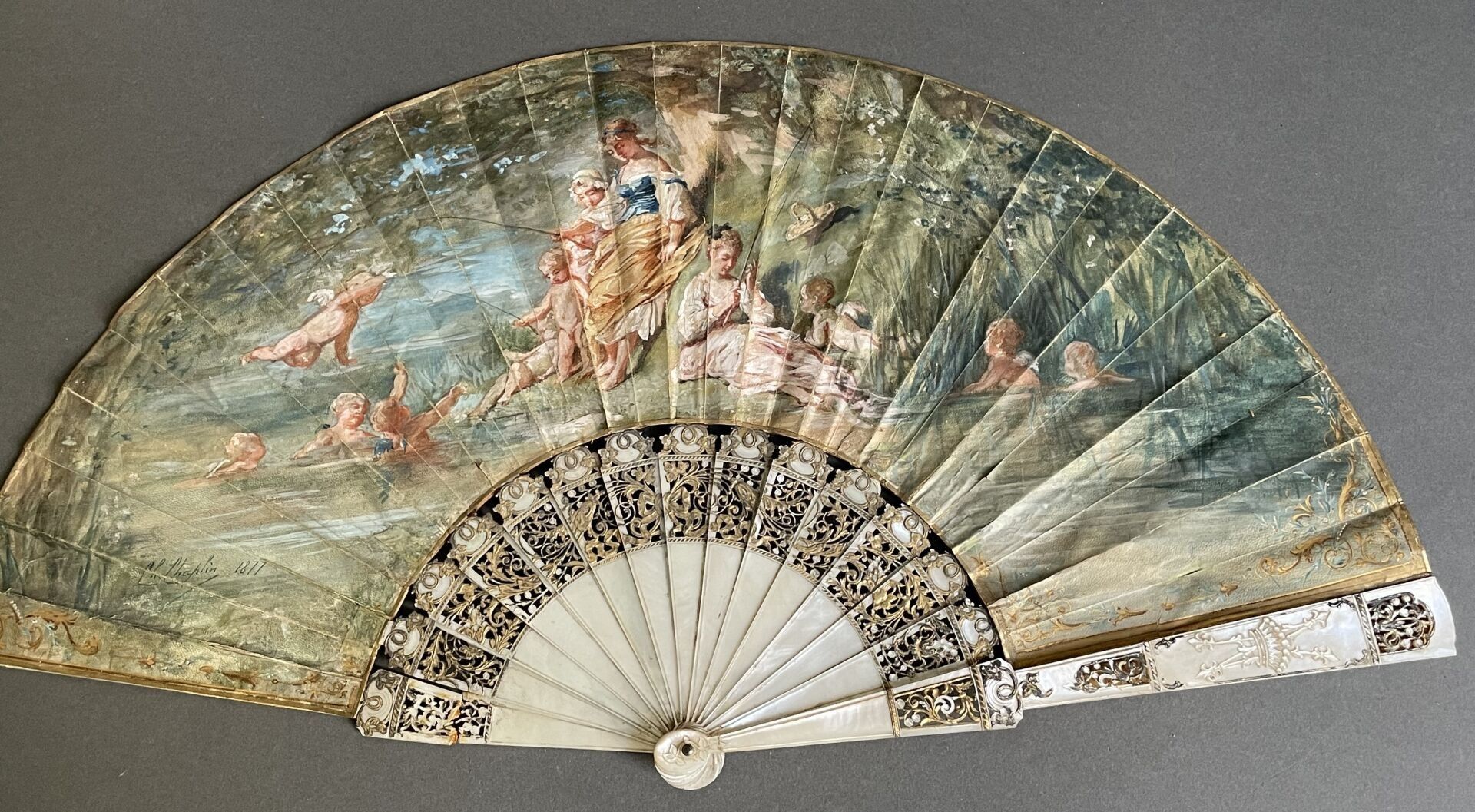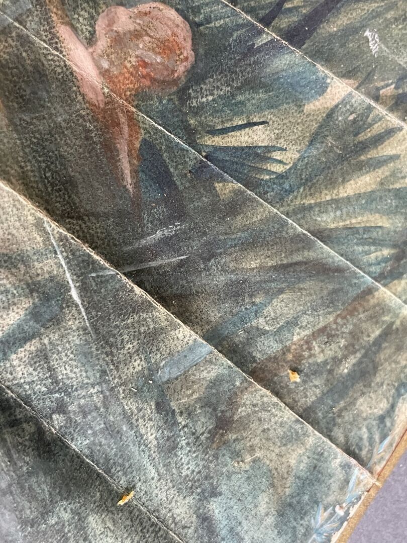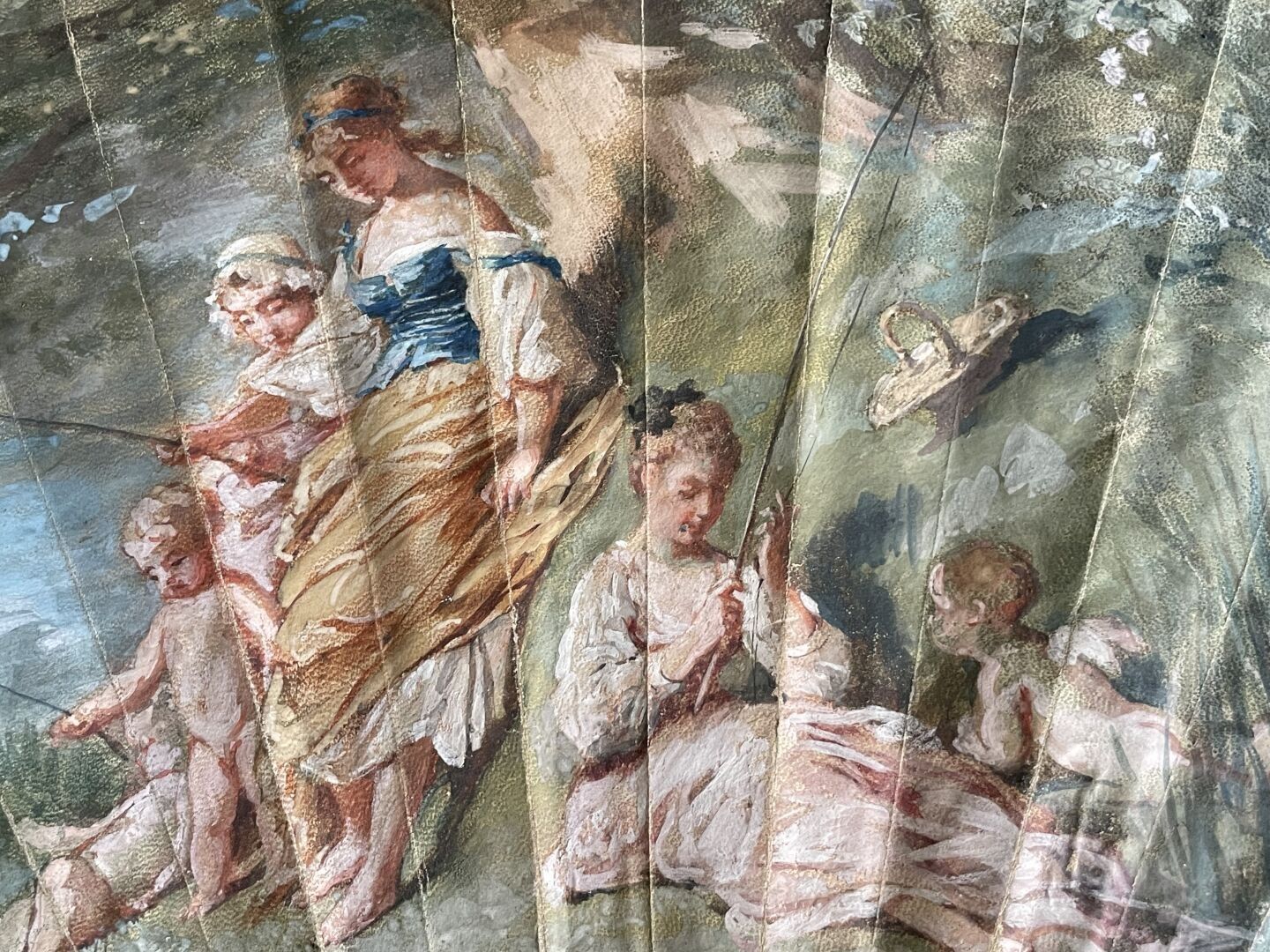Folded fan, the double skin sheet painted with three young fisherwomen by the river, surrounded by numerous sweethearts.