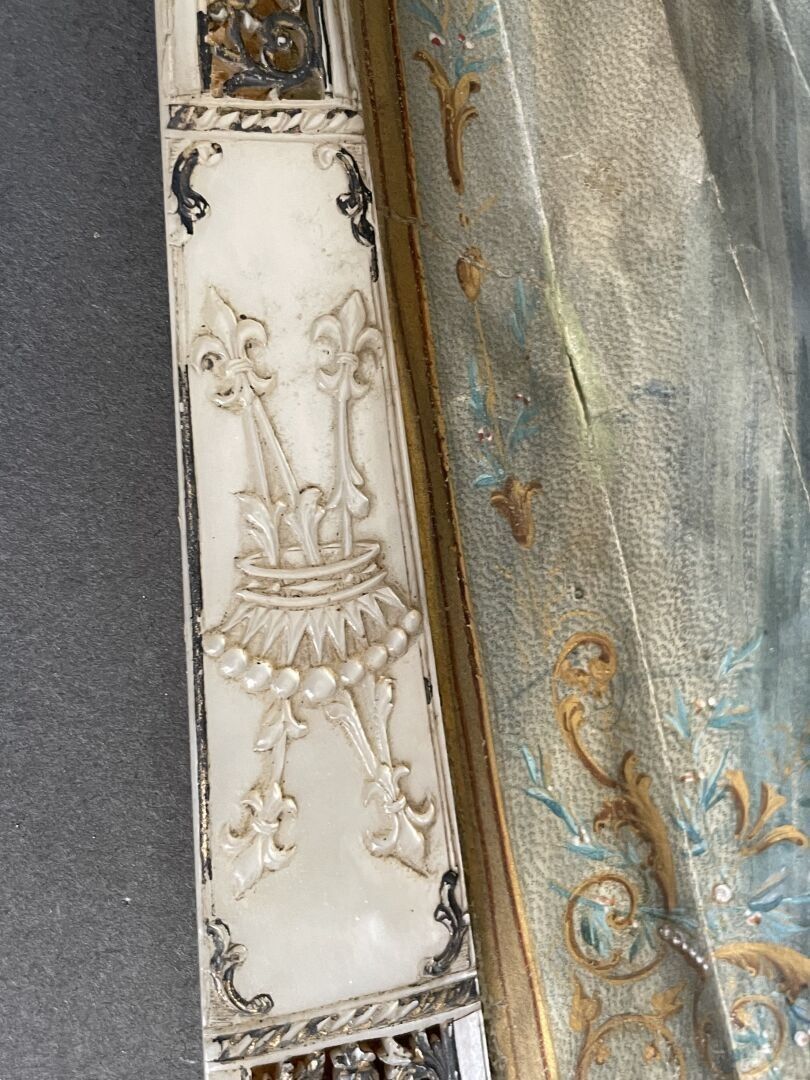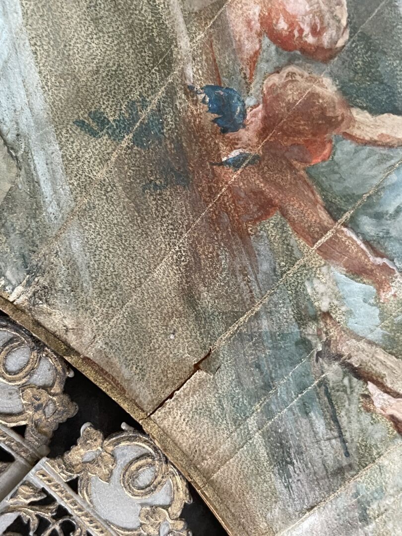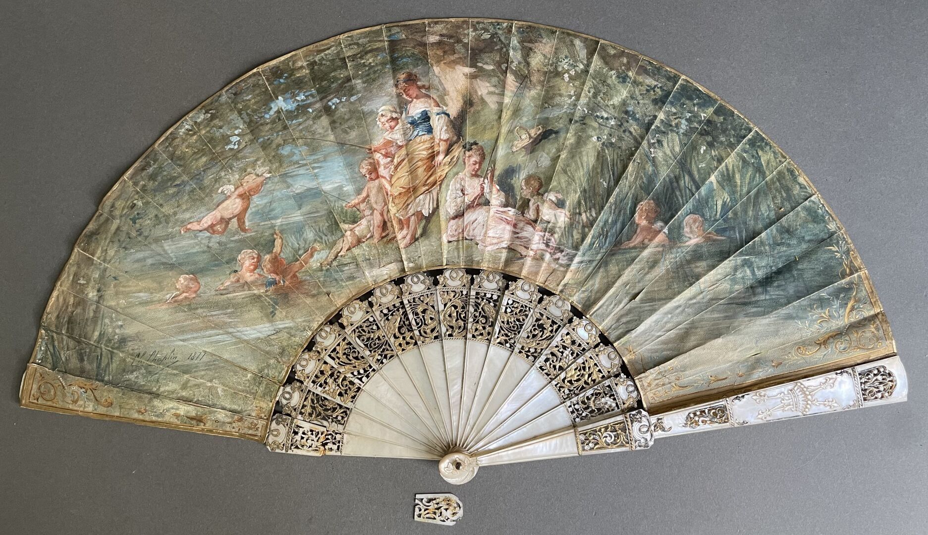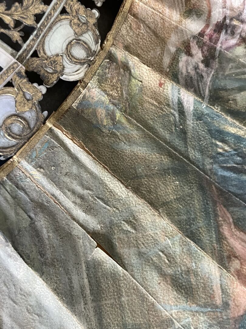 Folded fan, the double skin sheet painted with three young fisherwomen by the river, surrounded by numerous sweethearts.