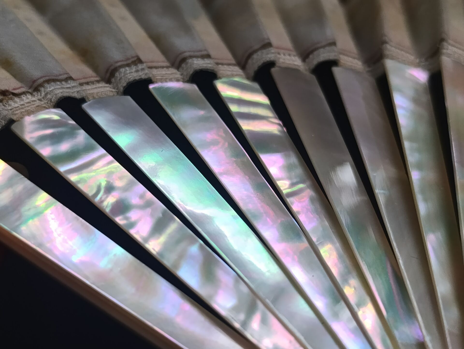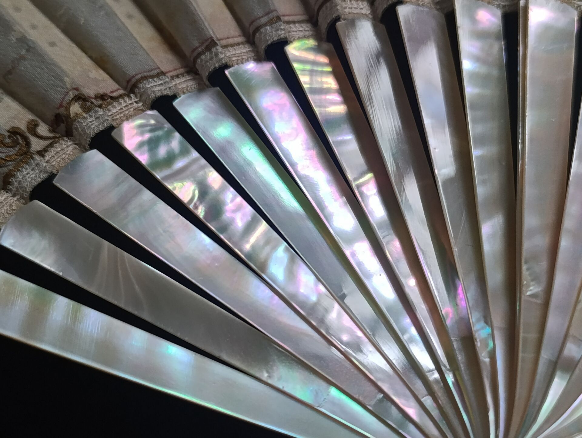 Mounted in burgau mother-of-pearl. Silver-plated metal clasp.