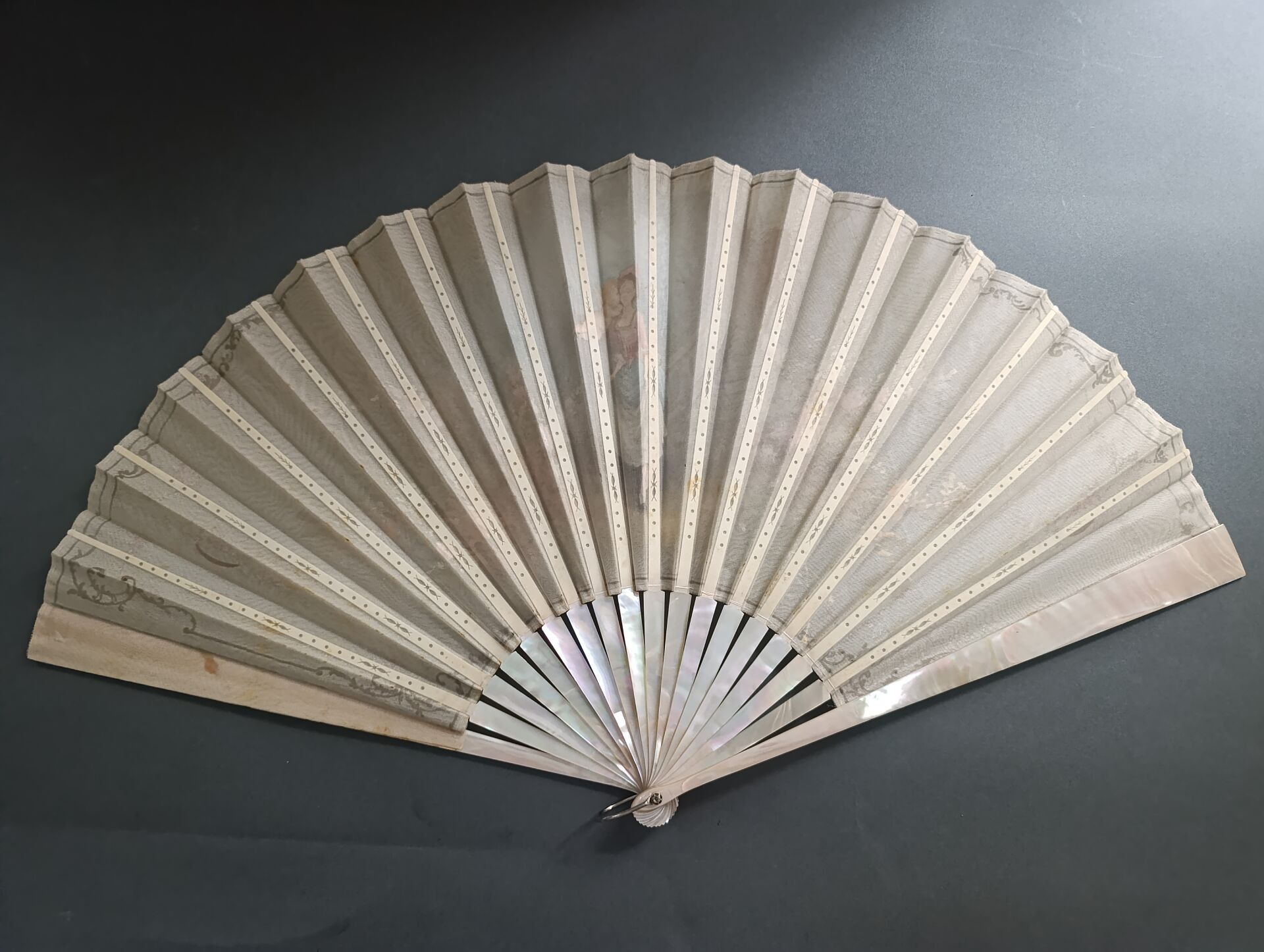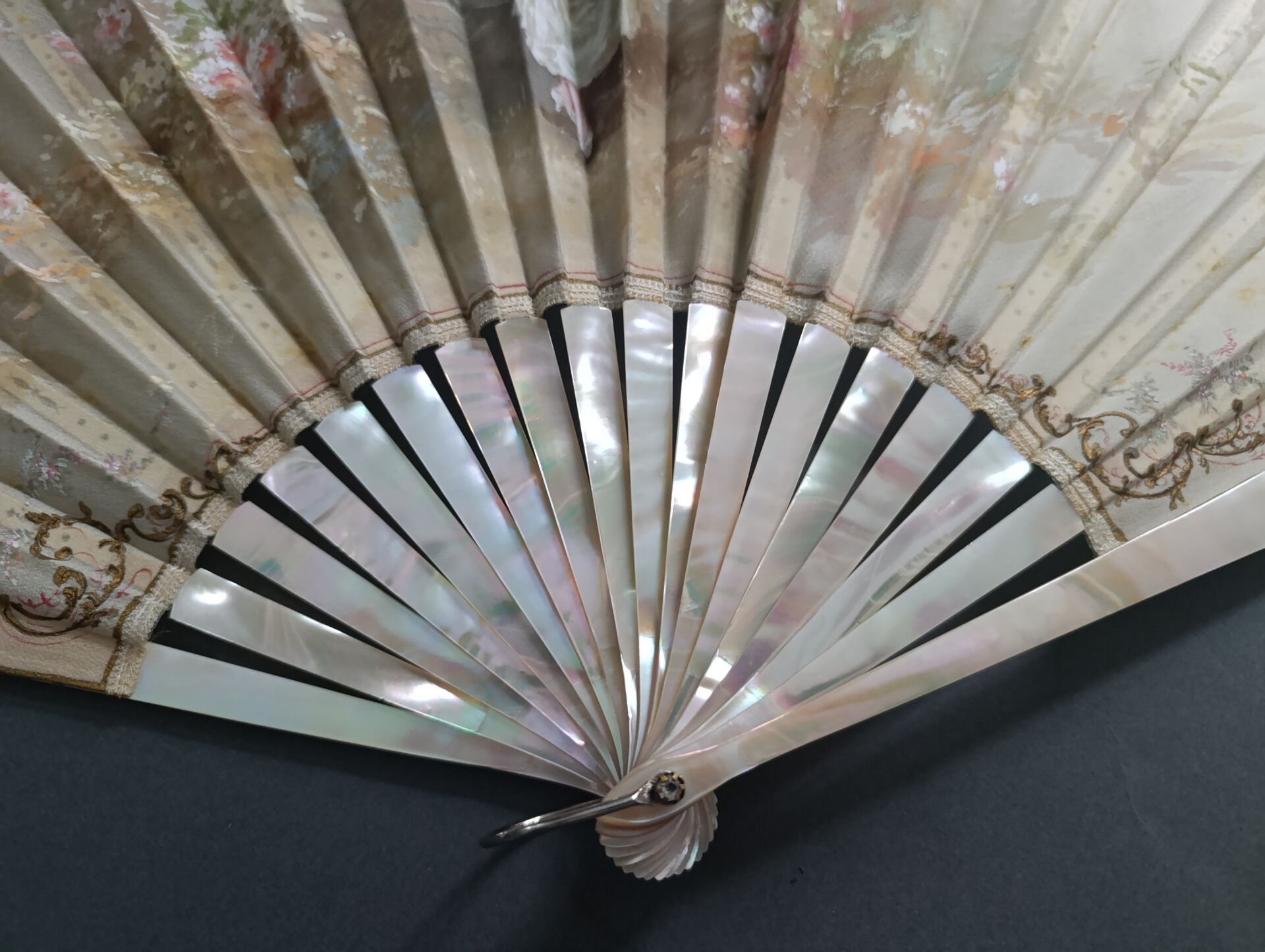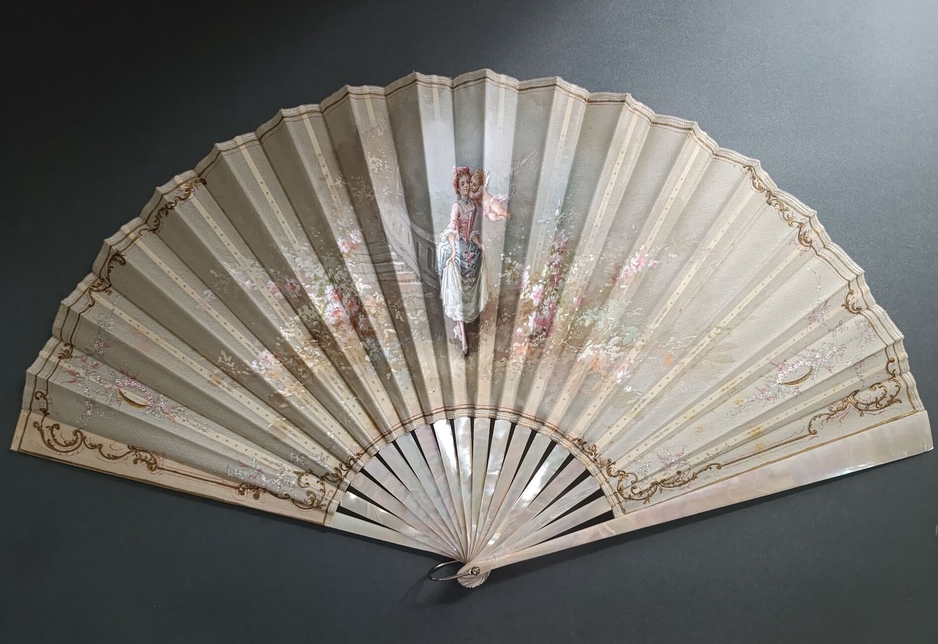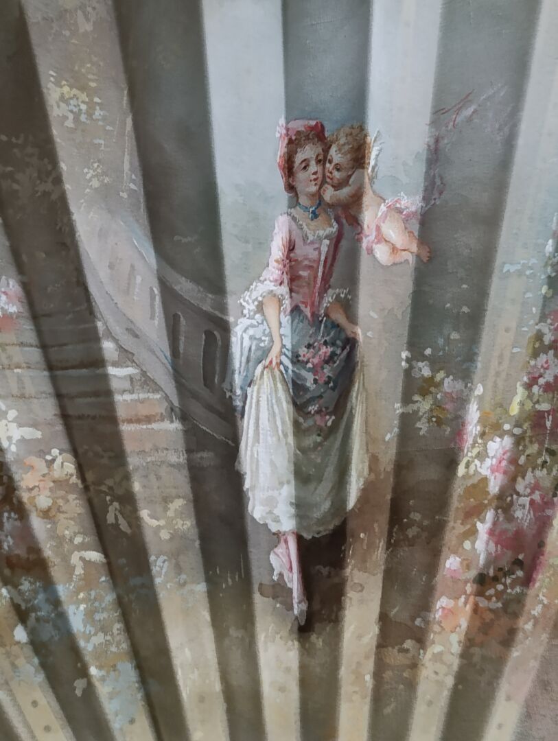 Folded fan, the double gauze sheet painted in gouache with a love whispering in the ear of a young flower girl, among two large flowering bushes.