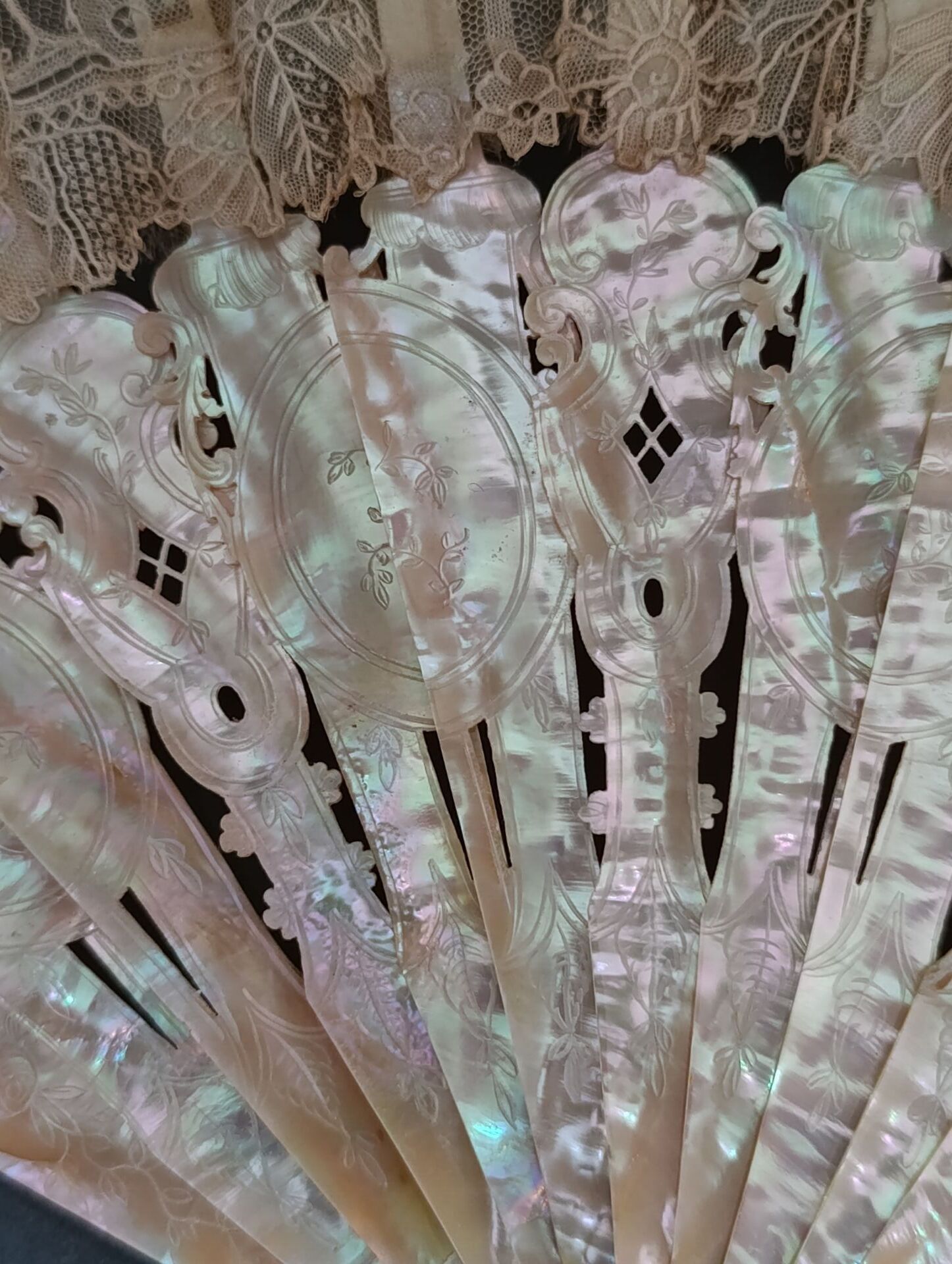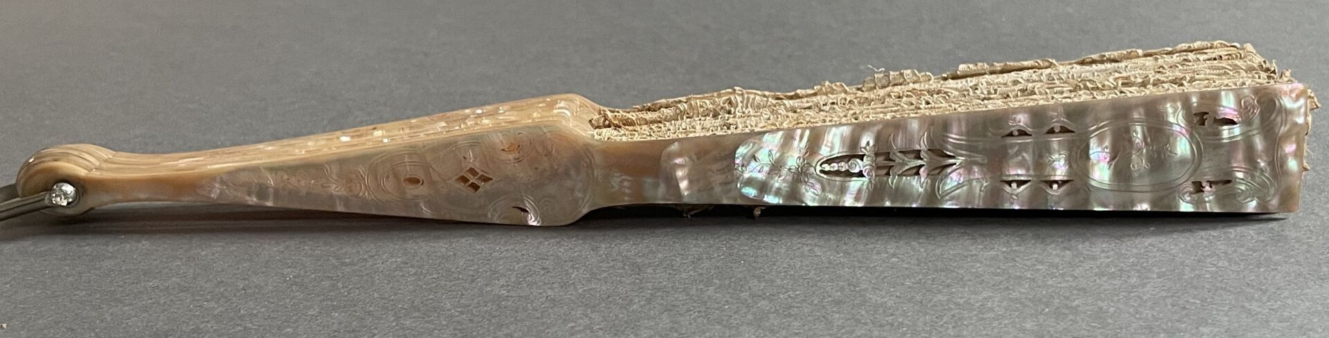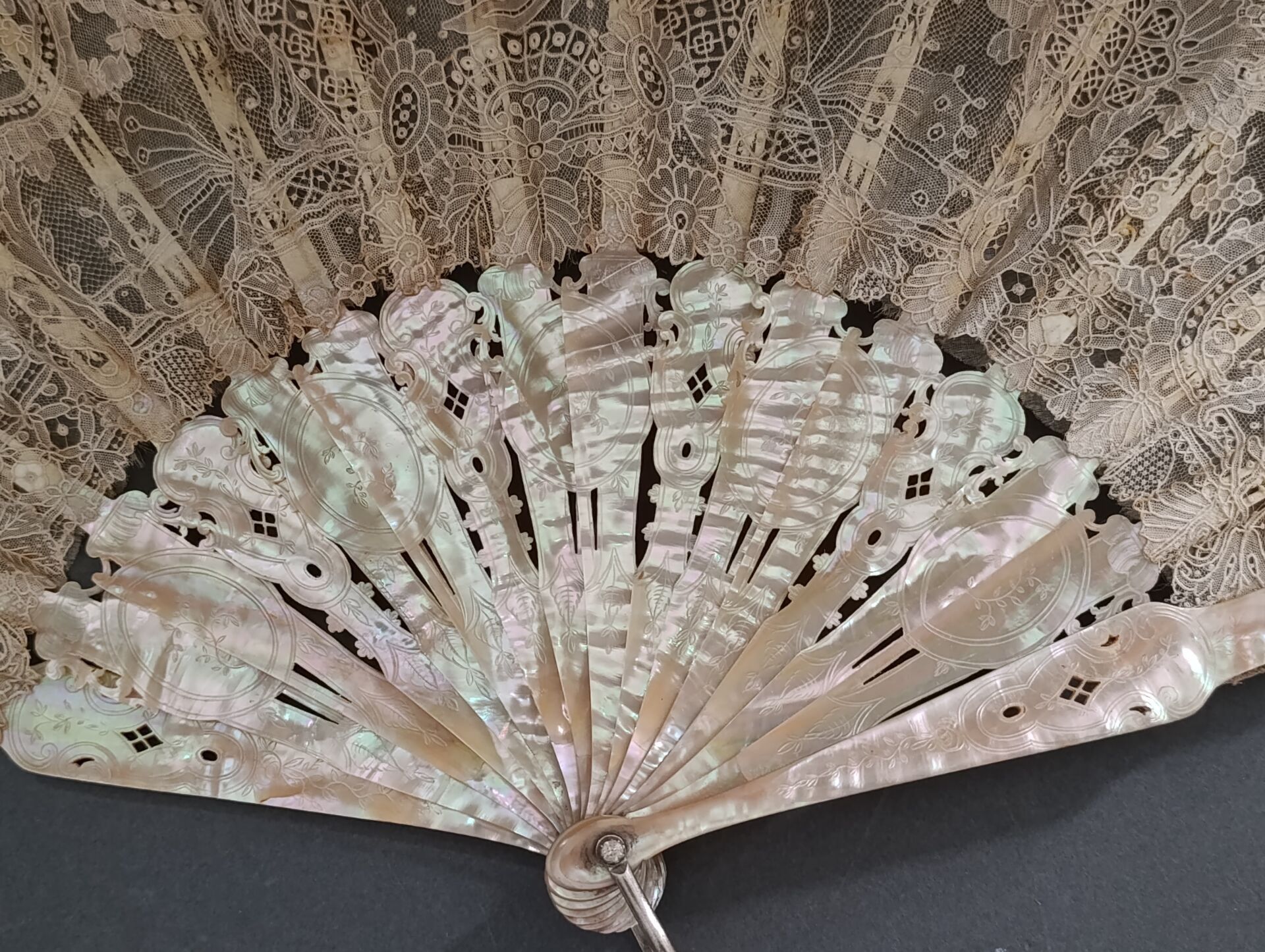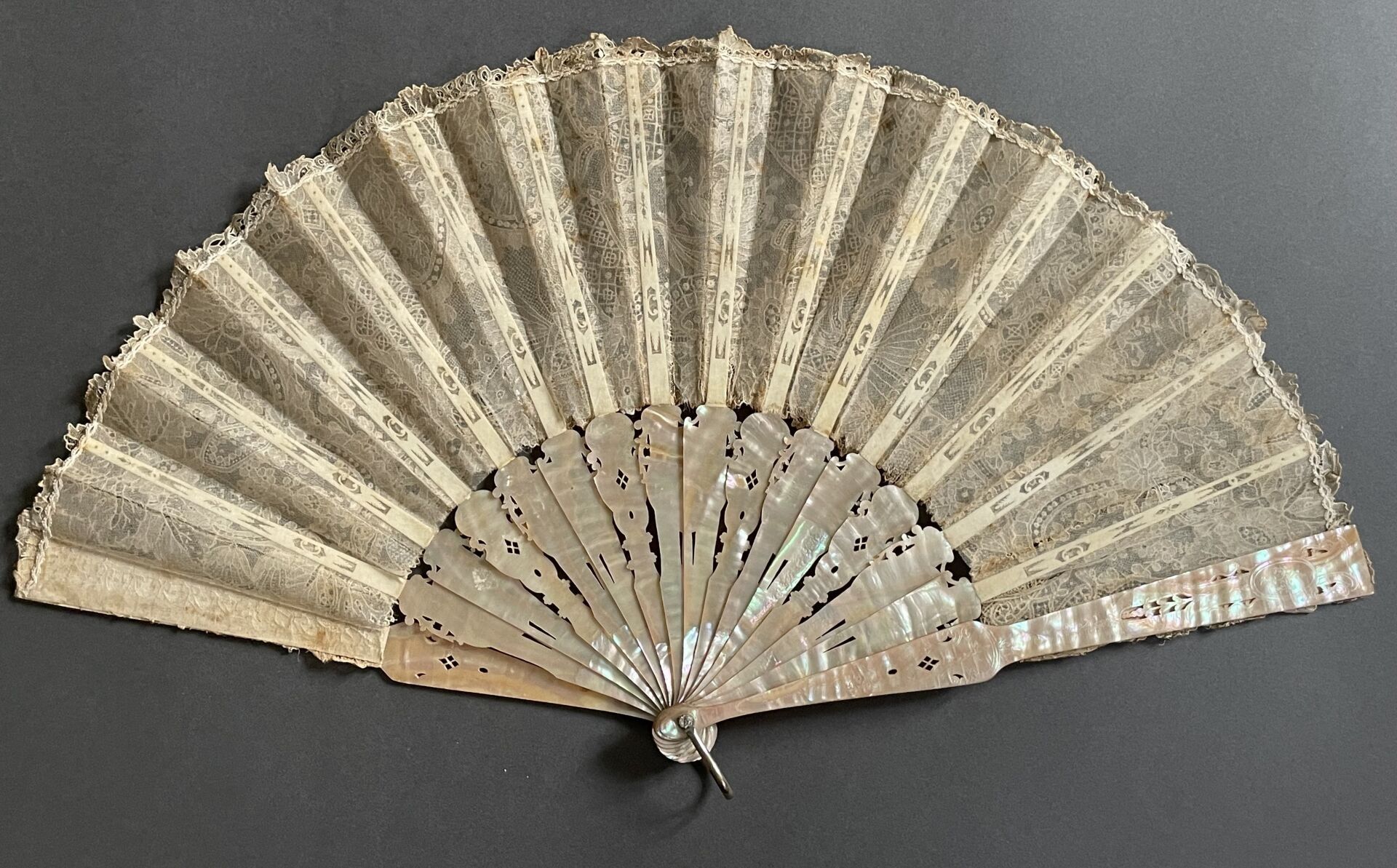 Original folded fan, the leaf in needle lace with various motifs and patterns, combining ribbons and pagoda roofs, and decorated with two butterflies and flowers.