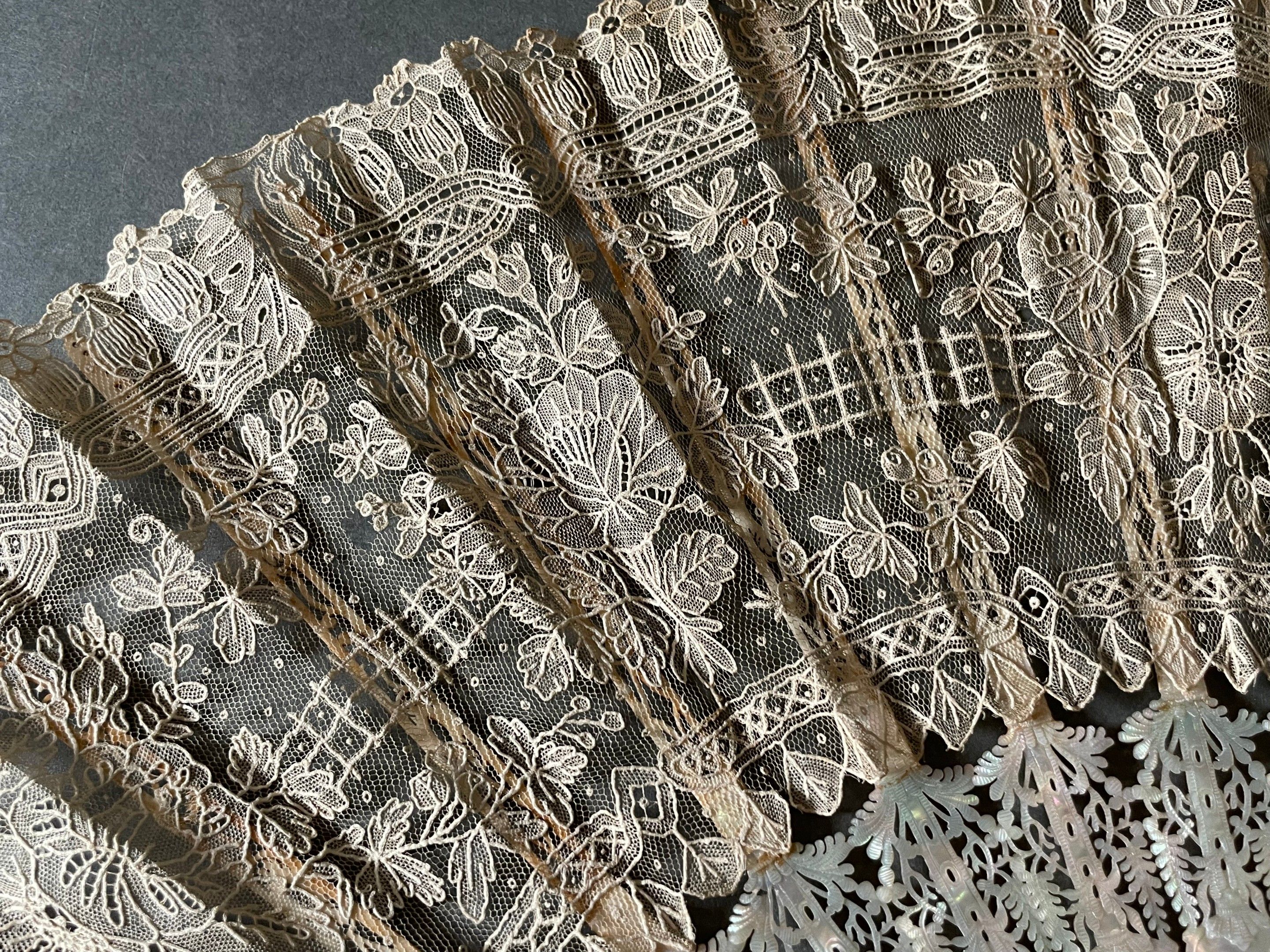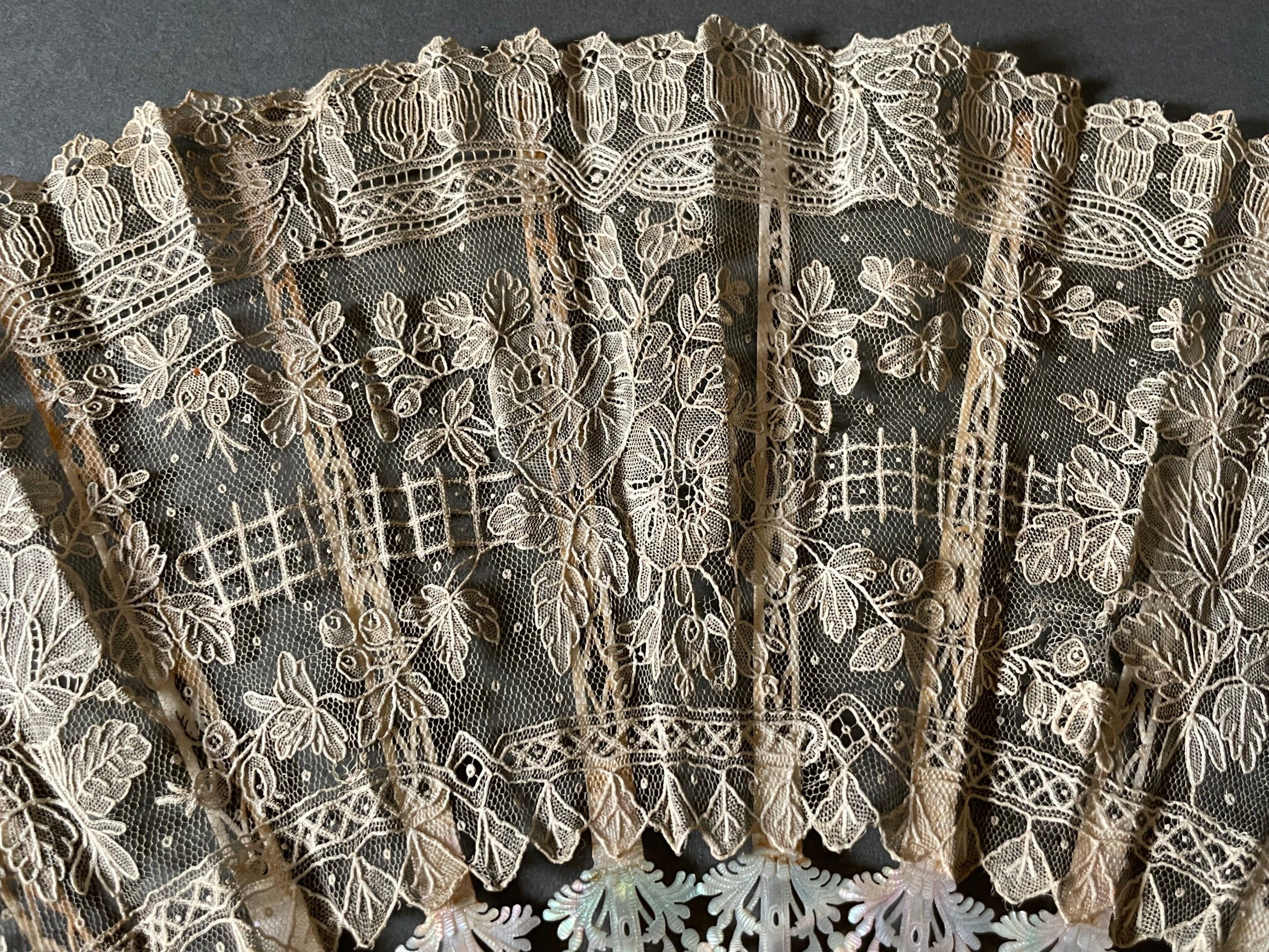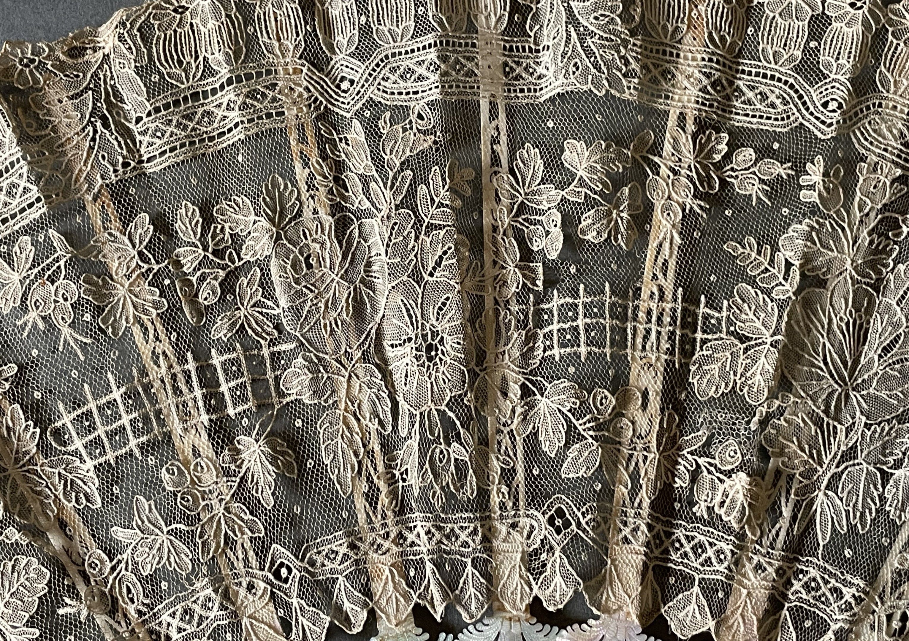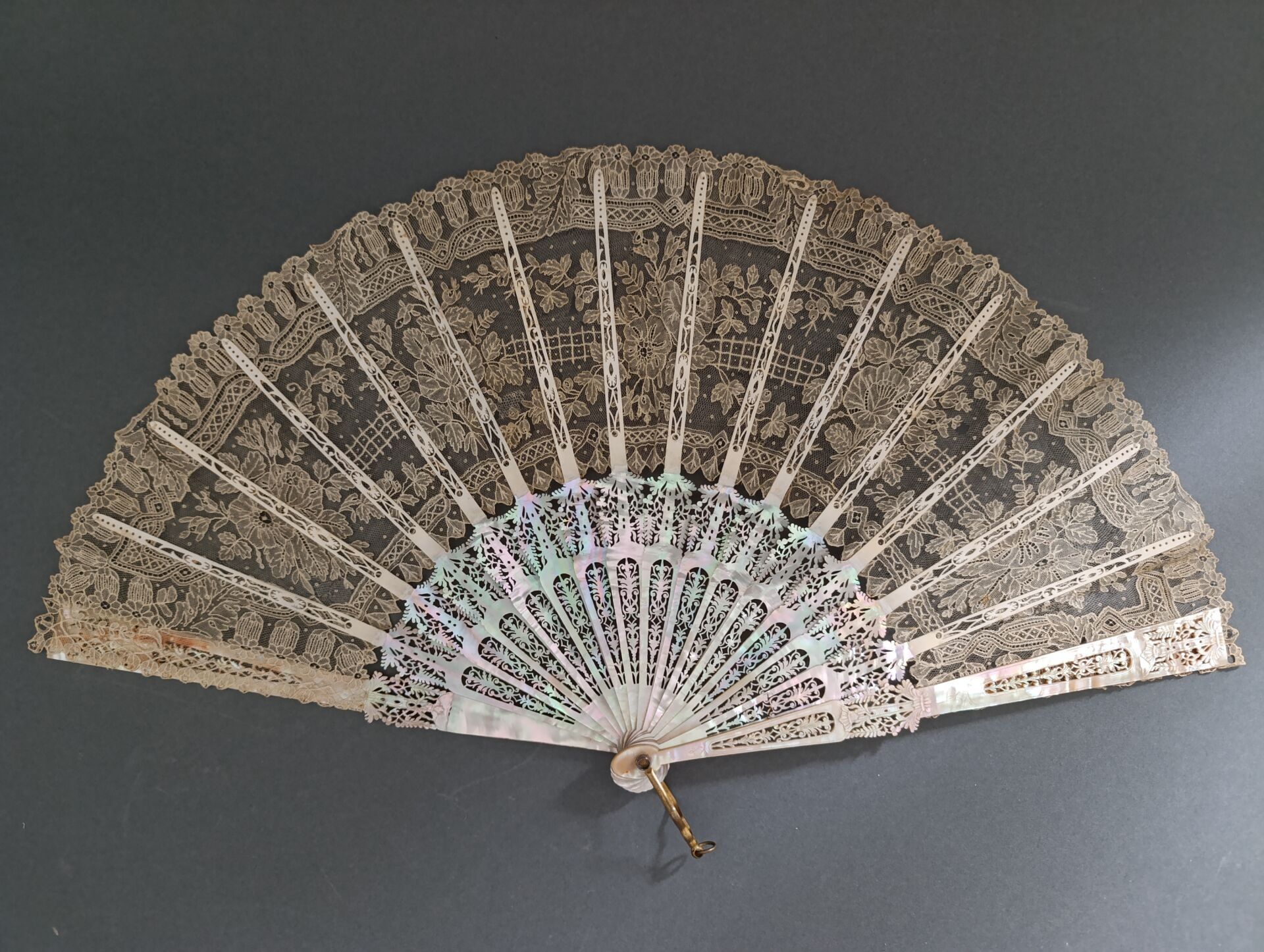 Folded fan, the needle lace leaf decorated with five bunches of flowers punctuating a barrier.
