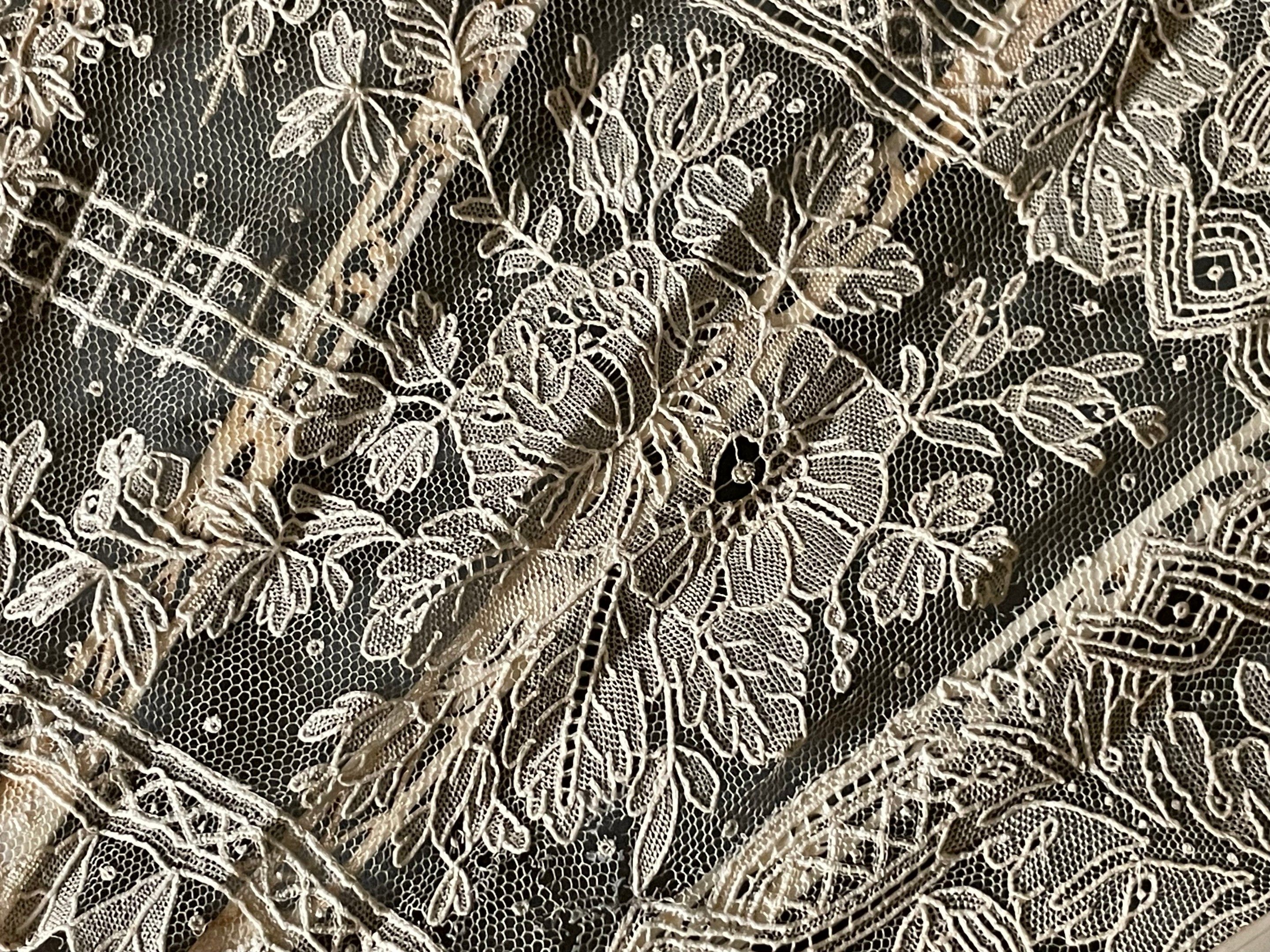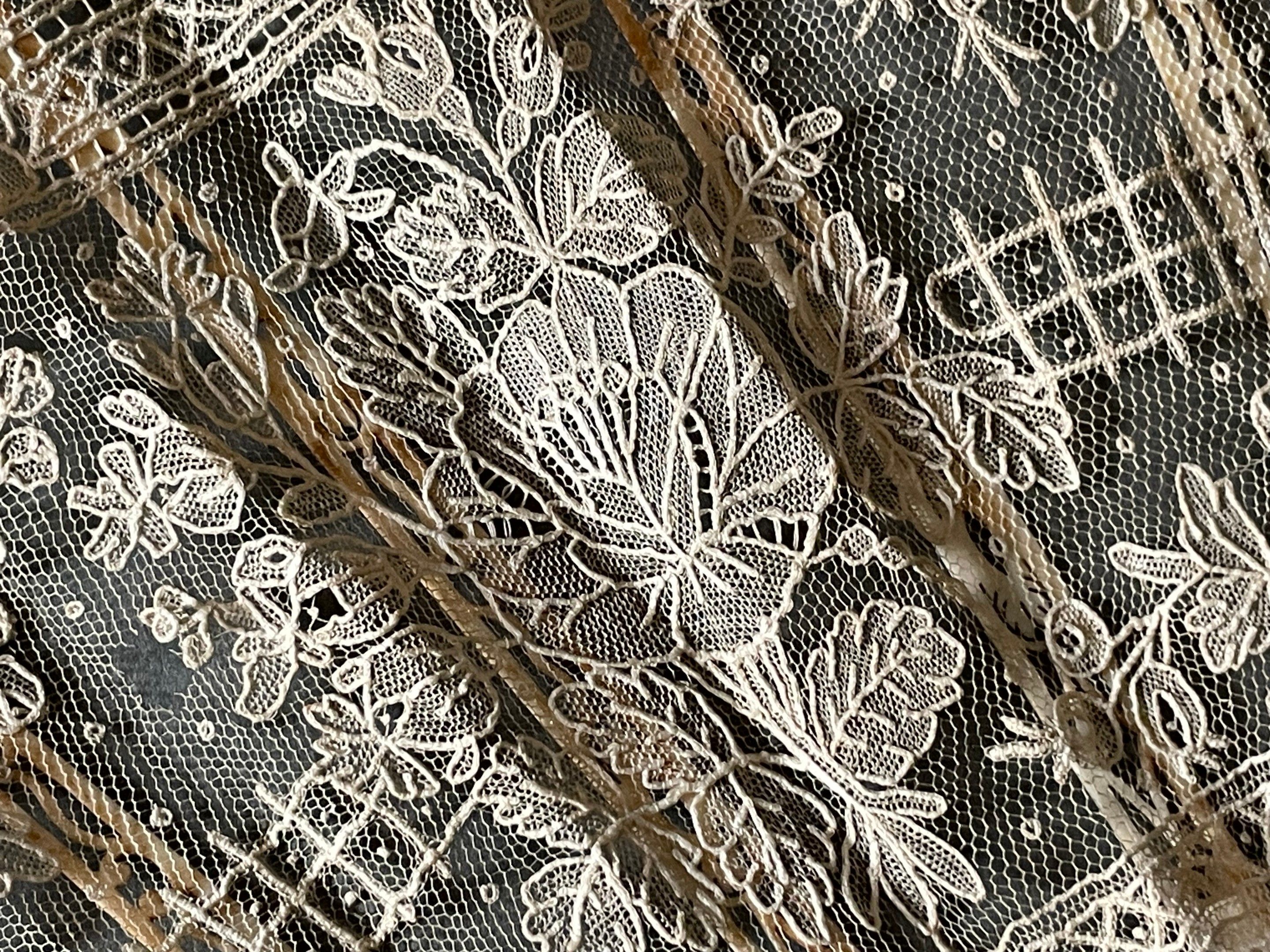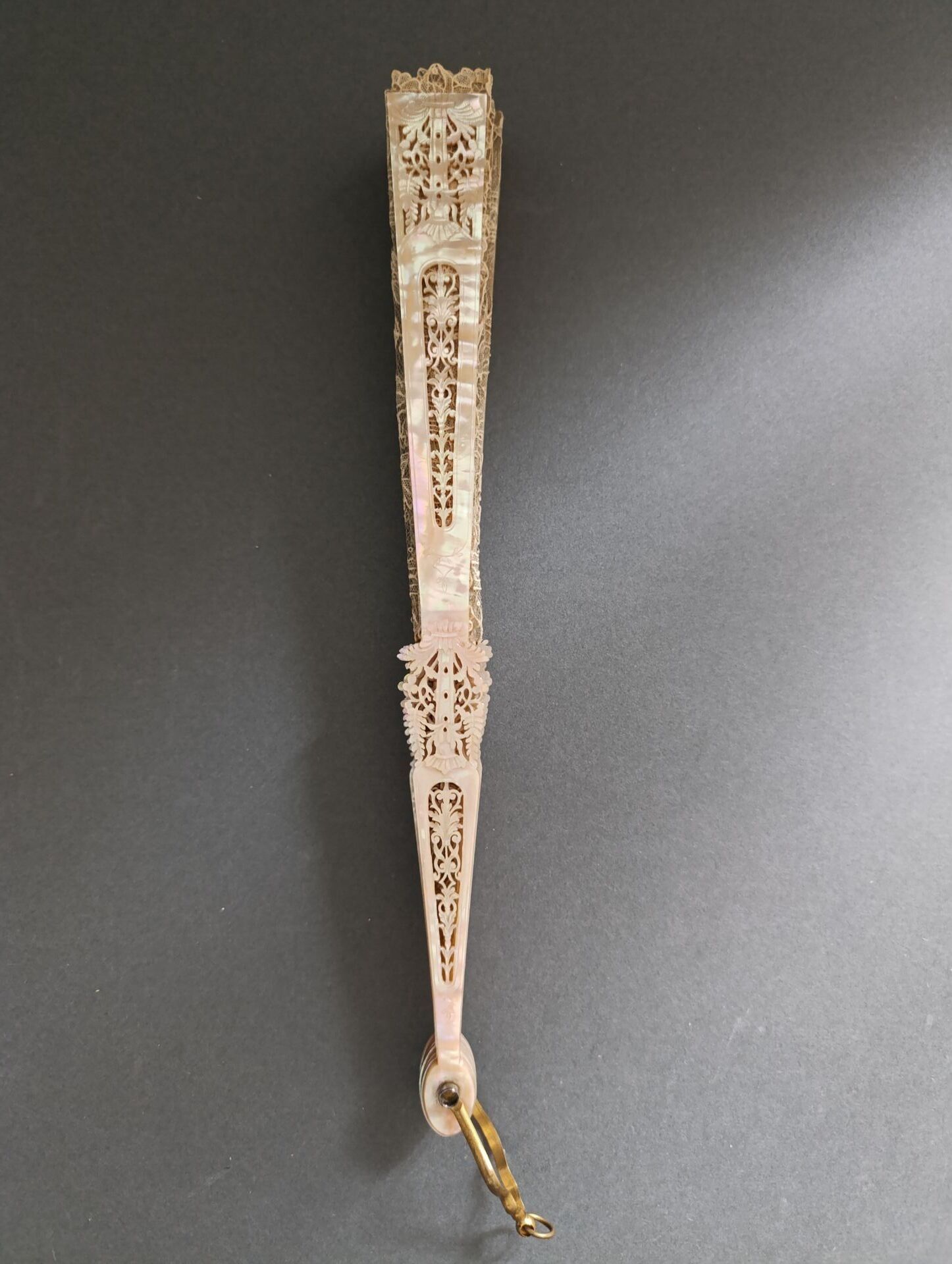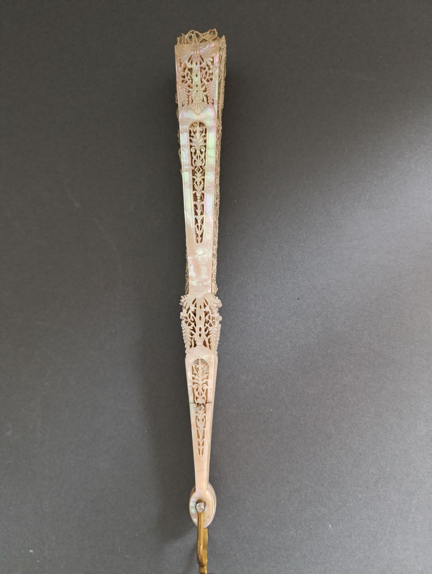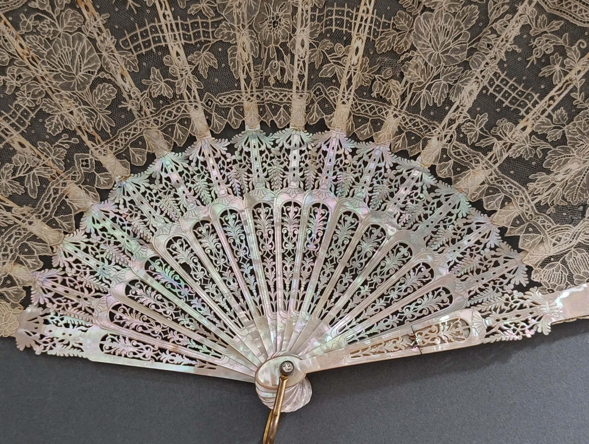 Folded fan, the needle lace leaf decorated with five bunches of flowers punctuating a barrier.