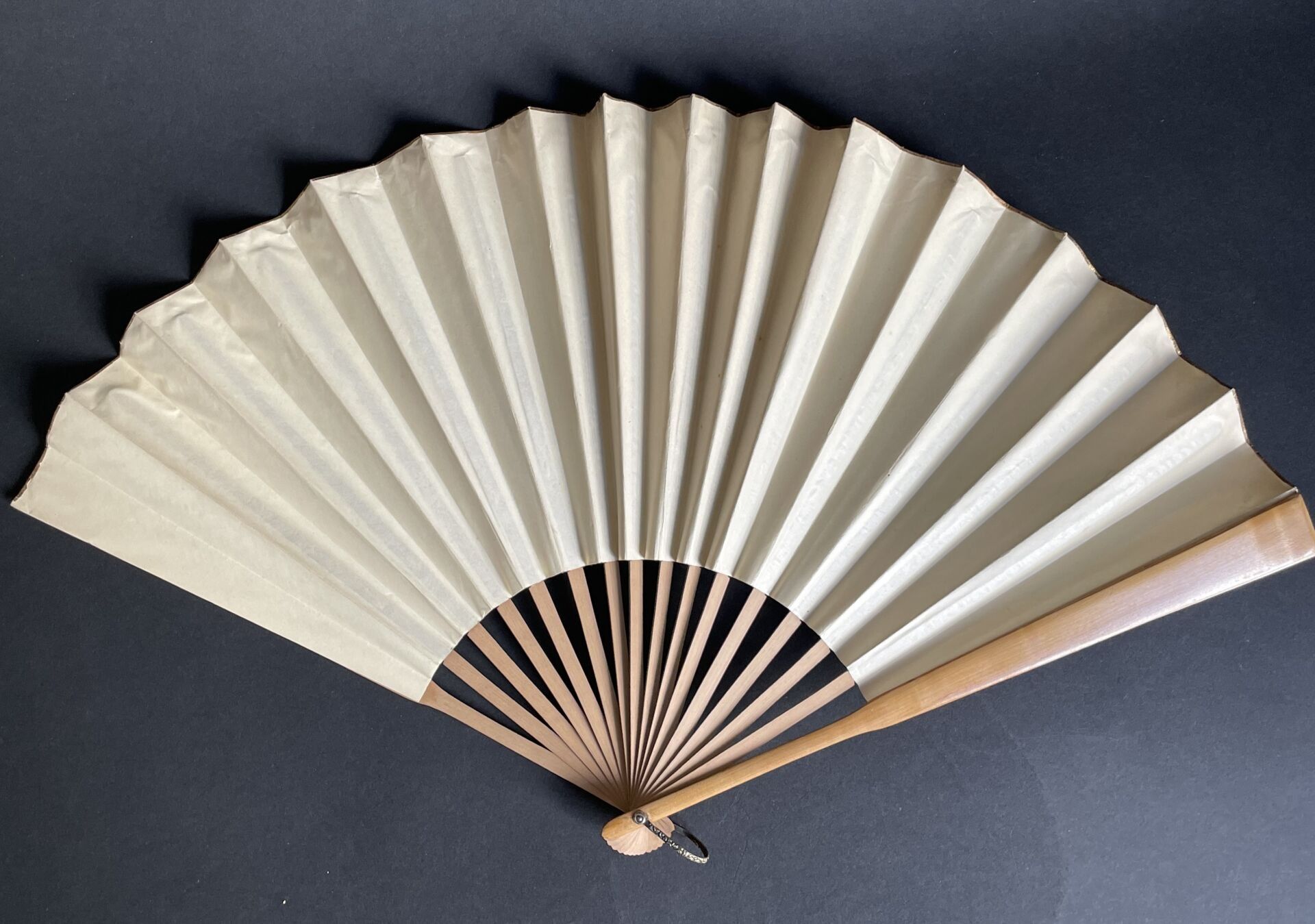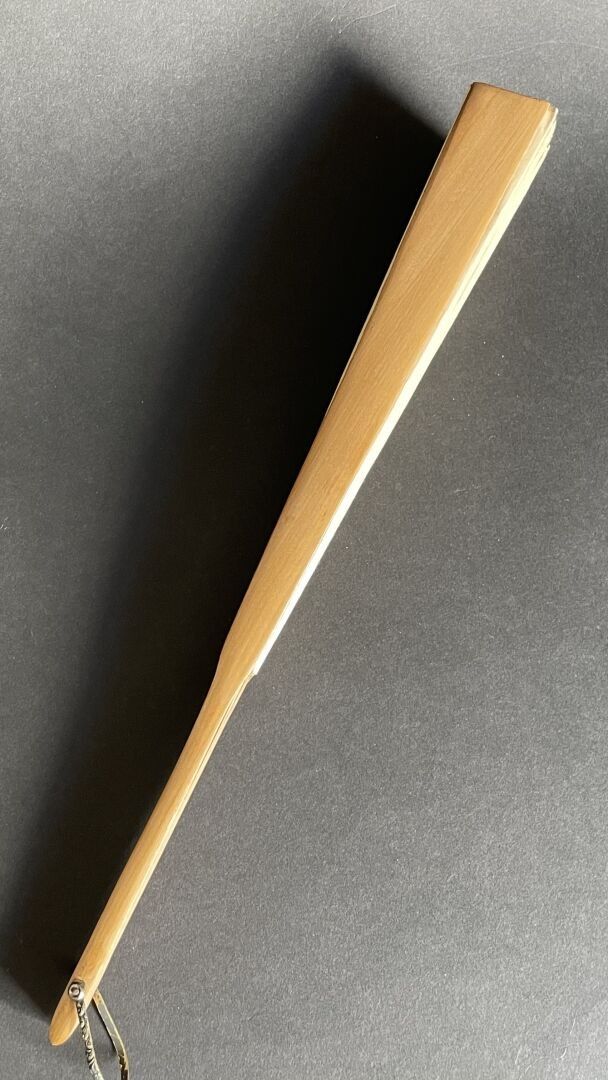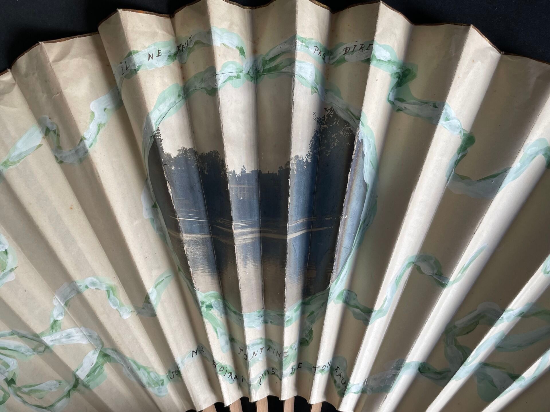 Folded fan, the double sheet of paper decorated in the centre with a black and white photograph of a château.