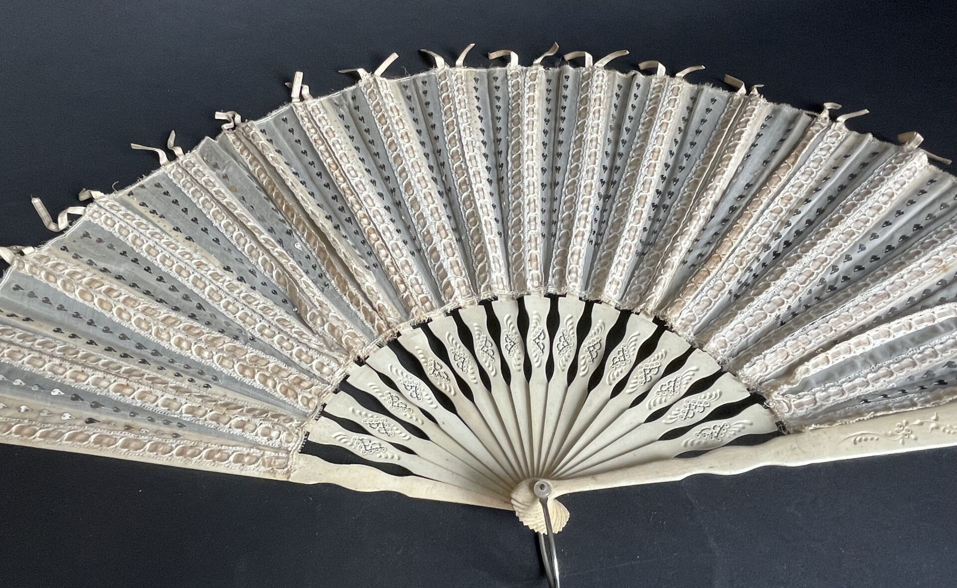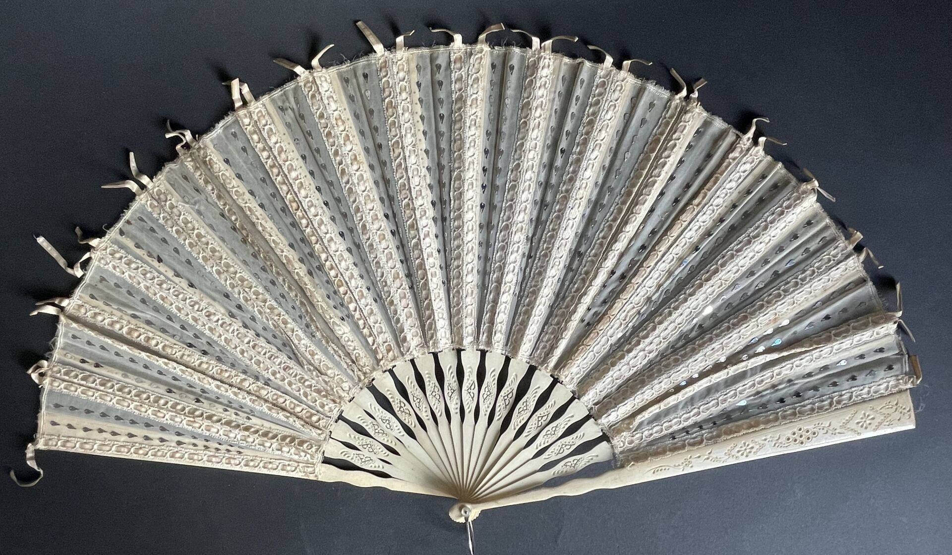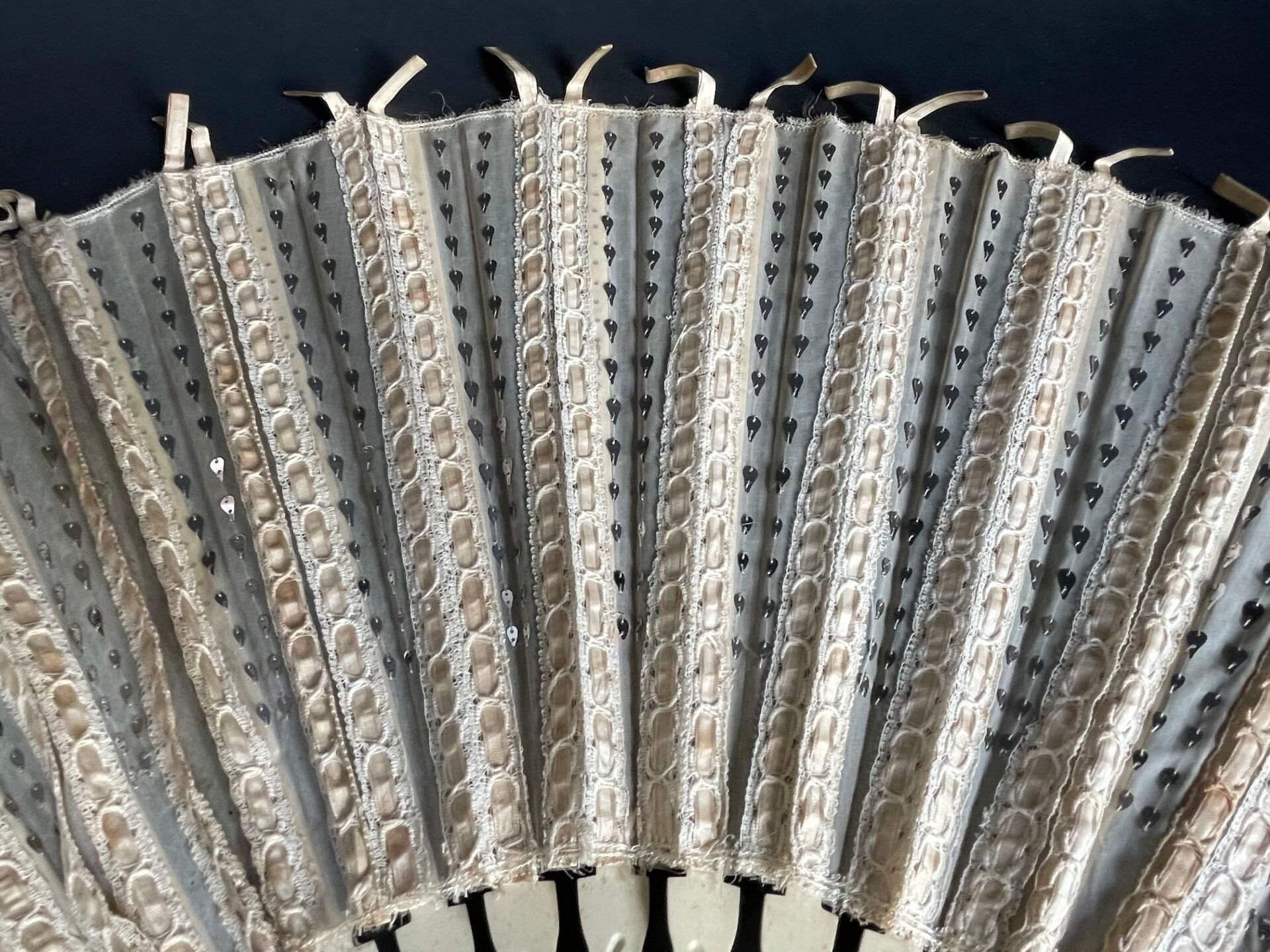 Folded fan, the gauze sheet sewn with drop sequins and ribbons evoking the lacing of a corset.